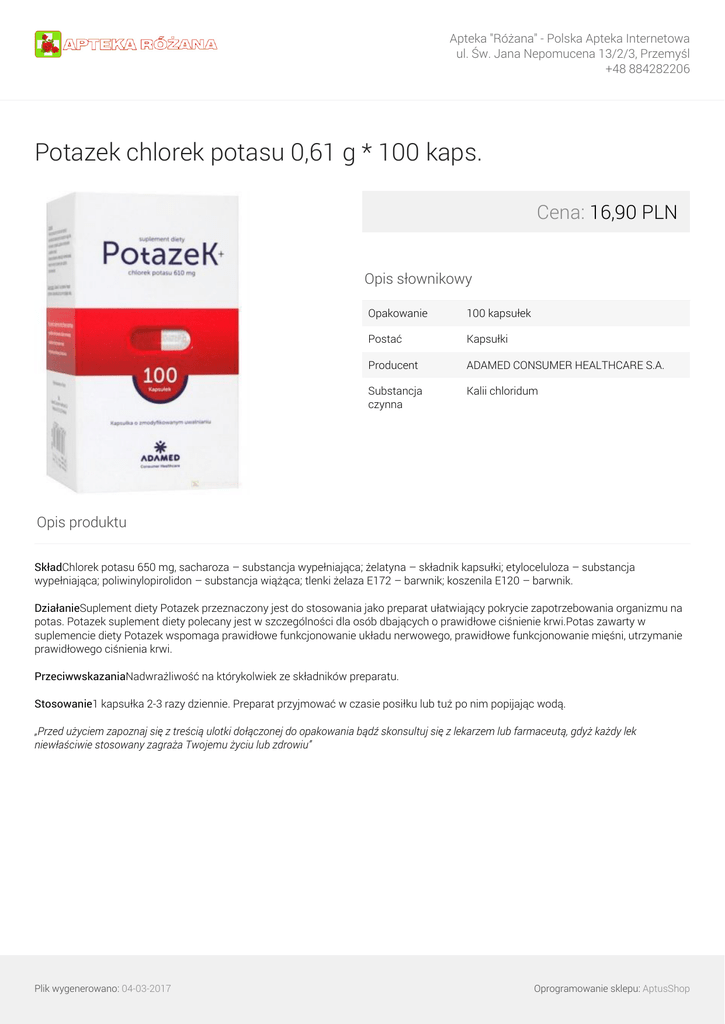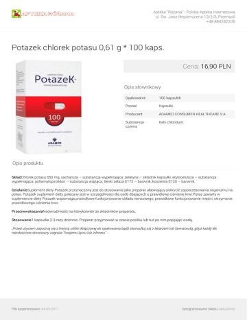 Apteka "Różana" - Polska Apteka Internetowa ul. Św. Jana Nepomucena 13/2/3, Przemyśl +48 884282206 Potazek chlorek potasu 0,61 g * 100 kaps. Cena: 16,90 PLN Opis słownikowy Opakowanie 100 kapsułek Postać Kapsułki Producent ADAMED CONSUMER HEALTHCARE S.A. Substancja czynna Kalii chloridum Opis produktu SkładChlorek potasu 650 mg, sacharoza – substancja wypełniająca; żelatyna – składnik kapsułki; etyloceluloza – substancja wypełniająca; poliwinylopirolidon – substancja wiążąca; tlenki żelaza E172 – barwnik; koszenila E120 – barwnik. DziałanieSuplement diety Potazek przeznaczony jest do stosowania jako preparat ułatwiający pokrycie zapotrzebowania organizmu na potas. Potazek suplement diety polecany jest w szczególności dla osób dbających o prawidłowe ciśnienie krwi.Potas zawarty w suplemencie diety Potazek wspomaga prawidłowe funkcjonowanie układu nerwowego, prawidłowe funkcjonowanie mięśni, utrzymanie prawidłowego ciśnienia krwi. PrzeciwwskazaniaNadwrażliwość na którykolwiek ze składników preparatu. Stosowanie1 kapsułka 2-3 razy dziennie. Preparat przyjmować w czasie posiłku lub tuż po nim popijając wodą. „Przed użyciem zapoznaj się z treścią ulotki dołączonej do opakowania bądź skonsultuj się z lekarzem lub farmaceutą, gdyż każdy lek niewłaściwie stosowany zagraża Twojemu życiu lub zdrowiu” Plik wygenerowano: 04-03-2017 Powered by TCPDF (www.tcpdf.org) Oprogramowanie sklepu: AptusShop