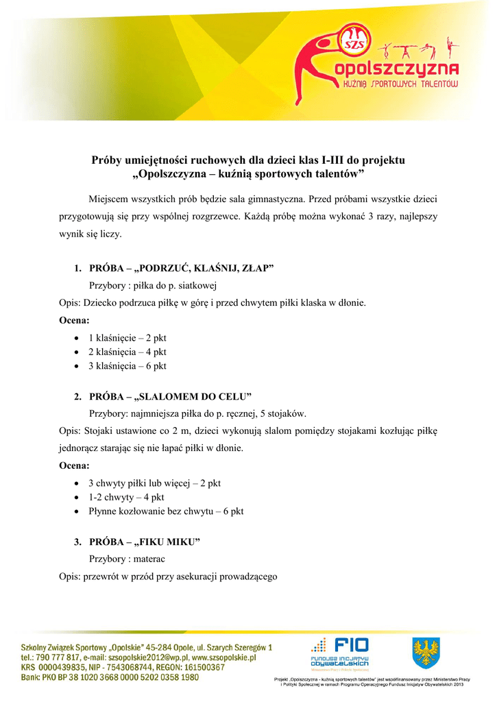 Próby umiejętności ruchowych dla dzieci klas I-III do projektu „Opolszczyzna – kuźnią sportowych talentów” Miejscem wszystkich prób będzie sala gimnastyczna. Przed próbami wszystkie dzieci przygotowują się przy wspólnej rozgrzewce. Każdą próbę można wykonać 3 razy, najlepszy wynik się liczy. 1. PRÓBA – „PODRZUĆ, KLAŚNIJ, ZŁAP” Przybory : piłka do p. siatkowej Opis: Dziecko podrzuca piłkę w górę i przed chwytem piłki klaska w dłonie. Ocena: 1 klaśnięcie – 2 pkt 2 klaśnięcia – 4 pkt 3 klaśnięcia – 6 pkt 2. PRÓBA – „SLALOMEM DO CELU” Przybory: najmniejsza piłka do p. ręcznej, 5 stojaków. Opis: Stojaki ustawione co 2 m, dzieci wykonują slalom pomiędzy stojakami kozłując piłkę jednorącz starając się nie łapać piłki w dłonie. Ocena: 3 chwyty piłki lub więcej – 2 pkt 1-2 chwyty – 4 pkt Płynne kozłowanie bez chwytu – 6 pkt 3. PRÓBA – „FIKU MIKU” Przybory : materac Opis: przewrót w przód przy asekuracji prowadzącego Ocena: Przetoczenie po materacu – 2 pkt Przewrót z przysiadu do siadu – 4 pkt Przewrót ze stania do przysiadu – 6 pkt 4. PRÓBA – „HOP W GÓRĘ” Przybory : skakanka Opis: dzieci w dowolny sposób przeskakują skakankę. Ocena: 3 przeskoki – 2 pkt 6 przeskoków – 4 pkt 9 i więcej – 6 pkt 5. PRÓBA – „SZCZĘŚLIWIE DO CELU” Przybory : 5 woreczków , małe hula – hop Opis: W odległości 4 m od położonego hula hop dzieci rzucają do środka woreczki. Ocena : woreczek celnie – 2 pkt 2-3 woreczki celnie – 4 pkt 4-5 woreczków celnie – 6 pkt 6. PRÓBA – „ODWAŻNIE – NIE UPADNIJ” Przybory: odwrócona ławeczka-równoważnia Opis: dzieci wchodzą na ławeczkę, przechodzą po równoważni przy każdym kroku wspinając się na palce i unosząc ugiętą nogę w kolanie z obciągniętymi palcami stóp ( przynajmniej 5 kroków) Ocena: Przejście całej długości z 2 lub więcej podparciami – 2 pkt Z jednym podparciem – 4 pkt Bez podparcia – 6 pkt