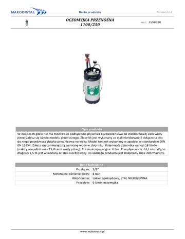 Strona 1 z 2 Karta produktu OCZOMYJKA PRZENOŚNA 1100/250 kod: 1100/250 Opis produktu W miejscach gdzie nie ma możliwości podłączenia prysznica bezpieczeństwa do standardowej sieci wody pitnej zaleca się użycie modelu przenośnego. Zbiornik jest wykonany ze stali nierdzewnej i dołączona jest do niego pojedyncza główka prysznicowa na wężu. Model ten jest wykonany w zgodzie ze standardem DIN EN 15154. Zaleca się comiesięczną wymianę wody w zbiorniku. Pojemność zbiornika wynosi 18 litrów (należy uzupełnić max 15 litrami wody pitnej). Ciśnienie operacyjne: 6 bar. Przepływ wody: 6 l / min. Wąż o długości 1,5 m jest wykonany ze stali nierdzewnej. Do każdego produktu jest dołączony znak informacyjny. Dane techniczne Przyłącze: 3/8” Minimalne ciśnienie wody: 6 bar Wkończenie: Lakier epoksydowy, STAL NIERDZEWNA Przepływ: 6 l/min oczomyjka www.makoinstal.pl Karta produktu OCZOMYJKA PRZENOŚNA 1100/250 www.makoinstal.pl Strona 2 z 2 kod: 1100/250