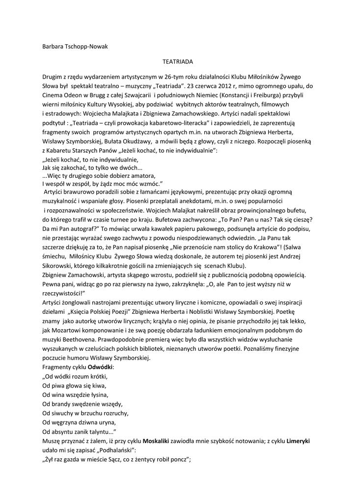 Barbara Tschopp-Nowak TEATRIADA Drugim z rzędu wydarzeniem artystycznym w 26-tym roku działalności Klubu Miłośników Żywego Słowa był spektakl teatralno – muzyczny „Teatriada”. 23 czerwca 2012 r, mimo ogromnego upału, do Cinema Odeon w Brugg z całej Szwajcarii i południowych Niemiec (Konstancji i Freiburga) przybyli wierni miłośnicy Kultury Wysokiej, aby podziwiać wybitnych aktor w teatralnych, filmowych i estradowych: Wojciecha Malajkata i Zbigniewa Zamachowskiego. Artyści nadali spektaklowi podtytuł : „Teatriada – czyli prowokacja kabaretowo-literacka” i zapowiedzieli, że zaprezentują fragmenty swoich programów artystycznych opartych m.in. na utworach Zbigniewa Herberta, Wisławy Szymborskiej, Bułata Okudżawy, a m wili będą z głowy, czyli z niczego. Rozpoczęli piosenką z Kabaretu Starszych Panów „Jeżeli kochać, to nie indywidualnie”: „Jeżeli kochać, to nie indywidualnie, Jak się zakochać, to tylko we dw ch... ...Więc ty drugiego sobie dobierz amatora, I wesp ł w zesp ł, by żądz moc m c wzm c.” Artyści brawurowo poradzili sobie z łamańcami językowymi, prezentując przy okazji ogromną muzykalność i wspaniałe głosy. Piosenki przeplatali anekdotami, m.in. o swej popularności i rozpoznawalności w społeczeństwie. Wojciech Malajkat nakreślił obraz prowincjonalnego bufetu, do kt rego trafił w czasie turnee po kraju. Bufetowa zachwycona: „To Pan? Pan u nas? Tak się cieszę? Da mi Pan autograf?” To m wiąc urwała kawałek papieru pakowego, podsunęła artyście do podpisu, nie przestając wyrażać swego zachwytu z powodu niespodziewanych odwiedzin. „Ja Panu tak szczerze dziękuję za to, że Pan napisał piosenkę „Nie przenoście nam stolicy do Krakowa”! (Salwa śmiechu, Miłośnicy Klubu Żywego Słowa wiedzą doskonale, że autorem tej piosenki jest Andrzej Sikorowski, którego kilkakrotnie gościli na zmieniających się scenach Klubu). Zbigniew Zamachowski, artysta skąpego wzrostu, podzielił się z publicznością podobną opowieścią. Pewna pani, widząc go po raz pierwszy na żywo, zakrzyknęła: „O, ale Pan to jest wyższy niż w rzeczywistości!” Artyści żonglowali nastrojami prezentując utwory liryczne i komiczne, opowiadali o swej inspiracji dziełami „Księcia Polskiej Poezji” Zbigniewa Herberta i Noblistki Wisławy Szymborskiej. Poetkę znamy jako autorkę utworów lirycznych; krążyła o niej opinia, że pisanie przychodziło jej tak lekko, jak Mozartowi komponowanie i że swą poezję obdarzała ładunkiem emocjonalnym podobnym do muzyki Beethovena. Prawdopodobnie premierą więc było dla wszystkich widz w wysłuchanie wyszukanych w czeluściach polskich bibliotek, nieznanych utwor w poetki. Poznaliśmy finezyjne poczucie humoru Wisławy Szymborskiej. Fragmenty cyklu Odwódki: „Od w dki rozum kr tki, Od piwa głowa się kiwa, Od wina wszędzie łysina, Od brandy swędzenie wszędy, Od siwuchy w brzuchu rozruchy, Od węgrzyna dziwna uryna, Od absyntu zanik talyntu...” Muszę przyznać z żalem, iż przy cyklu Moskaliki zawiodła mnie szybkość notowania; z cyklu Limeryki udało mi się zapisać „Podhalański”: „Żył raz gazda w mieście Sącz, co z żentycy robił poncz”; oraz „Chiński”: „Był raz działacz imieniem Mao, co narozrabiał niemao” a z cyklu Altruitki następujące cztery: „Oszczędzając pracę żony, jedz gotowe makarony, Oszczędzając trud kochanki, pij herbatę z brudnej szklanki, Oszczędzając trud buldoga, sam za niego podnoś noga, Oszczędzając trud kr licy, sam się rozmn ż w kamienicy” Za to przytaczam obszerne fragmenty anty-ody do restauracji, w kt rej poetka znalazła dopisek niezadowolonego klienta w karcie dań „nie brać, niedobre”: „Lepiej złamać obie nogi, niźli tutaj zjeść pierogi, Lepiej nająć się na hycla, niż napocząć tego sznycla, Lepszy piorun na Nosalu, niż pulpety w tym lokalu, Lepsza w domu świekra z zezem, niż tu jajko z majonezem, Lepsze dziecko z wodogłowiem, niż tu m żdżek, że tak powiem, Lepszą będziesz mieć karnację, jeśli w domu zjesz kolację”. Zbigniew Zamachowski wystąpił r wnież jako śpiewak ludowy lat 102, kt ry z zaangażowaniem wyśpiewał historię „Fartuska do grusk w” oraz nieposłusznych: kozy, psa, kija, ognia, wody i wołu, kt ry spowodował, iż gruszki wreszcie zostały utrzęsione. No i w ten spos b dowiedziałam się, że wierszyk, kt ry zna każde szwajcarskie dziecko „Joggeli wot go Birrli schüttle” ma swój odpowiednik w polskiej pieśni ludowej! Dzięki r żnorodności zaprezentowanych utworów, "TEATRIADA" zintegrowała kilka pokoleń Polak w. Spektakl został zakończony „Credo życiowym na głos męski i trzy nieskomplikowane nuty harmoniczne”. Zbigniew Zamachowski genialnie wykonał piosenkę S. Staszewskiego „Baranek” z koncertu „Zamach na MoCarta”. W refrenie, kt ry jest fragmentem II cz. „Dziad w” Adama Mickiewicza, dzielnie wspierała go wielopokoleniowa publiczność: „Na głowie kwietny ma wianek, W ręku zielony badylek, A przed nią bieży baranek, A nad nią lata motylek.” Nie mogło być inaczej, widzowie podziękowali artystom standing ovation. Chętnie by r wnież tradycyjnie pogawędzili z gośćmi i popozwali do wspólnych zdjęć ale tym razem sale recepcyjne Forum ODEON Bar przygotowywane były do następnej, konkurencyjnej imprezy -przyjęcia weselnego. Zadowoleni, że koncertu nie zakł cił żaden zabłąkany gość weselny, ustąpiliśmy im miejsca...