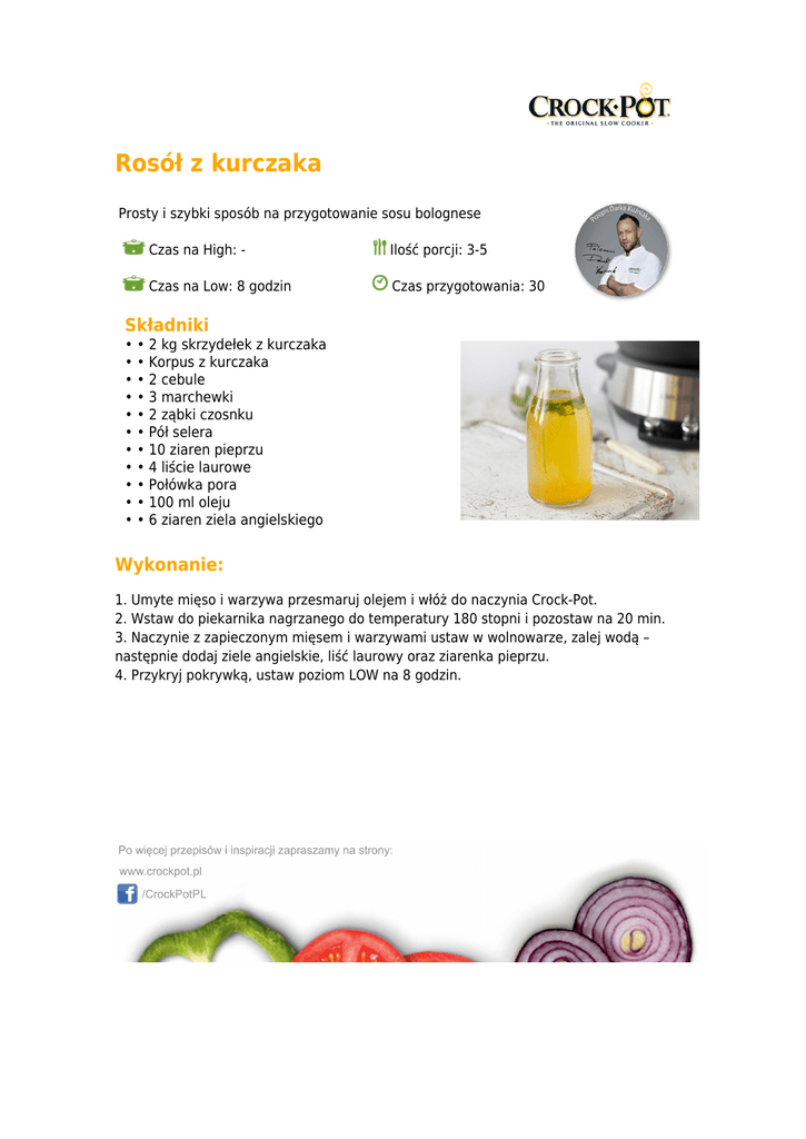 Rosół z kurczaka Prosty i szybki sposób na przygotowanie sosu bolognese Czas na High: - Ilość porcji: 3-5 Czas na Low: 8 godzin Czas przygotowania: 30 Składniki • • 2 kg skrzydełek z kurczaka • • Korpus z kurczaka • • 2 cebule • • 3 marchewki • • 2 ząbki czosnku • • Pół selera • • 10 ziaren pieprzu • • 4 liście laurowe • • Połówka pora • • 100 ml oleju • • 6 ziaren ziela angielskiego Wykonanie: 1. Umyte mięso i warzywa przesmaruj olejem i włóż do naczynia Crock-Pot. 2. Wstaw do piekarnika nagrzanego do temperatury 180 stopni i pozostaw na 20 min. 3. Naczynie z zapieczonym mięsem i warzywami ustaw w wolnowarze, zalej wodą – następnie dodaj ziele angielskie, liść laurowy oraz ziarenka pieprzu. 4. Przykryj pokrywką, ustaw poziom LOW na 8 godzin.