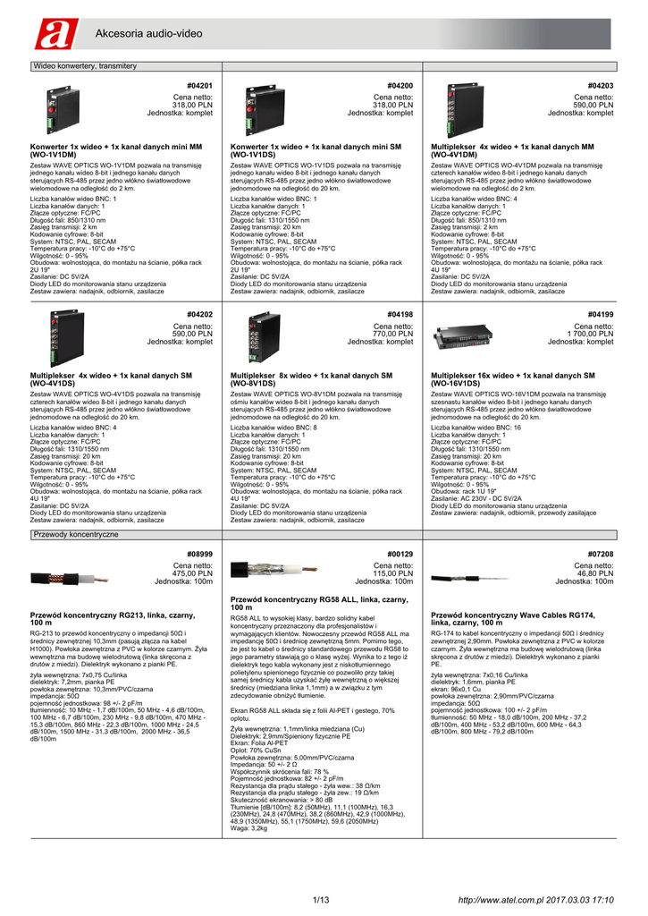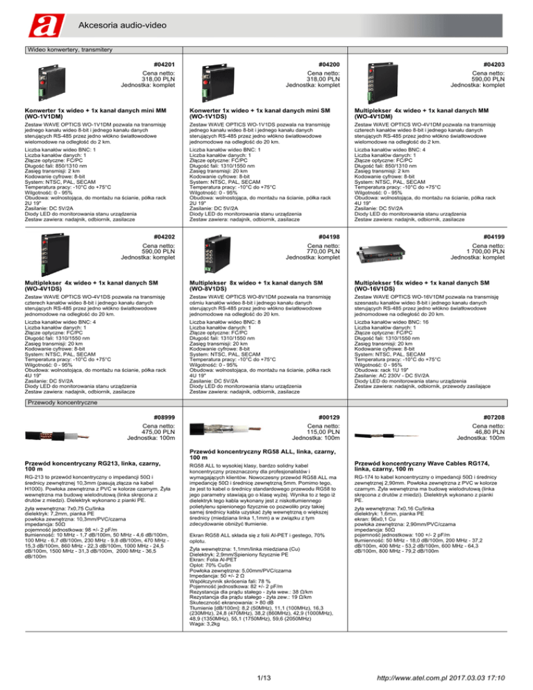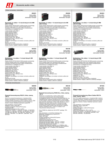 Akcesoria audio-video Wideo konwertery, transmitery #04201 #04200 #04203 Cena netto: 318,00 PLN Jednostka: komplet Cena netto: 318,00 PLN Jednostka: komplet Cena netto: 590,00 PLN Jednostka: komplet Konwerter 1x wideo + 1x kanał danych mini MM (WO-1V1DM) Konwerter 1x wideo + 1x kanał danych mini SM (WO-1V1DS) Multiplekser 4x wideo + 1x kanał danych MM (WO-4V1DM) Zestaw WAVE OPTICS WO-1V1DM pozwala na transmisję jednego kanału wideo 8-bit i jednego kanału danych sterujących RS-485 przez jedno włókno światłowodowe wielomodowe na odległość do 2 km. Zestaw WAVE OPTICS WO-1V1DS pozwala na transmisję jednego kanału wideo 8-bit i jednego kanału danych sterujących RS-485 przez jedno włókno światłowodowe jednomodowe na odległość do 20 km. Zestaw WAVE OPTICS WO-4V1DM pozwala na transmisję czterech kanałów wideo 8-bit i jednego kanału danych sterujących RS-485 przez jedno włókno światłowodowe wielomodowe na odległość do 2 km. Liczba kanałów wideo BNC: 1 Liczba kanałów danych: 1 Złącze optyczne: FC/PC Długość fali: 850/1310 nm Zasięg transmisji: 2 km Kodowanie cyfrowe: 8-bit System: NTSC, PAL, SECAM Temperatura pracy: -10°C do +75°C Wilgotność: 0 - 95% Obudowa: wolnostojąca, do montażu na ścianie, półka rack 2U 19" Zasilanie: DC 5V/2A Diody LED do monitorowania stanu urządzenia Zestaw zawiera: nadajnik, odbiornik, zasilacze Liczba kanałów wideo BNC: 1 Liczba kanałów danych: 1 Złącze optyczne: FC/PC Długość fali: 1310/1550 nm Zasięg transmisji: 20 km Kodowanie cyfrowe: 8-bit System: NTSC, PAL, SECAM Temperatura pracy: -10°C do +75°C Wilgotność: 0 - 95% Obudowa: wolnostojąca, do montażu na ścianie, półka rack 2U 19" Zasilanie: DC 5V/2A Diody LED do monitorowania stanu urządzenia Zestaw zawiera: nadajnik, odbiornik, zasilacze Liczba kanałów wideo BNC: 4 Liczba kanałów danych: 1 Złącze optyczne: FC/PC Długość fali: 850/1310 nm Zasięg transmisji: 2 km Kodowanie cyfrowe: 8-bit System: NTSC, PAL, SECAM Temperatura pracy: -10°C do +75°C Wilgotność: 0 - 95% Obudowa: wolnostojąca, do montażu na ścianie, półka rack 4U 19" Zasilanie: DC 5V/2A Diody LED do monitorowania stanu urządzenia Zestaw zawiera: nadajnik, odbiornik, zasilacze #04202 #04198 #04199 Cena netto: 590,00 PLN Jednostka: komplet Cena netto: 770,00 PLN Jednostka: komplet Cena netto: 1 700,00 PLN Jednostka: komplet Multiplekser 4x wideo + 1x kanał danych SM (WO-4V1DS) Multiplekser 8x wideo + 1x kanał danych SM (WO-8V1DS) Multiplekser 16x wideo + 1x kanał danych SM (WO-16V1DS) Zestaw WAVE OPTICS WO-4V1DS pozwala na transmisję czterech kanałów wideo 8-bit i jednego kanału danych sterujących RS-485 przez jedno włókno światłowodowe jednomodowe na odległość do 20 km. Zestaw WAVE OPTICS WO-8V1DM pozwala na transmisję ośmiu kanałów wideo 8-bit i jednego kanału danych sterujących RS-485 przez jedno włókno światłowodowe jednomodowe na odległość do 20 km. Zestaw WAVE OPTICS WO-16V1DM pozwala na transmisję szesnastu kanałów wideo 8-bit i jednego kanału danych sterujących RS-485 przez jedno włókno światłowodowe jednomodowe na odległość do 20 km. Liczba kanałów wideo BNC: 4 Liczba kanałów danych: 1 Złącze optyczne: FC/PC Długość fali: 1310/1550 nm Zasięg transmisji: 20 km Kodowanie cyfrowe: 8-bit System: NTSC, PAL, SECAM Temperatura pracy: -10°C do +75°C Wilgotność: 0 - 95% Obudowa: wolnostojąca, do montażu na ścianie, półka rack 4U 19" Zasilanie: DC 5V/2A Diody LED do monitorowania stanu urządzenia Zestaw zawiera: nadajnik, odbiornik, zasilacze Liczba kanałów wideo BNC: 8 Liczba kanałów danych: 1 Złącze optyczne: FC/PC Długość fali: 1310/1550 nm Zasięg transmisji: 20 km Kodowanie cyfrowe: 8-bit System: NTSC, PAL, SECAM Temperatura pracy: -10°C do +75°C Wilgotność: 0 - 95% Obudowa: wolnostojąca, do montażu na ścianie, półka rack 4U 19" Zasilanie: DC 5V/2A Diody LED do monitorowania stanu urządzenia Zestaw zawiera: nadajnik, odbiornik, zasilacze Liczba kanałów wideo BNC: 16 Liczba kanałów danych: 1 Złącze optyczne: FC/PC Długość fali: 1310/1550 nm Zasięg transmisji: 20 km Kodowanie cyfrowe: 8-bit System: NTSC, PAL, SECAM Temperatura pracy: -10°C do +75°C Wilgotność: 0 - 95% Obudowa: rack 1U 19" Zasilanie: AC 230V - DC 5V/2A Diody LED do monitorowania stanu urządzenia Zestaw zawiera: nadajnik, odbiornik, przewody zasilające Przewody koncentryczne #08999 #00129 #07208 Cena netto: 475,00 PLN Jednostka: 100m Cena netto: 115,00 PLN Jednostka: 100m Cena netto: 46,80 PLN Jednostka: 100m Przewód koncentryczny RG213, linka, czarny, 100 m RG-213 to przewód koncentryczny o impedancji 50Ω i średnicy zewnętrznej 10,3mm (pasują złącza na kabel H1000). Powłoka zewnętrzna z PVC w kolorze czarnym. Żyła wewnętrzna ma budowę wielodrutową (linka skręcona z drutów z miedzi). Dielektryk wykonano z pianki PE. żyła wewnętrzna: 7x0,75 Cu/linka dielektryk: 7,2mm, pianka PE powłoka zewnętrzna: 10,3mm/PVC/czarna impedancja: 50Ω pojemność jednostkowa: 98 +/- 2 pF/m tłumienność: 10 MHz - 1,7 dB/100m, 50 MHz - 4,6 dB/100m, 100 MHz - 6,7 dB/100m, 230 MHz - 9,8 dB/100m, 470 MHz 15,3 dB/100m, 860 MHz - 22,3 dB/100m, 1000 MHz - 24,5 dB/100m, 1500 MHz - 31,3 dB/100m, 2000 MHz - 36,5 dB/100m Przewód koncentryczny RG58 ALL, linka, czarny, 100 m RG58 ALL to wysokiej klasy, bardzo solidny kabel koncentryczny przeznaczony dla profesjonalistów i wymagających klientów. Nowoczesny przewód RG58 ALL ma impedancję 50Ω i średnicę zewnętrzną 5mm. Pomimo tego, że jest to kabel o średnicy standardowego przewodu RG58 to jego parametry stawiają go o klasę wyżej. Wynika to z tego iż dielektryk tego kabla wykonany jest z niskotłumiennego polietylenu spienionego fizycznie co pozwoliło przy takiej samej średnicy kabla uzyskać żyłę wewnętrzną o większej średnicy (miedziana linka 1,1mm) a w związku z tym zdecydowanie obniżyć tłumienie. Ekran RG58 ALL składa się z folii 