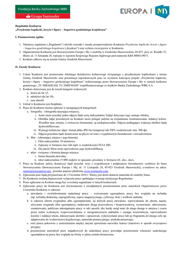 Regulamin Konkursu „Przydrożne kapliczki, krzyże i figury – bogactwo grodziskiego krajobrazu” I. Postanowienia ogólne 1. Niniejszy regulamin („Regulamin”) określa warunki i zasady przeprowadzenia Konkursu Przydrożne kapliczki, krzyże i figury – bogactwo grodziskiego krajobrazu („Konkurs”) oraz wyboru zwycięzców w Konkursie. 2. Organizatorem Konkursu jest Stowarzyszenie Europa i My z siedzibą w Grodzisku Mazowieckim, 05-827, przy ul. Rusałki 33, Biuro: ul. 11 listopada 28, wpisane w rejestrze Krajowego Rejestru Sądowego pod numerem KRS 0000119073. 3. Konkurs odbywa się na terenie Gminy Grodzisk Mazowiecki. II. Zasady Konkursu 1. Celem Konkursu jest promowanie lokalnego dziedzictwa kulturowego związanego z przydrożnymi kapliczkami z terenu Gminy Grodzisk Mazowiecki oraz prezentacja najciekawszych prac na wystawie kończącej projekt „Przydrożne kapliczki, krzyże i figury – bogactwo grodziskiego krajobrazu” realizowanego przez Stowarzyszenie Europa i My w ramach konkursu grantowego „TU MIESZKAM, TU ZMIENIAM” współfinansowanego ze środków Banku Zachodniego WBK S.A. 2. Konkurs skierowany jest do trzech kategorii wiekowych: a. dzieci do lat 12, b. młodzież (do lat 18), c. oraz dorośli 3. Udział w Konkursie jest bezpłatny. 4. Prace do Konkursu można zgłaszać w następujących kategoriach: a. fotografia – (fotografia ukazująca miejsce), i. Autor może przesłać jedno zdjęcie bądź serię maksymalnie 5zdjęć dotyczące tego samego obiektu, ii. Obróbka zdjęć przesłanych na Konkurs może polegać jedynie na rozjaśnianiu, kontrastowaniu, redukcji koloru. Wszelkie inne zmiany, a zwłaszcza fotomontaż, są niedopuszczalne. Zdjęcia podlegające większej obróbce będą dyskwalifikowane. iii. Wymogi techniczne zdjęć: format pliku JPG bez kompresji lub TIFF, rozdzielczość min. 300 dpi. iv. Zdjęcia przesłane bądź dostarczone na płycie cd wraz z wypełnionym formularzem i oświadczeniem. b. film – (obrazujący miejsce i jego historię) i. Film maksymalnie 10 minutowy, ii. Zapisany w formacie mov lub mp4, w rozdzielczości FULL HD, iii. Zła jakość filmu może spowodować jego dyskwalifikację. c. tekst - związany z historią danego miejsca: i. forma literacka dowolna, ii. tekst maksymalnie 15 000 znaków ze spacjami, przesłany w formacie rtf., doc., docx, 5. Prace na Konkurs należy dostarczyć bądź przesłać wraz z wypełnionym i podpisanym formularzem: osobiście do biura Stowarzyszenia (Stowarzyszenie Europa i My, ul. 11 Listopada 28, 05-825 Grodzisk Mazowiecki), e-mailowo na adres: [email protected]., przesłać poprzez platformę www.wetransfer.com. 6. Zgłoszenia prac będą przyjmowane do 15 kwietnia 2016 r. Ważny jest dzień dotarcia materiału do siedziby biura. 7. Do Konkursu zostaną dopuszczone wyłącznie prace spełniające wymogi niniejszego Regulaminu. 8. Prace zgłaszane na Konkurs mogą być wcześniej nagradzane w innych konkursach. 9. Zgłoszenie pracy do Konkursu jest równoznaczne z nieodpłatnym przeniesieniem praw autorskich Organizatorowi przez Uczestnika Konkursu w zakresie: a. utrwalania i zwielokrotniania nadesłanej pracy – wytwarzanie egzemplarzy pracy bez względu na technikę (np. techniką drukarską, reprograficzną, zapisu magnetycznego, cyfrową), ilość i wielkość nakładu; b. w zakresie obrotu oryginałem albo egzemplarzami, na których pracę utrwalono, wprowadzanie do obrotu, najem, użyczenie oryginału albo egzemplarzy, nadawanie drogą przewodową i bezprzewodową, wystawianie, odtworzenie, reemitowanie, publiczne udostępnianie pracy w taki sposób, aby każdy mógł mieć do niego dostęp w miejscu i czasie przez siebie wybranym, rozpowszechnianie w nieograniczonym nakładzie i zasięgu terytorialnym, wprowadzenie korekty i redakcji tekstu, dokonywanie skrótów i opracowań, wykorzystanie pracy lub jej fragmentu do innego celu np. adaptowanie do wydawnictwa książkowego, materiału promocyjnego, artykułu prasowego; c. oraz prawa pokrewne z zastrzeżeniem między innymi ujawnienia nazwiska Autora (Autorów) w sposób zwyczajowo przyjęty; d. przeniesienie autorskich praw majątkowych do nadesłanej pracy powoduje przeniesienie własności nadesłanego egzemplarza tej pracy bez względu na formę w jakiej została dostarczona. 10. Przekazanie prac konkursowych oznacza jednocześnie, że nie będą one zagrażały ani naruszały praw osób trzecich, w szczególności nie będą naruszały ich majątkowych i osobistych praw autorskich, oraz że osoba przekazująca prace konkursowe ma zgody osób, których wizerunki utrwalono w pracy, i uprawnienia do wyrażania zgody na wykorzystanie tych wizerunków. przypadku wystąpienia przez osobę trzecią z roszczeniami wynikającymi z tytułu naruszenia praw określonych powyżej osoba przekazująca zrekompensuje Organizatorowi, jako wyłącznie odpowiedzialna, koszty poniesione w związku ze skierowaniem przeciwko niemu roszczeń odszkodowawczych, zwalniając Organizatora od wszelkich zobowiązań, jakie powstaną z tego tytułu. III. Ocena prac i rozstrzygnięcie Konkursu 1. Organizator powołuje min. 3 osobowe Jury Konkursu („Jury"), którego zadaniem jest nadzór nad prawidłowym przebiegiem Konkursu oraz wyłonienie zwycięzców. 2. Spośród nadesłanych prac Jury wybierze trzy prace, które zajmą pierwsze, drugie i trzecie miejsce. 3. W przypadku zgłoszenia się małej liczby prac konkursowych bądź prac o niskiej wartości artystycznej i merytorycznej Jury zastrzega sobie prawo do zmiany zasad wyboru najlepszych prac lub nie rozstrzygnięcia Konkursu. 4. Jury ma prawo także wybrać prace wyróżnione – o liczbie tych prac Jury zadecyduje podczas obrad. 5. Decyzje Jury są ostateczne i wiążące dla wszystkich uczestników Konkursu. 6. O decyzji Jury nagrodzone i wyróżnione osoby zostaną powiadomione telefonicznie i/lub drogą elektroniczną. 7. Decyzje Jury zostaną ogłoszone na stronie Organizatora. 8. Rozdan