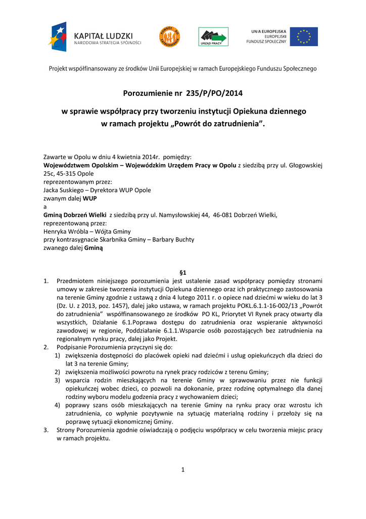 Porozumienie nr 235/P/PO/2014 w sprawie współpracy przy tworzeniu instytucji Opiekuna dziennego w ramach projektu „Powrót do zatrudnienia”. Zawarte w Opolu w dniu 4 kwietnia 2014r. pomiędzy: Województwem Opolskim – Wojewódzkim Urzędem Pracy w Opolu z siedzibą przy ul. Głogowskiej 25c, 45-315 Opole reprezentowanym przez: Jacka Suskiego – Dyrektora WUP Opole zwanym dalej WUP a Gminą Dobrzeń Wielki z siedzibą przy ul. Namysłowskiej 44, 46-081 Dobrzeń Wielki, reprezentowaną przez: Henryka Wróbla – Wójta Gminy przy kontrasygnacie Skarbnika Gminy – Barbary Buchty zwanego dalej Gminą §1 Przedmiotem niniejszego porozumienia jest ustalenie zasad współpracy pomiędzy stronami umowy w zakresie tworzenia instytucji Opiekuna dziennego oraz ich praktycznego zastosowania na terenie Gminy zgodnie z ustawą z dnia 4 lutego 2011 r. o opiece nad dziećmi w wieku do lat 3 (Dz. U. z 2013, poz. 1457), dalej jako ustawa, w ramach projektu POKL.6.1.1-16-002/13 „Powrót do zatrudnienia” współfinansowanego ze środków PO KL, Priorytet VI Rynek pracy otwarty dla wszystkich, Działanie 6.1.Poprawa dostępu do zatrudnienia oraz wspieranie aktywności zawodowej w regionie, Poddziałanie 6.1.1.Wsparcie osób pozostających bez zatrudnienia na regionalnym rynku pracy, dalej jako Projekt. 2. Podpisanie Porozumienia przyczyni się do: 1) zwiększenia dostępności do placówek opieki nad dziećmi i usług opiekuńczych dla dzieci do lat 3 na terenie Gminy; 2) zwiększenia możliwości powrotu na rynek pracy rodziców z terenu Gminy; 3) wsparcia rodzin mieszkających na terenie Gminy w sprawowaniu przez nie funkcji opiekuńczej wobec dzieci, co pozwoli na dokonanie, przez rodzinę optymalnego dla danej rodziny wyboru modelu godzenia pracy z wychowaniem dzieci; 4) poprawy szans osób mieszkających na terenie Gminy na rynku pracy oraz wzrostu ich zatrudnienia, co wpłynie pozytywnie na sytuację materialną rodziny i przełoży się na poprawę sytuacji ekonomicznej Gminy. 3. Strony Porozumienia zgodnie oświadczają o podjęciu współpracy w celu tworzenia miejsc pracy w ramach projektu. 1. 1 §2 W ramach realizacji porozumienia WUP zobowiązuje się do: 1) zrekrutowania oraz przeszkolenia kandydatów na Opiekunów dziennych zgodnie z wymogami ustawy; 2) przekazania Gminie informacji o przeszkolonych kandydatach na Opiekunów dziennych z terenu Gminy każdorazowo po zakończeniu szkolenia; 3) prowadzenia bazy danych osób zainteresowanych skorzystaniem z usług Opiekunów; 4) przekazywania Gminie informacji o osobach zainteresowanych skorzystaniem z usług Opiekunów wraz z informacją, o której mowa w pkt 2; 5) przeprowadzenia akcji informacyjno-promocyjnej dotyczącej projektu i możliwości skorzystania z usług Opiekuna na terenie Gminy; 6) refundowania wynagrodzenia Opiekunów wraz ze składkami na ubezpieczenie społeczne i Fundusz Pracy obciążających Zleceniodawcę w ramach wypłaconego za dany miesiąc wynagrodzenia dla Opiekuna dziennego – Beneficjenta projektu pn. ”Powrót do zatrudnienia” przez okres średnio 12 miesięcy w oparciu o umowę, o której mowa w § 3 ust. 1 pkt 4; 7) doposażenia lokalu, w którym wykonywana będzie usługa opiekuńcza, w łóżeczko turystyczne zapewniające miejsce do odpoczynku dla dziecka; 8) pomocy oraz wsparcia merytorycznego w trakcie trwania współpracy; 9) w przypadku posiadania środków doposażenia stanowiska Opiekuna dziennego, o ile potrzeba taka zostanie pozytywnie zaopiniowana przez Gminę. 2. W ramach realizacji porozumienia WUP ma prawo do: 1) udziału w czynnościach kontrolnych wykonywanych przez Gminę w związku z realizacją uprawnień wynikających w tym zakresie z ustawy; 2) uzyskania od Gminy oświadczeń od rodziców/opiekunów prawnych dziecka do lat 3 o powrocie do zatrudnienia w związku z zatrudnieniem Opiekuna. 3. Strony ustalają, iż przedmiot umowy ze strony Gminy będzie realizowany przez Gminę. 1. 1. §3 W ramach realizacji porozumienia Gmina zobowiązuje się do: 1) przeprowadzenia konkursu na opiekuna dziennego zgodnie z zapisami ustawy z dnia 24 kwietnia 2003 r. o działalności pożytku publicznego i wolontariacie (tekst jedn. Dz. U. z 2010 r. Nr 234, poz. 1536 ze zm.), zwanym dalej jako konkurs; 2) rozpoczęcia procedury konkursu w terminie 14 dni od uzyskania informacji, o których mowa w § 2 ust. 1 pkt 2 i 4. Gmina może rozpocząć procedurę konkursu także w każdym czasie w przypadku posiadania informacji, o osobach zainteresowanych skorzystaniem z usług Opiekunów, 3) informowania WUP o terminie ogłoszenia konkursu celem zamieszczenia tej informacji na stronie internetowej projektu; 4) do zatrudnienia Opiekuna dziennego stosownie do art. 36 ust. 1 ustawy, finansowanego w ramach projektu przez WUP przez okres średnio 12 miesięcy, w oparciu o Umowę zlecenia zawartą między Gminą, a Opiekunem; 5) przekazania do WUP kopii Umowy zlecenia, w terminie do 7 dni od daty zawarcia Umowy; 6) wypłaty wynagrodzenia dla Opiekuna dziennego w wysokości: 2 10,00 zł brutto (dziesięć złotych ) za godzinę świadczonej opieki nad 1 dzieckiem, 13,00 zł brutto ( trzynaście złotych ) za godzinę świadczonej opieki nad 2 dzieci, 16,00 zł brutto ( szesnaście złotych ) za godzinę świadczonej opieki nad 3 dzieci, 19,00 zł brutto ( dziewiętnaście złotych ) za godzinę świadczonej opieki nad 4 dzieci, 22,00 zł brutto ( dwadzieścia dwa złotych ) za godzinę świadczonej opieki nad 5 dzieci, Wynagrodzenie ulega podwyższeniu o 50% w przypadku objęcia opieką dziecka niepełnosprawnego; 7) wysokość miesięcznego wynagrodzenia dla Opiekuna stanowić będzie iloczyn ilości godzin przepracowanych w danym miesiącu i stawki godzinowej uzależnionej od ilości dzieci objętych opieką; 8) pokrycia składek na ubezpieczenie społeczne i Fundusz Pracy obciążających Zleceniodawcę w ramach wypłaconego za dany miesiąc wynagrodzenia dla Opiekuna dziennego; 9) wypłaty wynagrodzenia dl