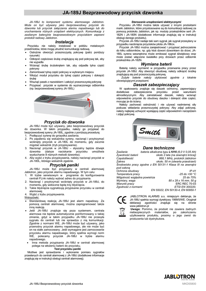 JA-189J Bezprzewodowy przycisk dzwonka JA-189J to komponent systemu alarmowego Jablotron. Może on być używany jako bezprzewodowy przycisk do dzwonka lub przycisk załączania alarmu napadowego lub do uruchamiania różnych urządzeń elektrycznych. Komunikację z zasilanym bateryjnie bezprzewodowym przyciskiem zapewni protokół radiowy Jablotron. Instalacja Przycisku nie należy instalować w pobliżu metalowych przedmiotów, które mogą utrudnić komunikację radiową. Ostrożnie otworzyć przezroczystą pokrywę (patrz poniższy rysunek) Odkręcić częściowo śrubę znajdującą się pod pokrywą tak, aby nie wypadła Wcisnąć śrubę śrubokrętem tak, aby odpadła tylna część pokrywy Zamontować tylną część pokrywy w wybranym miejscu Włożyć moduł przycisku do tylnej części pokrywy i dokręcić śrubę Wsunąć pasek z nazwiskiem i założyć przezroczystą pokrywę Przypisać przycisk w systemie do wyznaczonego odbiornika (np. bezprzewodowej syreny JA-180L) Sterowanie urządzeniami elektrycznymi Przycisku JA-189J można także używać z innymi produktami marki Jablotron, które przystosowane są do komunikacji radiowej za pomocą protokołu Jablotron, jak np. moduły przekaźników serii JA182N i JA-180N (dodatkowe informacje znajdują się w instrukcji obsługi danego produktu). Przycisk JA-189J nadaje taki sam sygnał, jak sygnał przesyłany w przypadku naciśnięcia przycisków pilota JA-186Jx. Przycisk JA-189J można zarejestrować i przypisać jednocześnie do kilku odbiorników, np. gdy ktoś dzwoni dzwonkiem do drzwi, JA180L syrena wewnętrzna może emitować sygnał dźwiękowy oraz może zostać włączone światełko przy drzwiach przez odbiornik przekaźnika JA-182N. Wymiana baterii Baterię należy wymienić w przypadku przerwania pracy przez przycisk JA-189J. Aby otworzyć obudowę, należy odkręcić śrubkę znajdującą się pod przezroczystą pokrywą. Zużyte baterie należy utylizować zgodnie z lokalnie obowiązującymi przepisami. Daszek zabezpieczający W opakowaniu znajduje się daszek ochronny, zapewniający dodatkowe zabezpieczenia przycisku przed warunkami atmosferycznymi. Aby zainstalować daszek, należy wcisnąć odpowiednio przycisk do obudowy daszka i dokręcić obie części, mocując je do ściany. Należy zachować ostrożność i nie używać nadmiernej siły podczas wkładania przezroczystej pokrywy. Aby zdjąć pokrywę, należy najlepiej uchwycić wystającą część odpowiednim narzędziem i zdjąć pokrywę. Przycisk do dzwonka JA-189J może być używany, jako bezprzewodowy przycisk do dzwonka. W takim przypadku, należy go przypisać do bezprzewodowej syreny JA-180L, zgodnie z poniższą procedurą: 1. Podłączyć syrenę do gniazdka zasilania. 2. Po zapaleniu się wskaźnika syreny, nacisnąć i przytrzymać wciśnięty przycisk w JA-180L do momentu, gdy zacznie migotać wskaźnik (tryb przypisywania). 3. Nacisnąć przycisk w JA-189J – słyszalny będzie dźwięk dzwonka (dalsze naciskanie przycisku umożliwia wysłuchanie 8 różnych melodii dzwonka). 4. Aby wyjść z trybu przypisywania, należy nacisnąć przycisk w JA-180L, którego wskaźnik zgaśnie. Przycisk paniki JA-189J może być przypisany w centrali alarmowej Jablotron, jako przycisk alarmu napadowego. W tym celu: 1. W trybie serwisowym w programie do konfigurowania centrali FLink należy wybrać adres do przypisania. 2. Nacisnąć i przytrzymać wciśnięty przycisk w JA-189J, do momentu, gdy widoczne będą trzy błyśnięcia. 3. Takie błyśnięcia sygnalizują przypisanie przycisku w centrali alarmowej. 4. Wyjść z trybu przypisywania. Wskazówki: Standardową reakcją JA-189J jest alarm napadowy. Za pomocą centrali alarmowej, można zaprogramować także inną reakcję. Jeśli JA-189J znajduje się poza systemem, centrala alarmowa nie będzie automatycznie poinformowany o takiej zmianie, gdyż w takim przypadku JA-189J nie przesyła sygnału do centrali lub nie sprawdza z nią komunikacji. Zgodnie z normami WE, JA-189J może być używany, jako przenośny przycisk alarmu napadowego, ale nie może być on na stałe zamocowany. Jeśli wymagane jest zamocowanie przycisku alarmu napadowego, który spełnia wymogi norm WE, polecamy przycisk JA-188J w trybie alarmu napadowego. Inna metoda przypisania JA-189J w centrali alarmowej polega na włożeniu baterii do przycisku. Test przycisku paniki Możliwe jest sprawdzenie i wykonanie pomiaru sygnałów przesłanych do centrali alarmowej z JA-189J (dodatkowe informacje znajdują się w instrukcji obsługi centrali alarmowej). JA-189J Bezprzewodowy przycisk dzwonka Dane techniczne Zasilanie bateria alkaliczna typu L1016 (6,0 V 0,05 Ah) Żywotność baterii około 2 lata (na zewnątrz krócej) Częstotliwość 868,1 MHz, protokół Jablotron Zakres około. 50 m (otwarta przestrzeń) Środowisko pracy zgodne z EN 50131-1 Klasa III na zewnątrz pod osłoną Ochrona obudowy IP-41 Temperatura pracy -25 do +50 °C Wilgotność względna powietrza 25 do 75% Wymiary, waga 80 x 28 x 16 mm, 50 g Warunki pracy ERC REC 70-03 Zgodność z normami ETSI EN 300220, EN 55022, EN 50130-4, EN 60950-1 JABLOTRON ALARMS a.s. niniejszym deklaruje, że JA-189J spełnia wymogi dyrektywy 1999/5/WE. Oryginał deklaracji zgodności znajduje się na stronie www.jablotron.pl Uwaga: Pomimo, że produkt nie zawiera żadnych niebezpiecznych materiałów, po zakończeniu użytkowania produktu, prosimy o jego zwrot do producenta lub dystrybutora. MKD55800