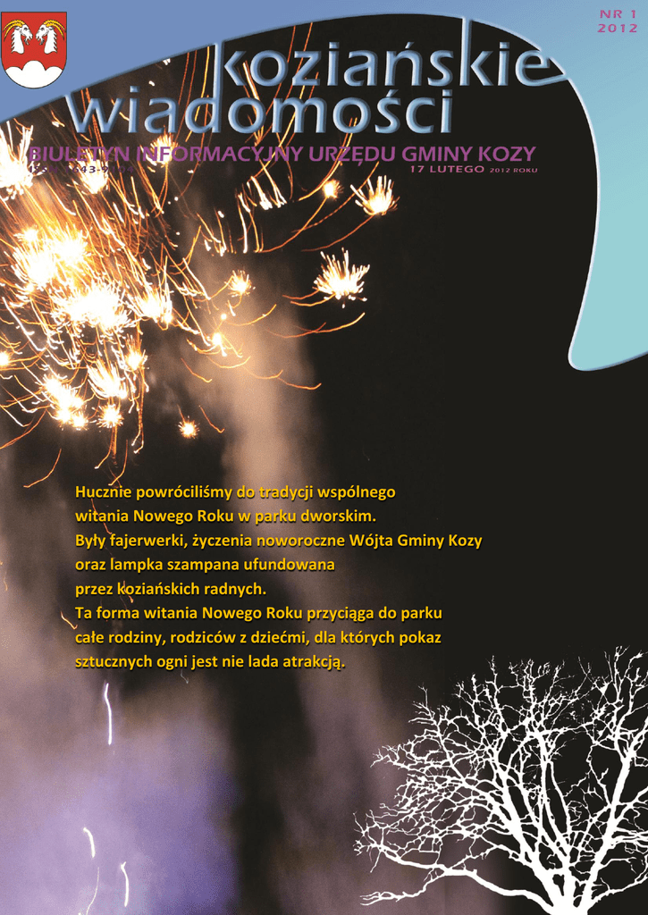 Hucznie powróciliśmy do tradycji wspólnego witania Nowego Roku w parku dworskim. Były fajerwerki, życzenia noworoczne Wójta Gminy Kozy oraz lampka szampana ufundowana przez koziańskich radnych. Ta forma witania Nowego Roku przyciąga do parku całe rodziny, rodziców z dziećmi, dla których pokaz sztucznych ogni jest nie lada atrakcją. NOWOROCZNIE I SPORTOWO W STAROSTWIE POWIATOWYM Na dorocznym Noworocznym spotkaniu sportowców i działaczy sportowych w Starostwie Powiatowym w Bielsku-Białej wręczono wyróżnienia wybitnym osobom sportu w powiecie. Wśród wyróżnionych znalazł się mistrz w trójboju siłowym pan Wiesław Wróbel na co dzień trenujący w Centrum SportowoWidowiskowym w Kozach. SPOTKANIE Z KOLĘDĄ 15 stycznia odbyło się w Kozach „Spotkanie z Kolędą”. Po raz kolejny rozśpiewanych gości serdecznie przyjął ksiądz Marek Łapczyński proboszcz parafii Zesłania Ducha Świętego w Kozach Gajach, za co serdecznie dziękujemy. W koncercie wzięły udział chóry: Chór Kameralny "Brevis" z Bielska-Białej, dyrygentka: Dominika Jurczuk-Gondek, Chór „Zew“ z Bielska-Białej wraz z Chórem Parafialnym z Kóz, w zastępstwie dyrygował ks. Krzysztof Kurnik, Chór „Bielański” z Bielan, dyrygentka: Magdalena Rodak, Chór „Harfa“ z Komorowic, Dyrygentka: Anna Ostrowska oraz gościnnie wystąpił Regionalny Zespół Pieśni i Tańca "Jasieniczanka" pod kierownictwem Olgi Mendrek i Jerzego Jodłowca. Koncert organizowany był przez Polski Związek Chórów i Orkiestr w Bielsku-Białej oraz Dom Kultury w Kozach. An n a C z a p l i ń s k a VIS VITALIS PO KOZIAŃSKU Z zazdrością można patrzyć na koziańskich emerytów. Tu na każdym kroku widoczna jest energia i chęć działania. Spotkanie, impreza towarzyska, wspólna wycieczka czy zabawa taneczna to częste działania członków koziańskiego Koła Związku Emerytów, Rencistów i Inwalidów. Ostatnio do preferowanych form aktywności doszła pasja śpiewu chóralnego (pewnie trochę pozazdrościli paniom z KGW, które zakosztowały chóralnych występów na scenie) oraz zainteresowanie teatrem. To ostatnie zamiłowanie to na razie tylko sondowanie materii teatralnej. Pan Prezes Benedykt Gawęda zaprosił teatr seniorów z Lipnika ze swoim spektaklem pt. „jeden dzień z życia E…” do Domu Kultury. Ciekawe czy nasi emeryci pójdą w ślady koleżanek i kolegów z Lipnika. Brawo, aż chce się żyć… Marek Małecki KOZIAŃSKI WIECZÓR KOLĘDOWY W środę, 18 stycznia 2012 r. sala widowiskowa Domu Kultury przepełniła się dźwiękami kolęd i pastorałek w wykonaniu koziańskich zespołów współpracujących z Domem Kultury. „Koziański Wieczór Kolędowy” rozpoczął koncert Zespołu Akordeonistów, zachęcając wszystkich do wspólnego kolędowania. W nieco odmienny klimat wprowadził publiczność Chór Domu Kultury, który zaprezentował kolędy i pastorałki a capella. Zespół Pieśni i Tańca „Kozianie” przedstawił swój spektakl kolędowy. Spotkanie zakończone zostało wspólnym śpiewem zespołów oraz publiczności. An n a C z a p l i ń s k a RADA GMINY KOZY Dnia 10 lutego 2012 r. odbyła się XIV Sesja Rady Gminy Kozy. Na XIV Sesji Rada podjęła 6 uchwał: - w sprawie przystąpienia do sporządzenia studium uwarunkowań i kierunków zagospodarowania przestrzennego w granicach administracyjnych gminy Kozy, - w sprawie wyrażenia zgody na dzierżawę nieruchomości zabudowanej na czas nieokreślony w drodze przetargu, - w sprawie przedłużenia czasu obowiązywania dotychczasowych taryf dla zbiorowego zaopatrzenia w wodę, - w sprawie zmiany Wieloletniej Prognozy Finansowej Gminy Kozy na lata 2011-2020, - w sprawie zmiany uchwały Rady Gminy Kozy Nr XIII/82/2011 z dnia 16 grudnia 2011 r. Uchwała Budżetowa na rok 2012 Gminy Kozy, - w sprawie zaciągnięcia długoterminowej pożyczki z Wojewódzkiego Funduszu Ochrony Środowiska i Gospodarki Wodnej w Katowicach. Rada wysłuchała i przyjęła: - sprawozdanie z działalności Komisji Rewizyjnej za 2011 r., w tym sprawozdanie z realizacji Uchwały nr VII/36/2011 Rady Gminy Kozy z dnia 6 maja 2011 r. w sprawie zlecenia Komisji Rewizyjnej kontroli jednostek organizacyjnych Gminy, - informację o wydanych decyzjach, ustalających opłaty z tytułu wzrostu wartości nieruchomości w związku z uchwaleniem miejscowego planu zagospodarowania przestrzennego na dzień 31.12.2011 r., - informację Policji dotyczącą stanu bezpieczeństwa i porządku publicznego na terenie działania Komisariatu Policji w Kobiernicach za 2011 rok. Wszystkie uchwały podjęte na sesjach Rady Gminy podawane są do wiadomości mieszkańców poprzez wywieszenie ich w holu Urzędu Gminy oraz umieszczenie na stronie internetowej Biuletynu Informacji Publicznej Urzędu Gminy www.bip.kozy.pl lub http://bip.ugkozy.rekord.pl. Barbara Walewska Szanowni Mieszkańcy ! Za nami Święta Bożego Narodzenia i rozpoczęcie Nowego 2012 Roku, który powitaliśmy uroczyście w parku dworskim, obok Pałacu Czeczów, gdzie tłumnie przybyli mieszkańcy Kóz i osoby przyjezdne. W zimowej scenerii przy odgłosie otwieranych szampanów i przy blasku fajerwerków składaliśmy sobie noworoczne życzenia. Na ostatniej Sesji Rady Gminy Kozy (16.12.2011r.) Radni obecnej kadencji jednogłośnie uchwalili budżet na 2012r. Jest to najważniejsza uchwała Rady, która określa zakres działań dotyczących życia gospodarczospołeczno- kulturalnego naszej miejscowości. To dzięki mądrej i rzeczowej dyskusji Radnych, poprzedzonej merytorycznym przygotowaniem projektu budżetu przez pracowników UG Kozy, jak również dyrektorów jednostek podległych, można było przystąpić do realizacji zamierzonych planów. Zaplanowane zostały działania mające na celu poprawienie poziomu życia Naszych Mieszkańców. Część inwestycji będzie kontynuowana, ale również będą nowe. W nowym roku przystępujemy do remontu konserwatorskiego i modernizacji budynku Pałacu Czeczów. W