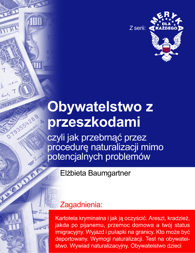 Z serii: Obywatelstwo z przeszkodami czyli jak przebrnq~ przez procedur[ naturalizacji mimo potencjalnych problem*w El\bieta Baumgartner Zagadnienia: Kartotela kryminalna i jak jq oczy<ci~. Areszt, kradzie\, jakda po pijanemu, przemoc domowa a tw*j status imigracyjny. Wyjazd i pu]apki na granicy. Kto mo\e by~ deportowany. Wymogi naturalizacji. Test na obywatelstwo. Wywiad naturalizacyjny. Obywatelstwo dzieci Niniejsza darmowa publikacja zawiera jedynie fragment pełnej wersji całej publikacji. Aby przeczytać ten tytuł w pełnej wersji kliknij tutaj. Niniejsza publikacja może być kopiowana, oraz dowolnie rozprowadzana tylko i wyłącznie w formie dostarczonej przez NetPress Digital Sp. z o.o., operatora sklepu na którym można nabyć niniejszy tytuł w pełnej wersji. Zabronione są jakiekolwiek zmiany w zawartości publikacji bez pisemnej zgody NetPress oraz wydawcy niniejszej publikacji. Zabrania się jej od-sprzedaży, zgodnie z regulaminem serwisu. Pełna wersja niniejszej publikacji jest do nabycia w sklepie internetowym Salon Cyfrowych Publikacji ePartnerzy.com. Obywatelstwo z przeszkodami Jak przebrnąć przez procedurę naturalizacji mimo potencjalnych problemów Elzbieta Baumgartner przy pomocy mec. Tomasza Kwiatkowskiego Copyright by Polpress Services 2009 Okładka: Przemysław Skok, Skok Communication Arts LLC, tel. 1-718-224-2948 Wydawca: Polpress Services, 255 Park Lane, Douglaston, NY 11363, tel. 1-718-224-3492 Konsultacja prawna: Tomasz Kwiatkowski, Esq Redakcja tekstu: Danuta Marciszek Copyright 2009, Polpress Services ISBN 10: 0-9770453-8-2, ISBN 13: 978-0-9770453-8-9 Kopiowanie całości lub fragmentów tej książki bez pozwolenia jej wydawcy stanowi naruszenie praw autorskich. Treść niniejszej książki ma charakter ogólnej informacji i nie powinna być traktowana jako porada prawna. Przed podjęciem jakichkolwiek decyzji czytelnik powinien rozważyć swoją własną sytuację i ew. zasięgnąć opinii prawnika. Twórcy książki dołożyli wszelkich starań, by przedstawić aktualne i prawdziwe informacje. Czytelnik powinien być świadomy, że przepisy, adresy i numery telefonów ulegają zmianie. Specjalne podziękowania należą się osobom, które przyczyniły się do powstania tej książki. Są to: Barbara Chlebińska, Eugenie Chmura Esq. Obywatelstwo z przeszkodami 1 Spis treści 1. Wstęp ............................................................................................................................... 4 2. Oczyść swoją kryminalną kartotekę............................................................................ 5 2.1. Co to jest historia notowań policyjnych ................................................................ 5 2.2. Jak sprawdzić swoją historię kryminalną ............................................................. 7 2.3. Jak usunąć błędy ze swojej kryminalnej kartoteki ..............................................10 2.4. Jak oczyścić swoją kryminalną kartotekę.............................................................15 2.5. Co powinieneś wiedzieć o sprawdzianie karalności przez USCIS ....................18 2.6. Stanowe Kartoteki Kryminalne (State Criminal History Record Repositories) 21 3. Sprawy kryminalne a status imigracyjny...................................................................24 3.1. Wyroki w świetle prawa imigracyjnego ..............................................................24 3.2. Podstawy do deportacji.........................................................................................28 3.3. Podstawy do zakazu wjazdu i otrzymania wiz (grounds of inadmissibility).......31 3.4. Prawne manewry...................................................................................................35 3.5. Czego wymaga się od kandydata na zieloną kartę.............................................37 3.6. Czego wymaga się od kandydata na tymczasową wizę.....................................38 4. Problemy z życia wzięte ...............................................................................................40 4.1. Aresztowanie .........................................................................................................40 4.2. Kradzież w sklepie.................................................................................................42 4.3. Wykroczenia związane z narkotykami ................................................................43 4.4. Przemoc domowa ..................................................................................................44 4.5. Jazda w stanie nietrzeźwym .................................................................................45 5. Co powinien wiedzieć stały rezydent.........................................................................47 5.1. Prawa i obowiązki stałego rezydenta...................................................................47 5.2. Jak nie stracić zielonej karty..................................................................................48 5.3. Gdy zielona karta wygasła lub zginęła ................................................................50 5.4. Zmiana adresu .......................................................................................................52 5.5. Służba militarna i nowi Amerykanie ...................................................................53 6. Wyjazdy stałego rezydenta za granicę i potencjalne problemy ..............................57 6.1. Krótki pobyt za granicą – do roku........................................................................57 6.2. Długi pobyt za granicą – od roku do dwóch .......................................................57 6.3. Nieoczekiwany długi pobyt za granicą................................................................62 6.4. Powrót z zagranicy ................................................................................................66 6.5. Co oficer graniczny wie o tobie ..
