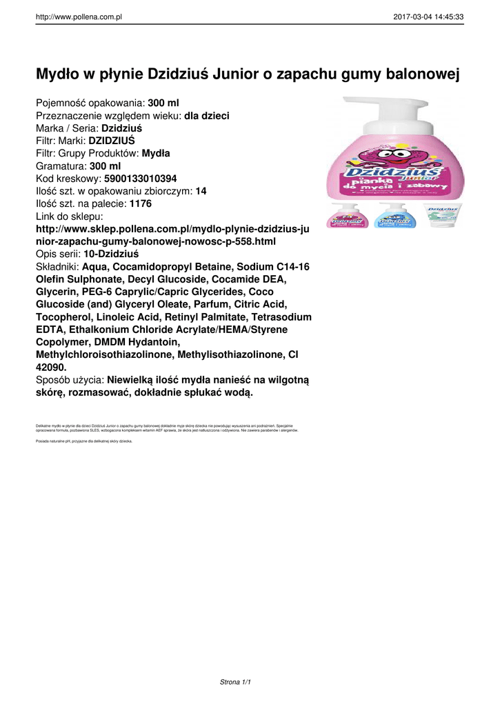 http://www.pollena.com.pl 2017-03-04 14:45:33 Mydło w płynie Dzidziuś Junior o zapachu gumy balonowej Pojemność opakowania: 300 ml Przeznaczenie względem wieku: dla dzieci Marka / Seria: Dzidziuś Filtr: Marki: DZIDZIUŚ Filtr: Grupy Produktów: Mydła Gramatura: 300 ml Kod kreskowy: 5900133010394 Ilość szt. w opakowaniu zbiorczym: 14 Ilość szt. na palecie: 1176 Link do sklepu: http://www.sklep.pollena.com.pl/mydlo-plynie-dzidzius-ju nior-zapachu-gumy-balonowej-nowosc-p-558.html Opis serii: 10-Dzidziuś Składniki: Aqua, Cocamidopropyl Betaine, Sodium C14-16 Olefin Sulphonate, Decyl Glucoside, Cocamide DEA, Glycerin, PEG-6 Caprylic/Capric Glycerides, Coco Glucoside (and) Glyceryl Oleate, Parfum, Citric Acid, Tocopherol, Linoleic Acid, Retinyl Palmitate, Tetrasodium EDTA, Ethalkonium Chloride Acrylate/HEMA/Styrene Copolymer, DMDM Hydantoin, Methylchloroisothiazolinone, Methylisothiazolinone, CI 42090. Sposób użycia: Niewielką ilość mydła nanieść na wilgotną skórę, rozmasować, dokładnie spłukać wodą. Delikatne mydło w płynie dla dzieci Dzidziuś Junior o zapachu gumy balonowej dokładnie myje skórę dziecka nie powodując wysuszenia ani podrażnień. Specjalnie opracowana formuła, pozbawiona SLES, wzbogacona kompleksem witamin AEF sprawia, że skóra jest natłuszczona i odżywiona. Nie zawiera parabenów i alergenów. Posiada naturalne pH, przyjazne dla delikatnej skóry dziecka. Strona 1/1