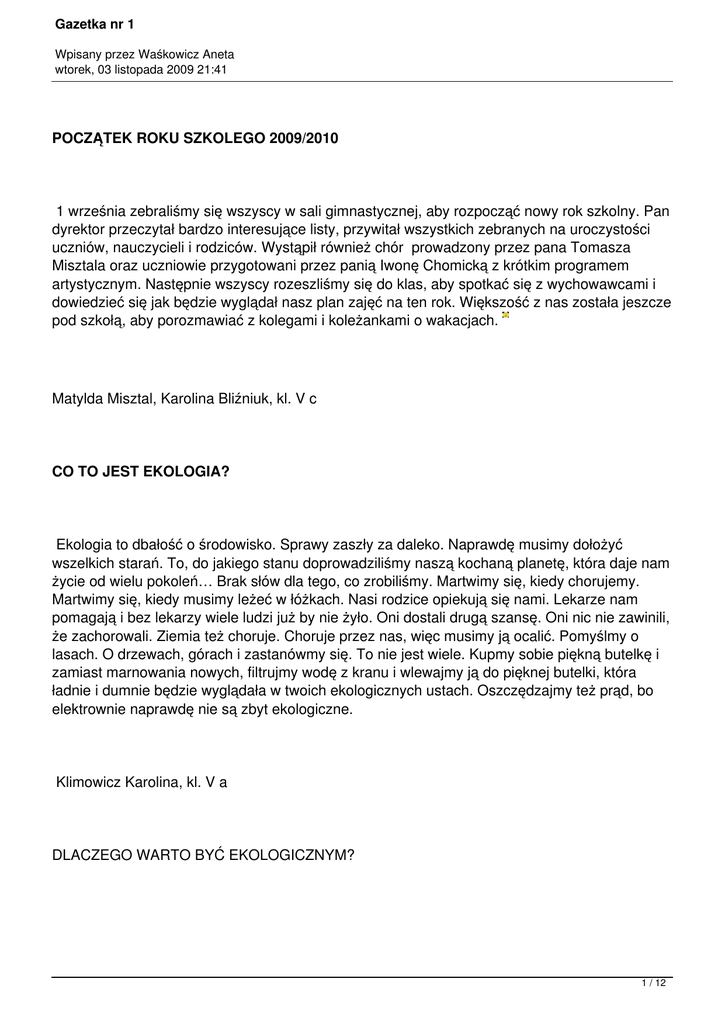 Gazetka nr 1 Wpisany przez Waśkowicz Aneta wtorek, 03 listopada 2009 21:41 POCZĄTEK ROKU SZKOLEGO 2009/2010 1 września zebraliśmy się wszyscy w sali gimnastycznej, aby rozpocząć nowy rok szkolny. Pan dyrektor przeczytał bardzo interesujące listy, przywitał wszystkich zebranych na uroczystości uczniów, nauczycieli i rodziców. Wystąpił również chór prowadzony przez pana Tomasza Misztala oraz uczniowie przygotowani przez panią Iwonę Chomicką z krótkim programem artystycznym. Następnie wszyscy rozeszliśmy się do klas, aby spotkać się z wychowawcami i dowiedzieć się jak będzie wyglądał nasz plan zajęć na ten rok. Większość z nas została jeszcze pod szkołą, aby porozmawiać z kolegami i koleżankami o wakacjach. Matylda Misztal, Karolina Bliźniuk, kl. V c CO TO JEST EKOLOGIA? Ekologia to dbałość o środowisko. Sprawy zaszły za daleko. Naprawdę musimy dołożyć wszelkich starań. To, do jakiego stanu doprowadziliśmy naszą kochaną planetę, która daje nam życie od wielu pokoleń… Brak słów dla tego, co zrobiliśmy. Martwimy się, kiedy chorujemy. Martwimy się, kiedy musimy leżeć w łóżkach. Nasi rodzice opiekują się nami. Lekarze nam pomagają i bez lekarzy wiele ludzi już by nie żyło. Oni dostali drugą szansę. Oni nic nie zawinili, że zachorowali. Ziemia też choruje. Choruje przez nas, więc musimy ją ocalić. Pomyślmy o lasach. O drzewach, górach i zastanówmy się. To nie jest wiele. Kupmy sobie piękną butelkę i zamiast marnowania nowych, filtrujmy wodę z kranu i wlewajmy ją do pięknej butelki, która ładnie i dumnie będzie wyglądała w twoich ekologicznych ustach. Oszczędzajmy też prąd, bo elektrownie naprawdę nie są zbyt ekologiczne. Klimowicz Karolina, kl. V a DLACZEGO WARTO BYĆ EKOLOGICZNYM? 1 / 12 Gazetka nr 1 Wpisany przez Waśkowicz Aneta wtorek, 03 listopada 2009 21:41 Warto być ekologicznym, ponieważ tak ocalimy naszą planetę oraz piękne krajobrazy, widoki i zieleń. Zachęcamy was do ekologicznego życia. To nic trudnego. Do niedawna też uważałyśmy, że ekologia nas nie dotyczy, ale pewna mądra osoba uświadomiła nam, że wcale tak nie jest. A my chcemy przekazać wam tę wiedzę. Bądź ekologiczny! Ocal planetę! Magdalena Siebielec, kl.5 a REMONT SZKOŁY W roku szkolnym 2009/10 zaszły zmiany w szkole. Do niektórych sal informatycznych zakupiono tablice multimedialne, ściany na korytarzach zostały zabezpieczone, dzięki czemu nie będą się brudzić. Uczniowie mają do dyspozycji dwa nowe boiska szkolne obłożone tartanem i otoczone wysokim ogrodzeniem, więc piłka nie wypada poza boisko. Jest też boisko do piłki nożnej, jednak nie możemy z niego na razie korzystać, ponieważ trawa nie jest dobrze ukorzeniona, więc musimy na nią poczekać. Szkoła została wyposażona w nowe ogrodzenia, przez co wszystko wygląda o wiele ładniej. Wojtek Adamek, kl. Vc WARSZTATY FOTOGRAFICZNE Piętnastego września z naszą klasą byliśmy na warsztatach fotograficznych „Plus Fotografii”. 2 / 12 Gazetka nr 1 Wpisany przez Waśkowicz Aneta wtorek, 03 listopada 2009 21:41 Warsztaty były połączone z wystawą zdjęć podzielonych na różne kategorie. Pani pokazała nam dużo ciekawych fotografii, zrobiła dwa konkursy a na koniec obejrzeliśmy film zmontowany na podstawie zdjęć. Pierwszy konkurs polegał na ułożeniu pocztówek z fragmentów pociętych widokówek. Drugi konkurs polegał na wykonaniu scenki do zdjęć kobiet. Trzeci polegał na narysowaniu „twarzy na twarzy”- eksperyment fotograficzny. Pani pokazała nam różne techniki fotografii. Warsztaty odbyły się przy ulicy Popiełuszki. Weronika Mrozek i Julia Jakubczak, kl. V a DZIEŃ CHŁOPAKA Nadchodzi dzień chłopaka! Z tej okazji w naszej szkole odbędzie się dyskoteka. W imieniu wszystkich dziewczyn Kurier 21 życzy wszystkiego najlepszego… mimo wszystko. Oto krótka informacja o tym święcie: Dzień chłopaka obchodzimy 30 września. Jest ono prawdopodobnie odpowiednikiem Dnia Kobiet, dlatego jest trochę mniej popularne. Po raz pierwszy obchodzono je w 1999 roku na wyspach Trinidad i Tobago. Na całym świecie obchodzone jest w różnych dniach. Na Malcie 7 lutego, w Rosji i na Ukrainie 23 lutego, w Brazylii 15 lipca, w Norwegii 7 października, w Kanadzie 25 listopada. W Irlandii i Wielkiej Brytanii 5 lipca BECZKA ŚMIECHU Zmarznięty w czasie śnieżycy turysta puka do bacówki - otwiera baca. - Macie baco coś do jedzenia? - Ni! - To może chociaż wrzątek macie? - Mom... Ino zimny. 3 / 12 Gazetka nr 1 Wpisany przez Waśkowicz Aneta wtorek, 03 listopada 2009 21:41 Przechodzeń zatrzymuje furmankę: - Baco jedziecie do Krakowa? - Ni, do Zakopanego. - Baco, ale to nie jest droga na Zakopane. - A co jo sie bede z końmi kłócił? Góry. Malarz maluje pejzaż. Podchodzi baca, patrzy jak artysta wiernie kopiuje widok i mówi: - Ile to się cłek musi namęcyć jak ni mo aparatu. Turysta pyta bacę: - Baco, dlaczego wywiesiliście przed drzwiami tabliczkę „Uwaga pies”, skoro macie małego pieska? - Bo już trzy razy mi go zdeptali! - Jasiu, kto zbudował arkę? - pyta ksiądz. - Nooo...eee... dowcipy wybrała Justyna Piwowarska, kl. VI a DZIEŃ EDUKACJI NARODOWEJ Dzień Nauczyciela na świecie Dzień Nauczyciela obchodzony jest w większości krajów na świecie w różnych dniach (np. w Argentynie 11 września, w Brazylii 15 października, w Chinach 10 września) związanych, podobnie jak w Polsce, z lokalnymi wydarzeniami. World Teacher's Day (Światowy Dzień Nauczyciela) pod patronatem UNESCO obchodzony jest od 1994 roku w dniu 5 października. Komisja Edukacji Narodowej. 4 / 12 Gazetka nr 1 Wpisany przez Waśkowicz Aneta wtorek, 03 listopada 2009 21:41 Pierwsze na świecie ministerstwo oświaty powstałe na mocy uchwały Sejmu z dnia 14 października 1773 roku. Pełna, pierwotna nazwa komisji brzmiała: „Komisja nad Edukacją Młodzi Szlacheckiej Dozór Mająca”. Inicjatorem jej powstania by