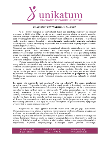 unikatum PRACOWNIA ROZWOJU O SOBISTEGO COACHING? CZY WARTO MU ZAUFAĆ? O ile dobrze pamiętam ze zjawiskiem takim jak coaching pierwszy raz miałam styczność w 2008 roku. Zdarzyło się to przy okazji mojego udziału w szkole trenerów. Tematem jednego ze zjazdów był rozwój osobisty trenera, jako nieodzowny element w pracy osób wykonujących zawód związany z bezpośrednim kontaktem z klientem. To spotkanie miało również szerszy kontekst – uświadomienie konieczności rozwoju osobistego w dzisiejszym, szybko zmieniający się świecie. Już przed udziałem w powyższym szkoleniu miałam tego świadomość. Natomiast sam coaching, jako metoda nie przekonał większości uczestników, w tym i mnie. Zadawanie pytań? Bez udzielania rad, konkretnych wskazówek udzielanych przez doświadczonego eksperta? Wtedy takie podejście wydało się dość podejrzaną metodą wręcz z pogranicza manipulacji. Zaprezentowana pokazowa sesja coachingu wzbudziła w nas jeszcze więcej wątpliwości i rozpoczęła burzliwą dyskusję, która prawie „rozłożyła na łopatki” dobrą atmosferę szkolenia. Po tym wydarzeniu na kilka lat zarzuciłam temat coachingu i wracanie do tego, co się wtedy zadziało. Ale dwa lub trzy lata temu to zasiane ziarno w trakcie szkolenia dla trenerów, w którym uczestniczyłam zaczęło kiełkować. Tą przysłowiową wodą na młyn dla mnie była rozmowa z osobą bardziej doświadczoną i godną zaufania. Spytała mnie wprost czy nie chciałabym zostać coachem, bo przecież to, co robię zawodowo jest mu tak bliskie. Jej zdaniem dostrzegła też we mnie predyspozycje niezbędne do podążania tą ścieżką. Wtedy znowu odrzuciłam tą myśl. Natomiast posiadane doświadczenie nakazało mi zbadać i drążyć temat. Bo czym tak naprawdę jest coaching? Jak on „działa”? Do czego mogłabym go wykorzystać? Te pytania siedziały gdzieś w mojej głowie. A im więcej czytałam na ten temat i wymieniałam doświadczenia zawodowe z innymi związanymi m. in. z doradztwem zawodowym tym bardziej mnie to interesowało. W końcu przekonałam się, że niektóre metody stosowane przeze mnie w pracy indywidualnej i grupowej w roli doradcy zawodowego znawcy tematu nazwaliby coachingowymi. Cóż to było dla mnie za odkrycie faktu, że jest metoda bardziej skuteczna i związana z moimi zasadami pracy z klientem. Pozostawało jeszcze kolejne ważne pytanie. To jak ja tym coachem mogę zostać? Jakie zasoby już mam, a jakie będą mi jeszcze niezbędne? Jak poznane metody będę mogła wykorzystać w swojej pracy zawodowej? Odpowiedź na moje pytanie nadeszła około dwa lata po jego postawieniu. Otrzymałam propozycję udziału w projekcie poszerzającym wiedzę i praktyczne umiejętności z zakresu coachingu osób pracujących w zawodach pomocowych. Pierwszy etap udziału doradców zawodowych w postaci szkolenia z zakresu coachingu dał solidne fundamenty tego, co miało się dopiero wydarzyć. Kluczowe dla mnie było zdobycie wiedzy od doświadczonych specjalistów w tej dziedzinie. Jednocześnie otrzymaliśmy od nich zapewnienie wsparcia merytorycznego na każdym etapie procesu coachingu. ul. Północna 34 95-200 Pabianice tel. 501.051.813 nip: 731-170-65-62 [email protected] www.unikatum.pl unikatum PRACOWNIA ROZWOJU O SOBISTEGO Dla mnie osobiście było to jak zapięcie pasów bezpieczeństwa przed rozpoczęciem jazdy samochodem marki Coaching. Ale to, co najciekawsze i kluczowe w całym projekcie miało się dopiero wydarzyć… Czekał nas coaching grupowy będący szansą dla odrębnej grupy bezrobotnych uczestników na refleksję nad własną sytuacją na rynku pracy stanowiącą swego rodzaju bazę do coachingu indywidualnego. Dodatkowym atutem miała być możliwość wymiany doświadczeń między uczestnikami, oswojenie się z metodą i integracja z grupą oraz swoimi przyszłymi coachami. Cdn. Autorka: Elżbieta Filutowicz – Cygan, Kontakt: [email protected] ul. Północna 34 95-200 Pabianice tel. 501.051.813 nip: 731-170-65-62 [email protected] www.unikatum.pl