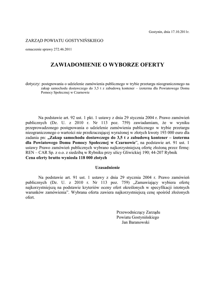 Gostynin, dnia 17.10.2011r. ZARZĄD POWIATU GOSTYNIŃSKIEGO oznaczenie sprawy 272.46.2011 ZAWIADOMIENIE O WYBORZE OFERTY dotyczy: postępowania o udzielenie zamówienia publicznego w trybie przetargu nieograniczonego na zakup samochodu dostawczego do 3,5 t z zabudową kontener – izoterma dla Powiatowego Domu Pomocy Społecznej w Czarnowie Na podstawie art. 92 ust. 1 pkt. 1 ustawy z dnia 29 stycznia 2004 r. Prawo zamówień publicznych (Dz. U. z 2010 r. Nr 113 poz. 759) zawiadamiam, Ŝe w wyniku przeprowadzonego postępowania o udzielenie zamówienia publicznego w trybie przetargu nieograniczonego o wartości nie przekraczającej wyraŜonej w złotych kwoty 193 000 euro dla zadania pn: „Zakup samochodu dostawczego do 3,5 t z zabudową kontener – izoterma dla Powiatowego Domu Pomocy Społecznej w Czarnowie”, na podstawie art. 91 ust. 1 ustawy Prawo zamówień publicznych wybrano najkorzystniejszą ofertę złoŜoną przez firmę: REN – CAR Sp. z o.o. z siedzibą w Rybniku przy ulicy Gliwickiej 190; 44-207 Rybnik Cena oferty brutto wyniosła 118 000 złotych Uzasadnienie Na podstawie art. 91 ust. 1 ustawy z dnia 29 stycznia 2004 r. Prawo zamówień publicznych (Dz. U. z 2010 r. Nr 113 poz. 759) „Zamawiający wybiera ofertę najkorzystniejszą na podstawie kryteriów oceny ofert określonych w specyfikacji istotnych warunków zamówienia”. Wybrana oferta zawiera najkorzystniejszą cenę spośród złoŜonych ofert. Przewodniczący Zarządu Powiatu Gostynińskiego Jan Baranowski