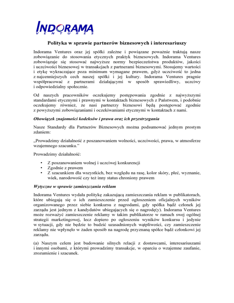 Polityka w sprawie partnerów biznesowych i interesariuszy Indorama Ventures oraz jej spółki zależne i powiązane poważnie traktują nasze zobowiązanie do stosowania etycznych praktyk biznesowych. Indorama Ventures zobowiązuje się stosować najwyższe normy bezpieczeństwa produktów, jakości i uczciwości biznesowej w transakcjach z partnerami biznesowymi. Stosujemy wartości i etykę wykraczające poza minimum wymagane prawem, gdyż uczciwość to jedna z najcenniejszych cech naszej spółki i jej kultury. Indorama Ventures pragnie współpracować z partnerami działającymi w sposób sprawiedliwy, uczciwy i odpowiedzialny społecznie. Od naszych pracowników oczekujemy postępowania zgodnie z najwyższymi standardami etycznymi i prawnymi w kontaktach biznesowych z Państwem, i podobnie oczekujemy również, że nasi partnerzy biznesowi będą postępować zgodnie z powyższymi zobowiązaniami i oczekiwaniami etycznymi w kontaktach z nami. Obowiązek znajomości kodeksów i prawa oraz ich przestrzegania Nasze Standardy dla Partnerów Biznesowych można podsumować jednym prostym zdaniem: „Prowadzimy działalność z poszanowaniem wolności, uczciwości, prawa, w atmosferze wzajemnego szacunku.” Prowadzimy działalność: • • • Z poszanowaniem wolnej i uczciwej konkurencji Zgodnie z prawem Z szacunkiem dla wszystkich, bez względu na rasę, kolor skóry, płeć, wyznanie, wiek, narodowość czy też inny status chroniony prawem Wytyczne w sprawie zamieszczania reklam Indorama Ventures wydała politykę zakazującą zamieszczania reklam w publikatorach, które ubiegają się o ich zamieszczenie przed ogłoszeniem oficjalnych wyników organizowanego przez siebie konkursu z nagrodami, gdy spółka bądź członek jej zarządu jest jednym z kandydatów ubiegających się o nagrodę(y). Indorama Ventures może rozważyć zamieszczenie reklamy w takim publikatorze w ramach swej ogólnej strategii marketingowej, lecz dopiero po ogłoszeniu wyników konkursu i jedynie w sytuacji, gdy nie będzie to budzić uzasadnionych wątpliwości, czy zamieszczenie reklamy nie wpłynęło w żaden sposób na nagrodę przyznaną spółce bądź członkowi jej zarządu. (a) Naszym celem jest budowanie silnych relacji z dostawcami, interesariuszami i innymi osobami, z którymi prowadzimy transakcje, w oparciu o wzajemne zaufanie, zrozumienie i szacunek. (b) W transakcjach tych oczekujemy, że nasi partnerzy będą przestrzegać zasad biznesowych zgodnych z naszymi zasadami. (c) Spółki Indorama Ventures prowadzą działalność zgodnie z zasadami uczciwej konkurencji i zgodnie z właściwymi przepisami. Wzajemny szacunek Indorama Ventures zobowiązuje się przestrzegać polityki równych szans i zapewnienia atmosfery wolnej od molestowania. W obszarze zatrudnienia – który obejmuje składanie podań o pracę, awansy, nagrody, dostęp do szkoleń, przydział obowiązków, wynagrodzenia, świadczenia, dyscyplinę i zwolnienia – partnerzy biznesowi nie mogą dopuszczać się dyskryminacji na tle rasy, koloru skóry, płci, wyznania, wieku, narodowości, pochodzenia, niepełnosprawności, statusu wojskowego bądź innego statusu chronionego prawem. Indorama Ventures dąży do zapewnienia środowiska pracy gwarantującego poszanowanie godności i wartości każdej jednostki oraz wolnego od molestowania i dyskryminacji. Polityka Indorama Ventures przekracza wymogi prawne in plus. Indorama Ventures jest obowiązana dbać, aby konsumenci mogli ufać bezpieczeństwu i jakości jej produktów. Od partnerów biznesowych oczekujemy dostarczania towarów i usług spełniających wszystkie normy państwowe oraz wszystkie uzgodnione normy w zakresie jakości i bezpieczeństwa. Wszelkie zagrożenia związane z bezpieczeństwem produktów należy bezzwłocznie zgłaszać Indorama Ventures. Jakość i bezpieczeństwo produktów Bardzo ważne jest, aby Indorama Ventures oraz jej partnerzy biznesowi zapewniali zgodność składników i produktów z normami jakości i bezpieczeństwa żywności. Od partnerów biznesowych oczekujemy bezzwłocznego zgłaszania Indorama Ventures wszelkich zastrzeżeń dotyczących jakości i bezpieczeństwa produktów. Warunki pracy Poszukujemy partnerów biznesowych, którzy zapewniają bezpieczne i higieniczne środowisko pracy, aby zapobiegać możliwym do uniknięcia wypadkom przy pracy i obrażeniom ciała oraz by promować ogólny dobrostan pracowników. Zawieramy umowy z fabrykami, które poza przestrzeganiem wszystkich przepisów z zakresu ochrony środowiska podzielają nasze zobowiązanie do odpowiedzialnego korzystania z zasobów naturalnych – tj. eliminacji odpadów i zmniejszania ich ilości, minimalizacji śladu węglowego, oferowania asortymentu produktów naturalnych, organicznych i ekologicznych w zależności od popytu rynkowego i preferencji odbiorcy oraz tworzenia struktur godzących potrzeby środowiskowe, społeczne i biznesowe. Praktyki biznesowe Indorama Ventures oczekuje, że partnerzy biznesowi będą postępować w sposób uczciwy i zgodny z prawem oraz właściwie korzystać z danych dotyczących konkurencji, informacji zastrzeżonych i innego rodzaju własności intelektualnej, a także przestrzegać wymogów prawnych w zakresie uczciwej konkurencji, przepisów antymonopolowych oraz praktykować marketing oparty na poprawnych i prawdziwych informacjach. Własność intelektualna Nie dopuszcza się wykorzystywania przez partnerów biznesowych bez zezwolenia znaków towarowych, znaków usługowych, znaków graficznych, projektów i innego rodzaju własności intelektualnej, do której Indorama Ventures posiada stwierdzone prawa. Partnerzy biznesowi nie mogą bez udokumentowanej zgody wykorzystywać, powielać, dysponować dostępem, modyfikować, pobierać, rozpowszechniać i w inny sposób powielać dzieł chronionych prawem autorskim, znaków towarowych spółki, nazw domen oraz patentów. Ochrona informacji należących do Spółki i informacji 