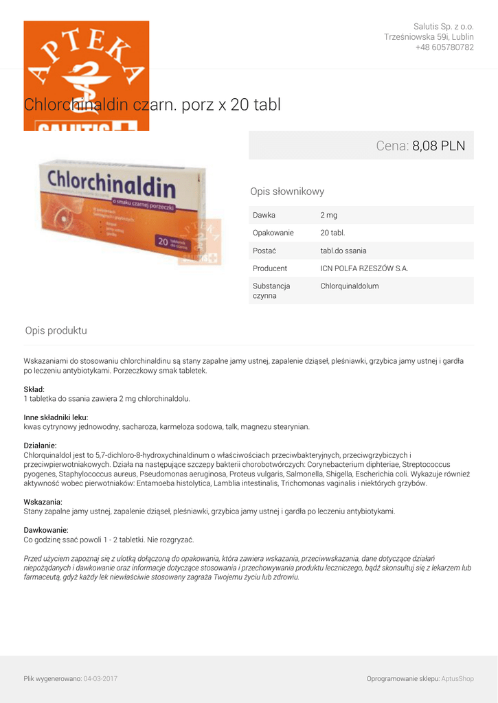 Salutis Sp. z o.o. Trześniowska 59i, Lublin +48 605780782 Chlorchinaldin czarn. porz x 20 tabl Cena: 8,08 PLN Opis słownikowy Dawka 2 mg Opakowanie 20 tabl. Postać tabl.do ssania Producent ICN POLFA RZESZÓW S.A. Substancja czynna Chlorquinaldolum Opis produktu Wskazaniami do stosowaniu chlorchinaldinu są stany zapalne jamy ustnej, zapalenie dziąseł, pleśniawki, grzybica jamy ustnej i gardła po leczeniu antybiotykami. Porzeczkowy smak tabletek. Skład: 1 tabletka do ssania zawiera 2 mg chlorchinaldolu. Inne składniki leku: kwas cytrynowy jednowodny, sacharoza, karmeloza sodowa, talk, magnezu stearynian. Działanie: Chlorquinaldol jest to 5,7-dichloro-8-hydroxychinaldinum o właściwościach przeciwbakteryjnych, przeciwgrzybiczych i przeciwpierwotniakowych. Działa na następujące szczepy bakterii chorobotwórczych: Corynebacterium diphteriae, Streptococcus pyogenes, Staphylococcus aureus, Pseudomonas aeruginosa, Proteus vulgaris, Salmonella, Shigella, Escherichia coli. Wykazuje również aktywność wobec pierwotniaków: Entamoeba histolytica, Lamblia intestinalis, Trichomonas vaginalis i niektórych grzybów. Wskazania: Stany zapalne jamy ustnej, zapalenie dziąseł, pleśniawki, grzybica jamy ustnej i gardła po leczeniu antybiotykami. Dawkowanie: Co godzinę ssać powoli 1 - 2 tabletki. Nie rozgryzać. Przed użyciem zapoznaj się z ulotką dołączoną do opakowania, która zawiera wskazania, przeciwwskazania, dane dotyczące działań niepożądanych i dawkowanie oraz informacje dotyczące stosowania i przechowywania produktu leczniczego, bądź skonsultuj się z lekarzem lub farmaceutą, gdyż każdy lek niewłaściwie stosowany zagraża Twojemu życiu lub zdrowiu. Plik wygenerowano: 04-03-2017 Powered by TCPDF (www.tcpdf.org) Oprogramowanie sklepu: AptusShop