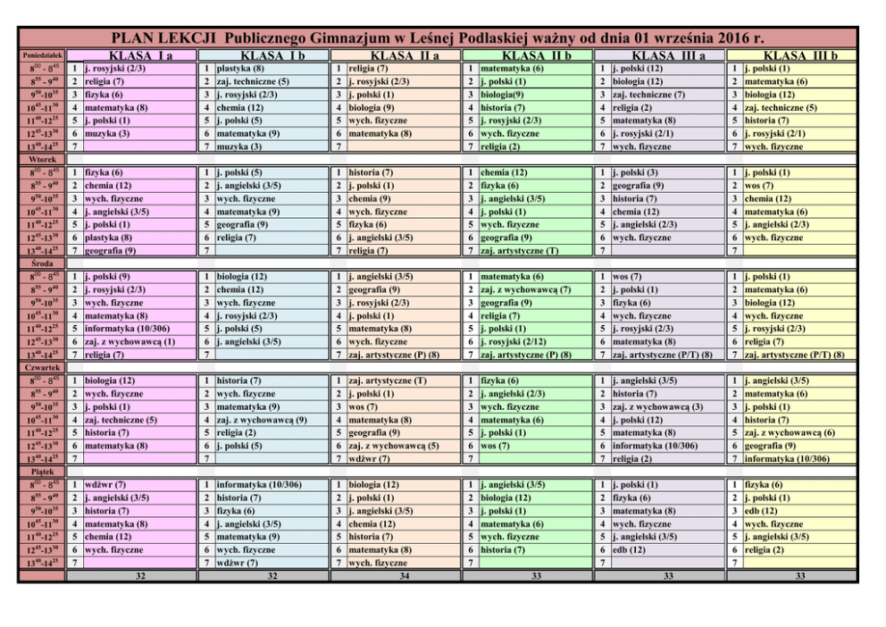 PLAN LEKCJI Publicznego Gimnazjum w Leśnej Podlaskiej ważny od dnia 01 września 2016 r. KLASA I a Poniedziałek 800 - 845 855 - 940 950-1035 1045-1130 1140-1225 1245-1330 1340-1425 Wtorek 800 - 845 855 - 940 950-1035 1045-1130 1140-1225 1245-1330 1340-1425 Środa 800 - 845 855 - 940 950-1035 1045-1130 1140-1225 1245-1330 1340-1425 Czwartek 800 - 845 855 - 940 950-1035 1045-1130 1140-1225 1245-1330 1340-1425 Piątek 800 - 845 55 8 -9 40 950-1035 1045-1130 1140-1225 1245-1330 1340-1425 KLASA I b KLASA II a KLASA II b KLASA III a KLASA III b 1 2 3 4 5 6 7 j. rosyjski (2/3) religia (7) fizyka (6) matematyka (8) j. polski (1) muzyka (3) 1 2 3 4 5 6 7 plastyka (8) zaj. techniczne (5) j. rosyjski (2/3) chemia (12) j. polski (5) matematyka (9) muzyka (3) 1 2 3 4 5 6 7 religia (7) j. rosyjski (2/3) j. polski (1) biologia (9) wych. fizyczne matematyka (8) 1 2 3 4 5 6 7 matematyka (6) j. polski (1) biologia(9) historia (7) j. rosyjski (2/3) wych. fizyczne religia (2) 1 2 3 4 5 6 7 j. polski (12) biologia (12) zaj. techniczne (7) religia (2) matematyka (8) j. rosyjski (2/1) wych. fizyczne 1 2 3 4 5 6 7 j. polski (1) matematyka (6) biologia (12) zaj. techniczne (5) historia (7) j. rosyjski (2/1) wych. fizyczne 1 2 3 4 5 6 7 fizyka (6) chemia (12) wych. fizyczne j. angielski (3/5) j. polski (1) plastyka (8) geografia (9) 1 2 3 4 5 6 7 j. polski (5) j. angielski (3/5) wych. fizyczne matematyka (9) geografia (9) religia (7) 1 2 3 4 5 6 7 historia (7) j. polski (1) chemia (9) wych. fizyczne fizyka (6) j. angielski (3/5) religia (7) 1 2 3 4 5 6 7 chemia (12) fizyka (6) j. angielski (3/5) j. polski (1) wych. fizyczne geografia (9) zaj. artystyczne (T) 1 2 3 4 5 6 7 j. polski (3) geografia (9) historia (7) chemia (12) j. angielski (2/3) wych. fizyczne 1 2 3 4 5 6 7 j. polski (1) wos (7) chemia (12) matematyka (6) j. angielski (2/3) wych. fizyczne 1 2 3 4 5 6 7 j. polski (9) j. rosyjski (2/3) wych. fizyczne matematyka (8) informatyka (10/306) zaj. z wychowawcą (1) religia (7) 1 2 3 4 5 6 7 biologia (12) chemia (12) wych. fizyczne j. rosyjski (2/3) j. polski (5) j. angielski (3/5) 1 2 3 4 5 6 7 j. angielski (3/5) geografia (9) j. rosyjski (2/3) j. polski (1) matematyka (8) wych. fizyczne zaj. artystyczne (P) (8) 1 2 3 4 5 6 7 matematyka (6) zaj. z wychowawcą (7) geografia (9) religia (7) j. polski (1) j. rosyjski (2/12) zaj. artystyczne (P) (8) 1 2 3 4 5 6 7 wos (7) j. polski (1) fizyka (6) wych. fizyczne j. rosyjski (2/3) matematyka (8) zaj. artystyczne (P/T) (8) 1 2 3 4 5 6 7 j. polski (1) matematyka (6) biologia (12) wych. fizyczne j. rosyjski (2/3) religia (7) zaj. artystyczne (P/T) (8) 1 2 3 4 5 6 7 biologia (12) wych. fizyczne j. polski (1) zaj. techniczne (5) historia (7) matematyka (8) 1 2 3 4 5 6 7 historia (7) wych. fizyczne matematyka (9) zaj. z wychowawcą (9) religia (2) j. polski (5) 1 2 3 4 5 6 7 zaj. artystyczne (T) j. polski (1) wos (7) matematyka (8) geografia (9) zaj. z wychowawcą (5) wdżwr (7) 1 2 3 4 5 6 7 fizyka (6) j. angielski (2/3) wych. fizyczne matematyka (6) j. polski (1) wos (7) 1 2 3 4 5 6 7 j. angielski (3/5) historia (7) zaj. z wychowawcą (3) j. polski (12) matematyka (8) informatyka (10/306) religia (2) 1 2 3 4 5 6 7 j. angielski (3/5) matematyka (6) j. polski (1) historia (7) zaj. z wychowawcą (6) geografia (9) informatyka (10/306) 1 2 3 4 5 6 7 wdżwr (7) j. angielski (3/5) historia (7) matematyka (8) chemia (12) wych. fizyczne 1 2 3 4 5 6 7 informatyka (10/306) historia (7) fizyka (6) j. angielski (3/5) matematyka (9) wych. fizyczne wdżwr (7) 32 1 2 3 4 5 6 7 biologia (12) j. polski (1) j. angielski (3/5) chemia (12) historia (7) matematyka (8) wych. fizyczne 34 1 2 3 4 5 6 7 j. angielski (3/5) biologia (12) j. polski (1) matematyka (6) wych. fizyczne historia (7) 1 2 3 4 5 6 7 j. polski (1) fizyka (6) matematyka (8) wych. fizyczne j. angielski (3/5) edb (12) 1 2 3 4 5 6 7 fizyka (6) j. polski (1) edb (12) wych. fizyczne j. angielski (3/5) religia (2) 32 33 33 33