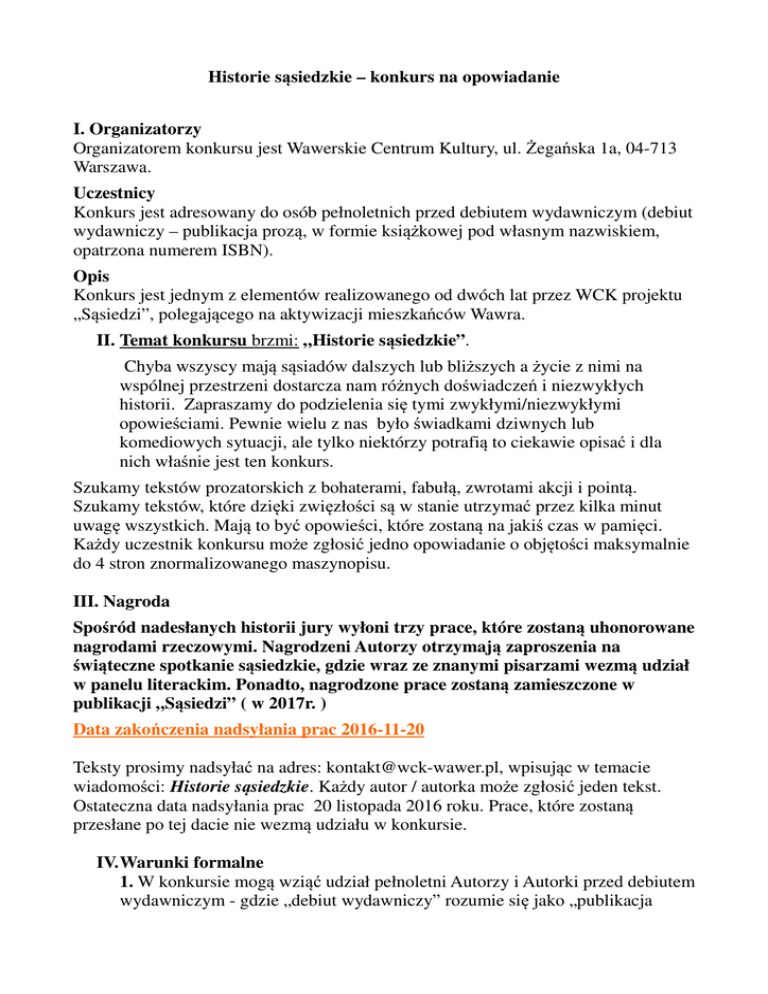 Historie sąsiedzkie – konkurs na opowiadanie I. Organizatorzy Organizatorem konkursu jest Wawerskie Centrum Kultury, ul. Żegańska 1a, 04-713 Warszawa. Uczestnicy Konkurs jest adresowany do osób pełnoletnich przed debiutem wydawniczym (debiut wydawniczy – publikacja prozą, w formie książkowej pod własnym nazwiskiem, opatrzona numerem ISBN). Opis Konkurs jest jednym z elementów realizowanego od dwóch lat przez WCK projektu „Sąsiedzi”, polegającego na aktywizacji mieszkańców Wawra. II. Temat konkursu brzmi: „Historie sąsiedzkie”. Chyba wszyscy mają sąsiadów dalszych lub bliższych a życie z nimi na wspólnej przestrzeni dostarcza nam różnych doświadczeń i niezwykłych historii. Zapraszamy do podzielenia się tymi zwykłymi/niezwykłymi opowieściami. Pewnie wielu z nas było świadkami dziwnych lub komediowych sytuacji, ale tylko niektórzy potrafią to ciekawie opisać i dla nich właśnie jest ten konkurs. Szukamy tekstów prozatorskich z bohaterami, fabułą, zwrotami akcji i pointą. Szukamy tekstów, które dzięki zwięzłości są w stanie utrzymać przez kilka minut uwagę wszystkich. Mają to być opowieści, które zostaną na jakiś czas w pamięci. Każdy uczestnik konkursu może zgłosić jedno opowiadanie o objętości maksymalnie do 4 stron znormalizowanego maszynopisu. III. Nagroda Spośród nadesłanych historii jury wyłoni trzy prace, które zostaną uhonorowane nagrodami rzeczowymi. Nagrodzeni Autorzy otrzymają zaproszenia na świąteczne spotkanie sąsiedzkie, gdzie wraz ze znanymi pisarzami wezmą udział w panelu literackim. Ponadto, nagrodzone prace zostaną zamieszczone w publikacji „Sąsiedzi” ( w 2017r. ) Data zakończenia nadsyłania prac 2016-11-20 Teksty prosimy nadsyłać na adres: [email protected], wpisując w temacie wiadomości: Historie sąsiedzkie. Każdy autor / autorka może zgłosić jeden tekst. Ostateczna data nadsyłania prac 20 listopada 2016 roku. Prace, które zostaną przesłane po tej dacie nie wezmą udziału w konkursie. IV.Warunki formalne 1. W konkursie mogą wziąć udział pełnoletni Autorzy i Autorki przed debiutem wydawniczym - gdzie „debiut wydawniczy” rozumie się jako „publikacja prozą w formie książkowej pod własnym nazwiskiem, opatrzona numerem ISBN” 2. Zgłoszone opowiadanie musi mieć charakter autorski, musi być napisane w języku polskim oraz nie może być wcześniej publikowane w jakiejkolwiek formie. Opowiadanie nie może przekraczać 4 stron maszynopisu, gdzie jedna strona to 5 tys. znaków ze spacjami. Jeden Autor/Autorka może zgłosić tylko jedno opowiadanie. 3. Opowiadanie w pliku doc/docx/odt należy przesłać do 20 listopada 2016r, do godz. 23.59, na adres: [email protected]. Prosimy o nie przysyłanie plików PDF 4. Nazwa pliku z opowiadaniem powinna zawierać tytuł historii. 5. Do e-maila ze zgłoszonym opowiadaniem prosimy dołączyć plik z następującymi informacjami:imię i nazwisko autora, rok urodzenia, numer telefonu. 6. Zgłoszenie opowiadania jest równoznaczne z zaakceptowaniem Regulaminu Konkursu oraz z przekazaniem na rzecz Organizatora autorskich praw majątkowych do nadesłanego opowiadania, bez ograniczeń czasowych co oznacza zgodę na jego publikację bez dodatkowego wynagrodzenia. 7. Przesyłając opowiadanie Autor/Autorka oświadcza, że nadesłany utwór jest jego autorstwa i nie zawiera wad prawnych oraz, że Autor/Autorka odpowiada finansowo za wszelkie potencjalne roszczenia z tytułu naruszenia praw osób trzecich. 8. Nadesłane opowiadania oceni jury. 9. Jury oceniając prace weźmie pod uwagę następujące kryteria: a) oryginalność ujęcia zdarzenia. b) umiejętność opisania zdarzenia w krótkiej formie. c) bogate i oryginalne słownictwo. 10. Jury wybierze trzy najlepsze prace, które zostaną nagrodzone. 11. Wszyscy uczestnicy konkursu zostaną zaproszeni do udziału w świątecznym spotkaniu sąsiedzkim(grudzień 2016 r.) 12. Organizatorzy zastrzegają sobie prawo do przyznania dodatkowych wyróżnień 13. Wyniki konkursu zostaną opublikowane na stronie internetowej www.wck-wawer.pl do 28 listopada 2016r.