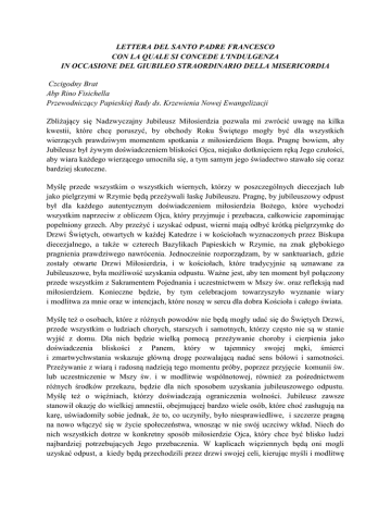 LETTERA DEL SANTO PADRE FRANCESCO CON LA QUALE SI CONCEDE L'INDULGENZA IN OCCASIONE DEL GIUBILEO STRAORDINARIO DELLA MISERICORDIA Czcigodny Brat Abp Rino Fisichella Przewodniczący Papieskiej Rady ds. Krzewienia Nowej Ewangelizacji Zbliżający się Nadzwyczajny Jubileusz Miłosierdzia pozwala mi zwrócić uwagę na kilka kwestii, które chcę poruszyć, by obchody Roku Świętego mogły być dla wszystkich wierzących prawdziwym momentem spotkania z miłosierdziem Boga. Pragnę bowiem, aby Jubileusz był żywym doświadczeniem bliskości Ojca, niejako dotknięciem ręką Jego czułości, aby wiara każdego wierzącego umocniła się, a tym samym jego świadectwo stawało się coraz bardziej skuteczne. Myślę przede wszystkim o wszystkich wiernych, którzy w poszczególnych diecezjach lub jako pielgrzymi w Rzymie będą przeżywali łaskę Jubileuszu. Pragnę, by jubileuszowy odpust był dla każdego autentycznym doświadczeniem miłosierdzia Bożego, które wychodzi wszystkim naprzeciw z obliczem Ojca, który przyjmuje i przebacza, całkowicie zapominając popełniony grzech. Aby przeżyć i uzyskać odpust, wierni mają odbyć krótką pielgrzymkę do Drzwi Świętych, otwartych w każdej Katedrze i w kościołach wyznaczonych przez Biskupa diecezjalnego, a także w czterech Bazylikach Papieskich w Rzymie, na znak głębokiego pragnienia prawdziwego nawrócenia. Jednocześnie rozporządzam, by w sanktuariach, gdzie zostały otwarte Drzwi Miłosierdzia, i w kościołach, które tradycyjnie są uznawane za Jubileuszowe, była możliwość uzyskania odpustu. Ważne jest, aby ten moment był połączony przede wszystkim z Sakramentem Pojednania i uczestnictwem w Mszy św. oraz refleksją nad miłosierdziem. Konieczne będzie, by tym celebracjom towarzyszyło wyznanie wiary i modlitwa za mnie oraz w intencjach, które noszę w sercu dla dobra Kościoła i całego świata. Myślę też o osobach, które z różnych powodów nie będą mogły udać się do Świętych Drzwi, przede wszystkim o ludziach chorych, starszych i samotnych, którzy często nie są w stanie wyjść z domu. Dla nich będzie wielką pomocą przeżywanie choroby i cierpienia jako doświadczenia bliskości z Panem, który w tajemnicy swojej męki, śmierci i zmartwychwstania wskazuje główną drogę pozwalającą nadać sens bólowi i samotności. Przeżywanie z wiarą i radosną nadzieją tego momentu próby, poprzez przyjęcie komunii św. lub uczestniczenie w Mszy św. i w modlitwie wspólnotowej, również za pośrednictwem różnych środków przekazu, będzie dla nich sposobem uzyskania jubileuszowego odpustu. Myślę też o więźniach, którzy doświadczają ograniczenia wolności. Jubileusz zawsze stanowił okazję do wielkiej amnestii, obejmującej bardzo wiele osób, które choć zasługują na karę, uświadomiły sobie jednak, że to, co uczyniły, było niesprawiedliwe, i szczerze pragną na nowo włączyć się w życie społeczeństwa, wnosząc w nie swój uczciwy wkład. Niech do nich wszystkich dotrze w konkretny sposób miłosierdzie Ojca, który chce być blisko ludzi najbardziej potrzebujących Jego przebaczenia. W kaplicach więziennych będą oni mogli uzyskać odpust, a kiedy będą przechodzili przez drzwi swojej celi, kierując myśli i modlitwę do Ojca, niech za każdym razem ten gest oznacza dla nich przejście przez Drzwi Święte, ponieważ miłosierdzie Boże, które potrafi przemienić serca, jest również w stanie przeobrazić kraty w doświadczenie wolności. Prosiłem, by Kościół odkrył w tym czasie jubileuszowym bogactwo zawarte w uczynkach miłosierdzia co do ciała i duszy. Doświadczenie miłosierdzia staje się bowiem widzialne w świadectwie konkretnych znaków, jak uczył nas sam Jezus. Za każdym razem, kiedy wierny sam wykona jeden lub kilka z tych uczynków, z pewnością otrzyma jubileuszowy odpust. Wiąże się z tym zaangażowanie w życie miłosierdziem, aby otrzymać łaskę pełnego i głębokiego przebaczenia mocą miłości Ojca, który nikogo nie wyklucza. Będzie to więc pełny odpust jubileuszowy, owoc samego wydarzenia, które jest celebrowane i przeżywane z wiarą, nadzieją i miłością. Jubileuszowy odpust można będzie uzyskać również dla zmarłych. Jesteśmy z nimi związani świadectwem wiary i miłości, które nam zostawili. Tak jak pamiętamy o nich podczas Mszy św., tak też możemy, w wielkiej tajemnicy świętych obcowania, modlić się za nich, aby miłosierne oblicze Ojca uwolniło ich od wszelkich pozostałości winy i by mógł On przygarnąć ich do siebie w nieskończonej szczęśliwości. Jednym z poważnych problemów naszych czasów jest z pewnością zmodyfikowany stosunek do życia. Bardzo rozpowszechniona mentalność doprowadziła do utraty należytej wrażliwości indywidualnej i społecznej na kwestię przyjmowania nowego życia. Dramat aborcji przeżywany jest przez niektóre osoby ze świadomością powierzchowną, jakby niemal nie zdawały sobie sprawy z tego, jak wielkim złem jest ten akt. Wiele innych natomiast, choć przeżywa ten moment jako porażkę, uważa, że nie mają innej drogi. Myślę w szczególności o wszystkich kobietach, które poddały się aborcji. Dobrze znam uwarunkowania, które doprowadziły je do podjęcia tej decyzji. Wiem, że jest to dramat egzystencjalny i moralny. Spotkałem wiele kobiet, które nosiły w sercu blizny pozostawione przez ten ciężki i bolesny wybór. To, co się wydarzyło, jest głęboko niesłuszne; jednakże tylko wtedy, gdy zrozumie się to w prawdzie, można nie stracić nadziei. Przebaczenia Bożego nie można odmówić nikomu, kto żałuje, zwłaszcza jeśli ze szczerym sercem przystępuje do Sakramentu Spowiedzi, by pojednać się z Ojcem. Również z tego powodu postanowiłem, mimo wszelkich przeciwnych rozporządzeń, upoważnić wszystkich kapłanów w Roku Jubileuszowym do rozgrzeszenia z grzechu aborcji osób, które jej dokonały, żałują tego z całego ser