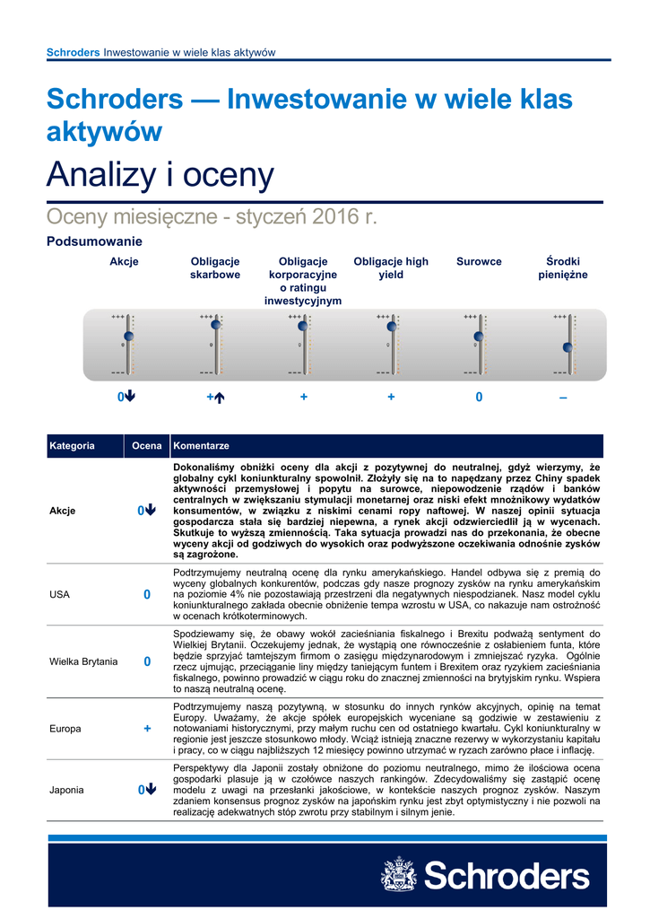 Schroders Inwestowanie w wiele klas aktywów Schroders — Inwestowanie w wiele klas aktywów Analizy i oceny Oceny miesięczne - styczeń 2016 r. Podsumowanie Akcje Obligacje skarbowe Obligacje korporacyjne o ratingu inwestycyjnym Obligacje high yield Surowce Środki pieniężne 0 + + + 0 – Kategoria Akcje USA Wielka Brytania Europa Japonia Ocena Komentarze 0 Dokonaliśmy obniżki oceny dla akcji z pozytywnej do neutralnej, gdyż wierzymy, że globalny cykl koniunkturalny spowolnił. Złożyły się na to napędzany przez Chiny spadek aktywności przemysłowej i popytu na surowce, niepowodzenie rządów i banków centralnych w zwiększaniu stymulacji monetarnej oraz niski efekt mnożnikowy wydatków konsumentów, w związku z niskimi cenami ropy naftowej. W naszej opinii sytuacja gospodarcza stała się bardziej niepewna, a rynek akcji odzwierciedlił ją w wycenach. Skutkuje to wyższą zmiennością. Taka sytuacja prowadzi nas do przekonania, że obecne wyceny akcji od godziwych do wysokich oraz podwyższone oczekiwania odnośnie zysków są zagrożone. 0 Podtrzymujemy neutralną ocenę dla rynku amerykańskiego. Handel odbywa się z premią do wyceny globalnych konkurentów, podczas gdy nasze prognozy zysków na rynku amerykańskim na poziomie 4% nie pozostawiają przestrzeni dla negatywnych niespodzianek. Nasz model cyklu koniunkturalnego zakłada obecnie obniżenie tempa wzrostu w USA, co nakazuje nam ostrożność w ocenach krótkoterminowych. 0 Spodziewamy się, że obawy wokół zacieśniania fiskalnego i Brexitu podważą sentyment do Wielkiej Brytanii. Oczekujemy jednak, że wystąpią one równocześnie z osłabieniem funta, które będzie sprzyjać tamtejszym firmom o zasięgu międzynarodowym i zmniejszać ryzyka. Ogólnie rzecz ujmując, przeciąganie liny między taniejącym funtem i Brexitem oraz ryzykiem zacieśniania fiskalnego, powinno prowadzić w ciągu roku do znacznej zmienności na brytyjskim rynku. Wspiera to naszą neutralną ocenę. + Podtrzymujemy naszą pozytywną, w stosunku do innych rynków akcyjnych, opinię na temat Europy. Uważamy, że akcje spółek europejskich wyceniane są godziwie w zestawieniu z notowaniami historycznymi, przy małym ruchu cen od ostatniego kwartału. Cykl koniunkturalny w regionie jest jeszcze stosunkowo młody. Wciąż istnieją znaczne rezerwy w wykorzystaniu kapitału i pracy, co w ciągu najbliższych 12 miesięcy powinno utrzymać w ryzach zarówno płace i inflację. 0 Perspektywy dla Japonii zostały obniżone do poziomu neutralnego, mimo że ilościowa ocena gospodarki plasuje ją w czołówce naszych rankingów. Zdecydowaliśmy się zastąpić ocenę modelu z uwagi na przesłanki jakościowe, w kontekście naszych prognoz zysków. Naszym zdaniem konsensus prognoz zysków na japońskim rynku jest zbyt optymistyczny i nie pozwoli na realizację adekwatnych stóp zwrotu przy stabilnym i silnym jenie. Schroders Inwestowanie w wiele klas aktywów Kraje Pacyfiku (bez Japonii) Rynki wschodzące Kategoria Obligacje skarbowe USA 0 Wyceny w regionie Pacyfiku (bez Japonii) pozostają atrakcyjne. Niemniej jednak momentum jest relatywnie niekorzystne, szczególnie w sektorach wrażliwych na spowolnienie w Chinach. Pomimo sześciu obniżek stóp i wzmocnienia bodźców fiskalnych, tempo rozwoju nie rośnie. Odpływy kapitału stają się poważnym problemem, wraz ze wzrostem presji na dewaluację juana. Dlatego, w obliczu braku średnioterminowych katalizatorów wzrostu, pozostawiamy naszą ocenę na poziomie neutralnym. – Nasza ocena rynków wschodzących pozostaje negatywna. Po dłuższym okresie gorszych wyników rynków wschodzących można śmiało założyć, że wiele ze złych wiadomości zostało już ujętych w cenach. Ogólnie rzecz ujmując, nie jesteśmy przekonani, że spowolnienie cyklu, zwiększona niepewność wokół perspektyw dla chińskiej gospodarki i ryzyko fiskalne zostały w pełni zdyskontowane przez rynek. Wyższa ocena nie byłaby zasłużona. Podczas gdy wyceny na rynkach wschodzących wyglądają atrakcyjnie, zmagamy się z uzasadnieniem ponownej zmiany nastawienia. Naszym zdaniem rynki wschodzące nie są tanie bez powodu. Ocena Komentarze + Podwyższyliśmy naszą ocenę jakościową do pozytywnej, w związku z wyższą awersją do ryzyka, średniookresowym brakiem stymulacji monetarnej w krajach rozwiniętych i podtrzymaniem luki między prognozami FED, a wycenami rynkowymi. Ten pozytywny ogląd sytuacji jest wciąż wyrażany przez rozwinięte rynki o dużej wrażliwości na ceny surowców, takie jak Wielka Brytania lub Australia. 0 Naszą opinię na temat obligacji amerykańskich zmieniamy na neutralną, w związku z niedawnym wsparciem dla rynku długu poprzez dewaluację juana i związanej z nią niepewnością, co do przyszłej inflacji. Znaczenie dla oceny miały także zacieśnianie przez USA finansowania płynności i umocnienie amerykańskiej waluty. Wielka Brytania + Utrzymujemy pozytywną opinię na temat Wielkiej Brytanii. Z uwagi na niepewność dotyczącą rynków wschodzących i niskie ceny surowców, wciąż preferujemy alokację opartą o wypłaszczenie krzywej. Niemcy 0 Nasza ocena niemieckich obligacji pozostaje neutralna. Nie oczekujemy już "wystromienia się" krzywej po ostatnich spadkach, ponieważ scenariusz zakładający agresywną postawę Europejskiego Banku Centralnego i wyższe oczekiwania inflacyjne nie zmaterializował się. Japonia 0 Pomimo nieatrakcyjnie niskich rentowności, pozostajemy przy neutralnej ocenie dla średnio- i długoterminowych obligacji japońskich, mając na uwadze agresywne wsparcie przez Bank Japonii. Obligacje amerykańskie powiązane z inflacją Rynki wschodzące Kategoria Obligacje korporacyjne na poziomie inwestycyjnym USA Europa 0 – Ocena Podtrzymujemy neutralną ocenę papierów wartościowych powiązanych z inflacją, choć widzimy pewne ryzyko pogorszenia, w związku z krótkoterminową słabością cen surowców. Z tego powodu podtrz