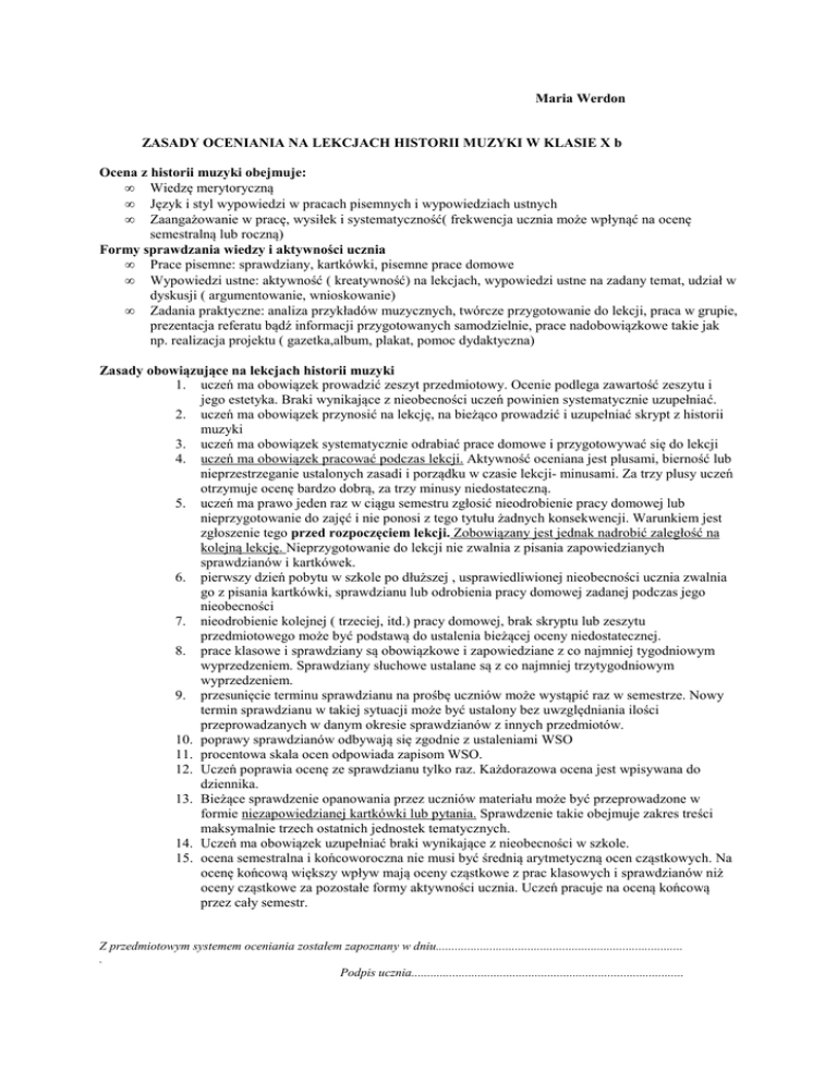 Maria Werdon ZASADY OCENIANIA NA LEKCJACH HISTORII MUZYKI W KLASIE X b Ocena z historii muzyki obejmuje: • Wiedzę merytoryczną • Język i styl wypowiedzi w pracach pisemnych i wypowiedziach ustnych • Zaangażowanie w pracę, wysiłek i systematyczność( frekwencja ucznia może wpłynąć na ocenę semestralną lub roczną) Formy sprawdzania wiedzy i aktywności ucznia • Prace pisemne: sprawdziany, kartkówki, pisemne prace domowe • Wypowiedzi ustne: aktywność ( kreatywność) na lekcjach, wypowiedzi ustne na zadany temat, udział w dyskusji ( argumentowanie, wnioskowanie) • Zadania praktyczne: analiza przykładów muzycznych, twórcze przygotowanie do lekcji, praca w grupie, prezentacja referatu bądź informacji przygotowanych samodzielnie, prace nadobowiązkowe takie jak np. realizacja projektu ( gazetka,album, plakat, pomoc dydaktyczna) Zasady obowiązujące na lekcjach historii muzyki 1. uczeń ma obowiązek prowadzić zeszyt przedmiotowy. Ocenie podlega zawartość zeszytu i jego estetyka. Braki wynikające z nieobecności uczeń powinien systematycznie uzupełniać. 2. uczeń ma obowiązek przynosić na lekcję, na bieżąco prowadzić i uzupełniać skrypt z historii muzyki 3. uczeń ma obowiązek systematycznie odrabiać prace domowe i przygotowywać się do lekcji 4. uczeń ma obowiązek pracować podczas lekcji. Aktywność oceniana jest plusami, bierność lub nieprzestrzeganie ustalonych zasadi i porządku w czasie lekcji- minusami. Za trzy plusy uczeń otrzymuje ocenę bardzo dobrą, za trzy minusy niedostateczną. 5. uczeń ma prawo jeden raz w ciągu semestru zgłosić nieodrobienie pracy domowej lub nieprzygotowanie do zajęć i nie ponosi z tego tytułu żadnych konsekwencji. Warunkiem jest zgłoszenie tego przed rozpoczęciem lekcji. Zobowiązany jest jednak nadrobić zaległość na kolejną lekcję. Nieprzygotowanie do lekcji nie zwalnia z pisania zapowiedzianych sprawdzianów i kartkówek. 6. pierwszy dzień pobytu w szkole po dłuższej , usprawiedliwionej nieobecności ucznia zwalnia go z pisania kartkówki, sprawdzianu lub odrobienia pracy domowej zadanej podczas jego nieobecności 7. nieodrobienie kolejnej ( trzeciej, itd.) pracy domowej, brak skryptu lub zeszytu przedmiotowego może być podstawą do ustalenia bieżącej oceny niedostatecznej. 8. prace klasowe i sprawdziany są obowiązkowe i zapowiedziane z co najmniej tygodniowym wyprzedzeniem. Sprawdziany słuchowe ustalane są z co najmniej trzytygodniowym wyprzedzeniem. 9. przesunięcie terminu sprawdzianu na prośbę uczniów może wystąpić raz w semestrze. Nowy termin sprawdzianu w takiej sytuacji może być ustalony bez uwzględniania ilości przeprowadzanych w danym okresie sprawdzianów z innych przedmiotów. 10. poprawy sprawdzianów odbywają się zgodnie z ustaleniami WSO 11. procentowa skala ocen odpowiada zapisom WSO. 12. Uczeń poprawia ocenę ze sprawdzianu tylko raz. Każdorazowa ocena jest wpisywana do dziennika. 13. Bieżące sprawdzenie opanowania przez uczniów materiału może być przeprowadzone w formie niezapowiedzianej kartkówki lub pytania. Sprawdzenie takie obejmuje zakres treści maksymalnie trzech ostatnich jednostek tematycznych. 14. Uczeń ma obowiązek uzupełniać braki wynikające z nieobecności w szkole. 15. ocena semestralna i końcoworoczna nie musi być średnią arytmetyczną ocen cząstkowych. Na ocenę końcową większy wpływ mają oceny cząstkowe z prac klasowych i sprawdzianów niż oceny cząstkowe za pozostałe formy aktywności ucznia. Uczeń pracuje na oceną końcową przez cały semestr. Z przedmiotowym systemem oceniania zostałem zapoznany w dniu.............................................................................. . Podpis ucznia......................................................................................
