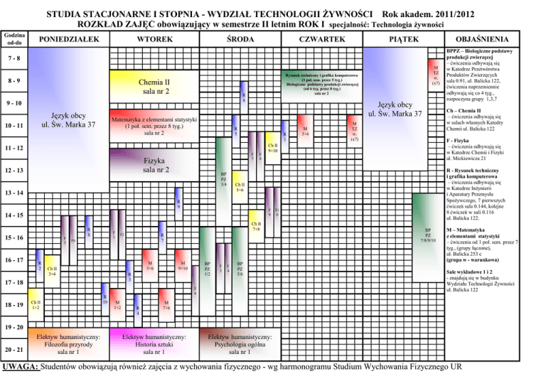 STUDIA STACJONARNE I STOPNIA - WYDZIAŁ TECHNOLOGII ŻYWNOŚCI Rok akadem. 2011/2012 ROZKŁAD ZAJĘĆ obowiązujący w semestrze II letnim ROK I specjalność: Technologia żywności Godzina od-do PONIEDZIAŁEK WTOREK ŚRODA CZWARTEK PIĄTEK OBJAŚNIENIA 7-8 8-9 Chemia II sala nr 2 R 6 9 - 10 Język obcy ul. Św. Marka 37 10 - 11 Matematyka z elementami statystyki (1 poł. sem. przez 8 tyg.) sala nr 2 Język obcy ul. Św. Marka 37 R 5 R 1 11 - 12 F 7 Fizyka sala nr 2 12 - 13 BP PZ 3/4 F 8 R 9 16 - 17 F 5 R 2 F 1 Ch II 7+8 F2 R 7 F6 M 5+6 Ch II 3+4 M 9+10 BP PZ 1/2 R 3 17 - 18 F 3 F 4 BP PZ 5/6 F w 18 - 19 Ch II 1+2 R 10 M 1+2 R 4 M TŻ w. (x7) Ch – Chemia II – ćwiczenia odbywają się w salach własnych Katedry Chemii ul. Balicka 122 F - Fizyka – ćwiczenia odbywają się w Katedrze Chemii i Fizyki al. Mickiewicza 21 Ch II 9+10 F 9 14 - 15 15 - 16 M 3+4 R - Rysunek techniczny i grafika komputerowa – ćwiczenia odbywają się w Katedrze Inżynierii i Aparatury Przemysłu Spożywczego, 7 pierwszych ćwiczeń sala 0.144, kolejne 8 ćwiczeń w sali 0.116 ul. Balicka 122. Ch II 5+6 13 - 14 R 8 M TŻ w. (x7) Rysunek techniczny i grafika komputerowa (1 poł. sem. przez 5 tyg.) Biologiczne podstawy produkcji zwierzęcej (od 6 tyg. przez 8 tyg.) sala nr 2 BPPZ – Biologiczne podstawy produkcji zwierzęcej – ćwiczenia odbywają się w Katedrze Przetwórstwa Produktów Zwierzęcych sala 0.91, ul. Balicka 122, ćwiczenia naprzemiennie odbywają się co 4 tyg., rozpoczyna grupy 1,3,7 F1 0 BP PZ 7/8/9/10 M – Matematyka z elementami statystyki – ćwiczenia od 1 poł. sem. przez 7 tyg., (grupy łączone), ul. Balicka 253 c (grupa w - warunkowa) Sale wykładowe 1 i 2 - znajdują się w budynku Wydziału Technologii Żywności ul. Balicka 122 M 7+8 19 - 20 20 - 21 Elektyw humanistyczny: Filozofia przyrody sala nr 1 Elektyw humanistyczny: Historia sztuki sala nr 1 Elektyw humanistyczny: Psychologia ogólna sala nr 1 UWAGA: Studentów obowiązują również zajęcia z wychowania fizycznego - wg harmonogramu Studium Wychowania Fizycznego UR