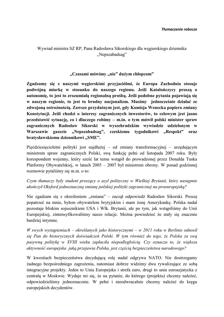 Tłumaczenie robocze Wywiad ministra SZ RP, Pana Radosława Sikorskiego dla węgierskiego dziennika „Nepszabadsag” „Czasami mówimy „nie” dużym chłopcom” Zgadzamy się z naszymi węgierskimi przyjaciółmi, że Europa Zachodnia stosuje podwójną miarkę w stosunku do naszego regionu. Jeśli Katalończycy proszą o autonomię, to jest to zrozumiałą regionalną prośbą. Jeśli podobne pytania pojawiają się w naszym regionie, to jest to brudny nacjonalizm. Musimy jednocześnie działać ze zdwojoną ostrożnością. Zawsze przydatnym jest, gdy Komisja Wenecka popiera zmiany Konstytucji. Jeśli chodzi o interesy zagranicznych inwestorów, to celowym jest jasno przedstawić sytuację, co i dlaczego robimy – m.in. o tym mówił polski minister spraw zagranicznych Radosław Sikorski w wyszehradzkim wywiadzie udzielonym w Warszawie gazecie „Nepszabadsag”, czeskiemu tygodnikowi „Respekt” oraz bratysławskiemu dziennikowi „SME”. Pięćdziesięcioletni polityki jest najdłużej – od zmiany transformacyjnej – urzędującym ministrem spraw zagranicznych Polski, swą funkcję pełni od listopada 2007 roku. Były korespondent wojenny, który sześć lat temu wstąpił do prowadzonej przez Donalda Tuska Platformy Obywatelskiej, w latach 2005 – 2007 był ministrem obrony. W ponad godzinnej rozmowie pytaliśmy się m.in. o to: Czym tłumaczy były student proszący o azyl polityczny w Wielkiej Brytanii, który następnie ukończył Oksford jednoznaczną zmianę polskiej polityki zagranicznej na proeuropejską? Nie zgadzam się z określeniem „zmiana” – zaczął odpowiedź Radosław Sikorski. Proszę popatrzeć na mnie, byłem obywatelem brytyjskim i mam żonę Amerykankę. Polska nadal pozostaje bliskim sojusznikiem USA i Wlk. Brytanii, ale po tym, jak wstąpiliśmy do Unii Europejskiej, zintensyfikowaliśmy nasze relacje. Można powiedzieć że stały się znacznie bardziej intymne. W swych wystąpieniach – określanych jako historycznymi – w 2011 roku w Berlinie odnosił się Pan do historycznych doświadczeń Polski. W tym również do tego, że Polska za swą pasywną politykę w XVIII wieku zapłaciła niepodległością. Czy oznacza to, że większa aktywność europejska jaką przejawia Polska, jest częścią bezpieczeństwa narodowego? W kwestiach bezpieczeństwa decydującą rolę nadal odgrywa NATO. Nie dostrzegamy żadnego bezpośredniego zagrożenia, natomiast dobrze widzimy dwa rywalizujące ze sobą integracyjne projekty. Jeden to Unia Europejska i strefa euro, drugi to unia euroazjatycka z centralą w Moskwie. Wydaje mi się, że na pytanie, do którego (projektu) chcemy należeć, odpowiedzieliśmy jednoznacznie. W pełni i nieodwracalnie chcemy należeć do kręgu europejskich decydentów. W nawiązaniu do kryzysu euro, niektórzy obawiają się zbytniej aktywności ze strony Niemiec, zarzucają Berlinowi stawianie ultimatów. Co Pan sądzi o Niemczech? Jeśli pytanie stawiane jest w ten sposób, to szkoda mi Niemców, przecież to niemieccy podatnicy płacą setki miliardów na europejskie projekty integracyjne. A co dostają w zamian? Oskarża się ich o dyktat. Proszę zachowujmy się jak dorośli (dojrzali) ludzie i spójrzmy szczerze na fakty. Nikogo nie zmuszano, by przyjmował europejską pomoc finansową. Grecja mogła decydować o tym sam, podobnie jak Cypr. Swobodnie mogli wybrać taką opcję – ze wszystkimi konsekwencjami – że dziękują, ale nie proszą o pakiet pomocowy. Należy zauważyć, że wśród państw europejskich zwiększyła się odpowiedzialność finansowofiskalna. Zdano sobie sprawę, że nie można żyć ponad stan. Swoim berlińskim przemówieniem chyba pomogłem proeuropejskim Niemcom w tym, że jeśli minister spraw zagranicznych kraju, któremu Niemcy wyrządzili tyle cierpień, zachęca ich do większej odpowiedzialności, to jest to dzisiaj oznaką normalności. Może przemówienie pomogło również w tym, aby w Niemczech wytworzył się consensus w kwestii europejskiej polityki mającej na celu uratowanie strefy euro. Realia są takie, że Niemcy są największą gospodarką Europy i są największym udziałowcem przedsięwzięcia, które nazywamy Unią Europejską. Naturalnie Niemcy nie są większościowym udziałowcem kontrolującym firmę, do sukcesu potrzebni są także inni, ale do osiągnięcia znaczących wyników potrzebni są Niemcy. Nie boi się Pan Europy dwóch prędkości? Europa dwóch prędkości zawsze istniała. Jeszcze przed wprowadzeniem strefy euro, są (państwa), które należą do strefy Schengen i są (państwa), które do niej nie należą. Jedni zdecydowanie opowiadają się za zacieśnieniem współpracy obronnej, inni nie. Nie chcemy by wytworzyły się takie mechanizmy, które uniemożliwią późniejsze rozszerzenie. Oczywiście można na to opowiedzieć, że każdy element integracji europejskiej powstawał z inicjatywy namaszczonej samą przez siebie awangardowej grupy. Tak jest i mogę mieć nadzieję, że tak zostanie, np. w kwestii współpracy w dziedzinie obronności. Czy rzeczywiście uważa Pan, że w decydujących kwestiach będziecie mieli głos, choć nie jesteście członkami strefy euro? Dokładnie taka była sytuacja, gdy rodził się tzw. pakt fiskalny. Ścierały się dwa poglądy. Ówczesny prezydent Francji, N. Sarkozy opowiadał się za zamkniętym rozwiązaniem, nas i pozostałe państwa nie należące do strefy euro chciał „zesłać” do poczekalni. Polski premier, D. Tusk natomiast upierał się przy takim rozwiązaniu, które nie tylko byłoby otwarte, ale pozwalałoby na zabieranie głosu w kwestii budowania architektury strefy euro. Sarkozy przegrał, Tusk wygrał. Czy sądzi Pan, że również wtedy mamy siedzieć przy stole, gdy „kroją” rachunki klientów banku ? Chwileczkę. Banki cypryjskie wypłacały swoim klientom znacznie wyższe od przeciętnej odsetki. To co teraz zabierają to i tak jest mniej, aniżeli instytucje finanso