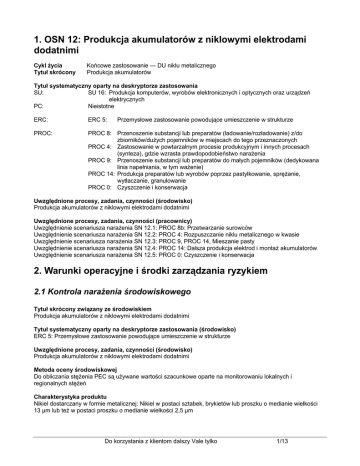 1. OSN 12: Produkcja akumulatorów z niklowymi elektrodami dodatnimi Cykl życia Tytuł skrócony Końcowe zastosowanie — DU niklu metalicznego Produkcja akumulatorów Tytuł systematyczny oparty na deskryptorze zastosowania SU: SU 16: Produkcja komputerów, wyrobów elektronicznych i optycznych oraz urządzeń elektrycznych PC: Nieistotne ERC: ERC 5: Przemysłowe zastosowanie powodujące umieszczenie w strukturze PROC: PROC 8: Przenoszenie substancji lub preparatów (ładowanie/rozładowanie) z/do zbiorników/dużych pojemników w miejscach do tego przeznaczonych PROC 4: Zastosowanie w powtarzalnym procesie produkcyjnym i innych procesach (synteza), gdzie wzrasta prawdopodobieństwo narażenia PROC 9: Przenoszenie substancji lub preparatów do małych pojemników (dedykowana linia napełniania, w tym ważenie) PROC 14: Produkcja preparatów lub wyrobów poprzez pastylkowanie, sprężanie, wytłaczanie, granulowanie PROC 0: Czyszczenie i konserwacja Uwzględnione procesy, zadania, czynności (środowisko) Produkcja akumulatorów z niklowymi elektrodami dodatnimi Uwzględnione procesy, zadania, czynności (pracownicy) Uwzględnienie scenariusza narażenia SN 12.1: PROC 8b: Przetwarzanie surowców Uwzględnienie scenariusza narażenia SN 12.2: PROC 4: Rozpuszczanie niklu metalicznego w kwasie Uwzględnienie scenariusza narażenia SN 12.3: PROC 9, PROC 14, Mieszanie pasty Uwzględnienie scenariusza narażenia SN 12.4: PROC 14: Dalsza produkcja elektrod i montaż akumulatorów Uwzględnienie scenariusza narażenia SN 12.5: PROC 0: Czyszczenie i konserwacja 2. Warunki operacyjne i środki zarządzania ryzykiem 2.1 Kontrola narażenia środowiskowego Tytuł skrócony związany ze środowiskiem Produkcja akumulatorów z niklowymi elektrodami dodatnimi Tytuł systematyczny oparty na deskryptorze zastosowania (środowisko) ERC 5: Przemysłowe zastosowanie powodujące umieszczenie w strukturze Uwzględnione procesy, zadania, czynności (środowisko) Produkcja akumulatorów z niklowymi elektrodami dodatnimi Metoda oceny środowiskowej Do obliczania stężenia PEC są używane wartości szacunkowe oparte na monitorowaniu lokalnych i regionalnych stężeń Charakterystyka produktu Nikiel dostarczany w formie metalicznej: Nikiel w postaci sztabek, brykietów lub proszku o medianie wielkości 13 µm lub też w postaci proszku o medianie wielkości 2,5 µm Do korzystania z klientom dalszy Vale tylko 1/13 Używane ilości Maksymalne dzienne zużycie na obiekcie liczba ton) Maksymalne roczne zużycie na obiekcie 2,9 t dziennie (mediana 50 percentyl dni emisji, maksymalna 796 t (maks., 2007) Częstotliwość oraz czas użytkowania Wzorzec emisji do środowiska 276 dni rocznie (mediana 50 percentyl) Czynniki środowiskowe, na które nie ma wpływu zarządzanie ryzykiem Prędkość przepływu odbiorczej wody powierzchniowej 2xE6 m3/d Objętość rozpuszczania, woda słodka 1000 (maks.) Objętość rozpuszczania, woda morska 100 (domyślnie) Inne podane warunki operacyjne mające wpływ na narażenie środowiska Brak Warunki i środki techniczne na poziomie procesu (źródłowym) w celu zapobieżenia emisji Brak Warunki techniczne na obiekcie i środki redukcji lub ograniczenia wydzielanych zanieczyszczeń, emisji do powietrza oraz emisji do gleby Zużyta woda: Oczyszczanie zużytej wody na obiekcie w oczyszczalni fizykochemicznej z wykorzystaniem metod wytrącania chemicznego lub następujących metod: osadzanie, filtrowanie, elektroliza, odwrócona osmoza lub wymiana jonowa. Współczynnik emisji po oczyszczaniu na obiekcie: Do wody słodkiej i morskiej: 42,7 g/t Powietrze: Oczyszczanie w układzie odprowadzania oparów (filtry tkaninowe lub workowe, metoda wytrącania elektrostatycznego, filtry ceramiczne, a także płuczki mokre, suche lub półsuche) Wydajność usuwania 99% Współczynnik emisji po oczyszczaniu na obiekcie: 25,4 g/t Środki organizacyjne zapobiegania/ograniczania emisji z obiektu Brak Warunki i środki związane z miejską oczyszczalnią ścieków Miejska oczyszczalnia ścieków (OŚ) Brak Stopień emisji z miejskiej oczyszczalni ścieków Nieistotne Spalanie osadów miejskiej oczyszczalni ścieków Nieistotne Warunki i środki związane z zewnętrznym oczyszczaniem usuwanych odpadów Odpady zawierające nikiel powinny być traktowane jak odpady niebezpieczne i usuwane przez licencjonowane firmy zajmujące się usuwaniem odpadów, spalane lub powtórnie przetwarzane Warunki i środki związane z zewnętrznym odzyskiwaniem odpadów Nie dotyczy 2.2 Kontrola narażenia pracowników uwzględniająca scenariusz narażenia SN 12.1 — Przetwarzanie surowców Tytuł skrócony związany z pracownikami Produkcja akumulatorów z niklowymi elektrodami dodatnimi Do korzystania z klientom dalszy Vale tylko 2/13 Uwzględniony deskryptor zastosowania PROC 8b: Przenoszenie substancji lub preparatów (ładowanie/rozładowanie) z/do zbiorników/dużych pojemników w miejscach do tego przeznaczonych Uwzględnione procesy, zadania, czynności Przetwarzanie surowców Metoda oceny Oszacowanie narażenia w oparciu o dane pomiarowe Charakterystyka produktu Nikiel dostarczany w formie metalicznej: Nikiel w postaci sztabek, brykietów lub proszku o medianie wielkości 13 µm lub też w postaci proszku o medianie wielkości 2,5 µm Używane ilości Nieistotne Częstotliwość oraz czas użytkowania/narażenia Zmiany 8-godzinne Czynniki ludzkie, na które nie ma wpływu zarządzanie ryzykiem Objętość oddechu w warunkach użytkowania Wielkość pomieszczenia i wydajność wentylacji Obszar kontaktu substancji ze skórą w warunkach użytkowania Masa ciała Nieistotne Nieistotne Nieistotne Nieistotne Inne podane warunki operacyjne mające wpływ na narażenie pracownika Zastosowanie temperatury i wilgotności otoczenia. Utrzymanie czystości w miejscu pracy w celu zapobieżenia gromadzeniu się proszków i pyłów na powierzchniach. Ustne: Odpowiednie praktyki higieniczne w miejscu pracy Warunki i środki techn