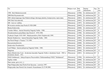 Tyt. Miejsce wyd. Rok wyd. Rodzaj dokumentu Syg. Nr inw. 1998 : Rok Mickiewiczowski [Warszawa] [1998] K. telefoniczna KT 33 2000 Rok Reymontowski. [Warszawa] [2000] K. telefoniczna KT 21 2001 rokiem Ignacego Jana Paderewskiego sławnego pianisty, kompozytora, męża stanu. [Warszawa] [2001] K. telefoniczna KT 26 2001 Rok Norwidowski. [Warszawa] [2001] K. telefoniczna KT 24 680 - lecie m. Lublina. [Warszawa] [1997] K. telefoniczna KT 20 80 rocznica urodzin Jana Pawła II 1920-2000 [Warszawa] [2002?] K. telefoniczna KT 2 Brama Krakowska. [Warszawa] [2000] K. telefoniczna KT 12 Czesław Miłosz : laureat literackiej Nagrody Nobla - 1980. [Warszawa] [2001] K. telefoniczna KT 4 Dwudziestolecie pontyfikatu Jana Pawła II : 1978-1998. [Warszawa] [1998] K. telefoniczna KT 30 Fryderyk Chopin 1810-1849 : Międzynarodowy Rok Chopinowski 1999. [Warszawa] [1999] K. telefoniczna KT 25 Henryk Sienkiewicz : laureat literackiej Nagrody Nobla - 1905. [Warszawa] [2001] K. telefoniczna KT 8 Jan Paweł Drugi w Toruniu 7 VI 1999. [Warszawa] [1999] K. telefoniczna KT 28 Kasa przemysłowców. [Warszawa] [2000] K. telefoniczna KT 11 Krakowskie Przedmieście. [Warszawa] [2000] K. telefoniczna KT 17 Lech Wałęsa : laureat pokojowej Nagrody Nobla - 1983. [Warszawa] [2001] K. telefoniczna KT 7 Magistrat. [Warszawa] [2000] K. telefoniczna KT 15 Maria Skłodowska-Curie : dwukrotna laureatka Nagrody Nobla w dziedzinie fizyki - 1903 w dziedzinie chemii - 1911. [Warszawa] [2001] K. telefoniczna KT 6 NSZZ Solidarność : Sekcja Krajowa Pracowników Telekomunikacji NSZZ "Solidarność". [Warszawa] [1998] K. telefoniczna KT 22 Ogólny widok. [Warszawa] [2000] K. telefoniczna KT 19 Pater noster, qui es in [...]. [Warszawa] [2001] K. telefoniczna KT 27 Piąta Pielgrzymka Jana Pawła II do Ojczyzny : czerwiec 1997. [Warszawa] [1997] K. telefoniczna KT 29 Pielgrzymka Jana Pawła II do Armenii i Kazachstanu 22-27.09.2001. [Warszawa] [2001] K. telefoniczna KT 32 Pielgrzymka Jana Pawła II do Ojczyzny : czerwiec 1999. [Warszawa] [1999] K. telefoniczna KT 31 Pielgrzymka Jana Pawła II do Ojczyzny : czerwiec 1999. [Warszawa] [2000] K. telefoniczna KT 1 Tysiąc dziewięćset dziewiędziesiąty dziewiąty Rok Słowackiego. [Warszawa] [1999] K. telefoniczna KT 23 Ul. Królewsk. [Warszawa] [2000] K. telefoniczna KT 10 Ul. Namiestnikowska. [Warszawa] [2000] K. telefoniczna KT 14 V Pielgrzymka Jana Pawła II do Ojczyzny : czerwiec 1997 [Warszawa] 1997 K. telefoniczna KT 3 Widok na Katedrę. [Warszawa] [2000] K. telefoniczna KT 18 Wieża ciśnień. [Warszawa] [2000] K. telefoniczna KT 13 Wisława Szymborska : laureat literackiej Nagrody Nobla - 1996. [Warszawa] [2001] K. telefoniczna KT 5 Władysław Reymont : laureat literackiej Nagrody Nobla - 1924. [Warszawa] [2001] K. telefoniczna KT 9 Zamek. [Warszawa] [2000] K. telefoniczna KT 16