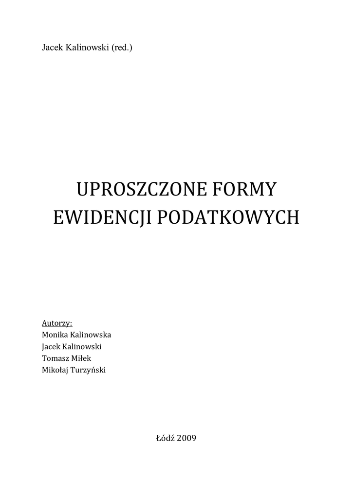 Jacek Kalinowski (red.) UPROSZCZONE FORMY EWIDENCJI PODATKOWYCH Autorzy: Monika Kalinowska Jacek Kalinowski Tomasz Miłek Mikołaj Turzyński Łódź 2009 SPIS TREŚCI WYKAZ SKRÓTÓW ...................................................................................................................... 9 WSTĘP ..........................................................................................................................................10 CZĘŚĆ I: PODSTAWY PRAWNE FUNKCJONOWANIA MAŁYCH I ŚREDNICH PRZEDSIĘBIORSTW – WYBRANE ZAGADNIENIA ..............................................................13 Rozdział 1: PODEJMOWANIE DZIAŁALNOŚCI GOSPODARCZEJ PRZEZ OSOBY FIZYCZNE (JACEK KALINOWSKI). 13 1.1. Podstawy prawne funkcjonowania przedsiębiorstw ............................................................................. 13 1.1.1. System podatkowy w Polsce ......................................................................................................... 13 1.1.2. Ordynacja podatkowa – przegląd najważniejszych regulacji .......................................................... 17 1.1.3. Ustawa o rachunkowości .............................................................................................................. 22 1.2. Podstawy organizacji i prowadzenia działalności gospodarczej ............................................................. 25 1.3. Rejestracja działalności gospodarczej ................................................................................................... 30 Rozdział 2: WZORY WYBRANYCH DOWODÓW KSIĘGOWYCH (JACEK KALINOWSKI) ....................................... 36 2.1. Ewidencje i zestawienia ....................................................................................................................... 36 2.1.1. Karta ewidencji wyposażenia ........................................................................................................ 36 2.1.2. Książka kontroli ............................................................................................................................ 36 2.1.3. Książka kontroli sanitarnej ............................................................................................................ 36 2.1.4. Wykaz środków trwałych i wartości niematerialnych i prawnych ................................................... 37 2.1.5. Ewidencja przebiegu pojazdu ....................................................................................................... 37 2.1.6. Ewidencja przychodów (ryczałt ewidencjonowany)....................................................................... 38 2.1.7. Dzienne zestawienie dowodów sprzedaży .................................................................................... 38 2.1.8. Dzienne zestawienie sprzedaży nieudokumentowanej .................................................................. 38 2.1.9. Dzienne zestawienie sprzedaży VAT.............................................................................................. 39 2.1.10. Zestawienie sprzedaży miesięcznej ............................................................................................. 39 2.1.11. Ewidencja uproszczona sprzedaży VAT........................................................................................ 39 2.1.12. Ewidencja zakupów VAT ............................................................................................................. 40 2.1.13. Ewidencja sprzedaży VAT............................................................................................................ 40 2.1.14. Podatkowa księga przychodów i rozchodów ............................................................................... 41 2.1.15. Arkusz spisu z natury .................................................................................................................. 42 2.2. Dokumenty finansowe ......................................................................................................................... 43 2.2.1. Rachunek ..................................................................................................................................... 43 2.2.2. Rachunek duplikat ........................................................................................................................ 43 Strona | 2 2.2.3. Paragon fiskalny ........................................................................................................................... 44 2.2.4. Faktura VAT ................................................................................................................................. 44 2.2.5. Faktura VAT korygująca ................................................................................................................ 45 2.2.6. Faktura VAT duplikat .................................................................................................................... 45 2.2.7. Faktura VAT MP (mały podatnik) .................................................................................................. 46 2.2.8. Faktura VAT marża ....................................................................................................................... 46 2.2.9. Nota korygująca ........................................................................................................................... 47 2.2.10. Dowód wewnętrzny ................................................................................................................... 47 2.2.11. Faktura VAT wewnętrzna WNT ................................................................................................... 48 2.2.12. Polecenie wyjazdu służbowego (delegacja) ................................................................................. 49 2.2.13. Rachunek kosztów podróży (rozliczenie delegacji) ...................................................................... 50 2.3. Dokumenty kadrowo – płaco
