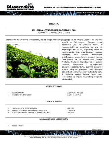 POSTAW NA DALEKIE WYPRAWY W ALTERNATYWNEJ FORMIE! www.discoverasia.com.pl OFERTA SRI LANKA – WŚRÓD HERBACIANYCH PÓL TERMIN: 2 – 15 MARZEC 2015 (14 DNI) Zapraszamy na wyprawę w nieznane, do dalekiego kraju znajdującego się na wyspie Cejlon – na wspólną podróż po Sri Lance! Wyspa, często nazywana „łzą na policzku Indii”, w rzeczywistości ze smutkiem nie ma nic wspólnego. Ma za to, naprawdę wiele do zaoferowania. Kraj, niezniszczony masową turystyką, kusi swoimi dziewiczymi krajobrazami, starożytnymi ruinami świątyń znajdującymi się na terenie tzw. Złotego Trójkąta, Parkami Narodowymi z dzikimi słoniami, lampartami i egzotycznymi ptakami, niesamowitymi, pustymi plażami z białym, rażącym piaskiem oraz słynnymi polami herbacianymi, z których herbata trafia w najdalsze zakątki świata! Teraz masz szansę stać się częścią tej wielkiej przygody! Nie zwlekaj! KOSZTY WYPRAWY • • CENA WYPRAWY CENA BILETU LOTNICZEGO 2.100 PLN + 780 USD 2.500 – 3.500 PLN ZASADY PŁATNOŚCI • • • I RATA – OPŁATA REZERWACYJNA II RATA – PŁATNA NA 30 DNI PRZED WYJAZDEM III RATA – UCZESTNIK ZABIERA ZE SOBĄ NA WYJAZD 600 PLN 1.500 PLN 780 USD MINIMALNA ILOŚĆ UCZESTNIKÓW • 7 OSÓB + PILOT Oferta – strona 1 Biuro Podróży DiscoverAsia Magdalena Gauer, ul. Bednarska 14/4, 60-571 Poznań, NIP 7792288723 www.discoverasia.com.pl, e-mail: [email protected], tel. 504 502 268 POSTAW NA DALEKIE WYPRAWY W ALTERNATYWNEJ FORMIE! www.discoverasia.com.pl CENA OBEJMUJE • • • • • • • zakwaterowanie w hotelach turystycznych w pokojach 2/3-osobowych z łazienką, często z klimatyzacją śniadania we wszystkich hotelach (czasem zamiast śniadania – skromne lunchboxy na podróż) bilety wstępu do wszystkich atrakcji wymienionych w planie wszystkie transfery busami (wynajęcie prywatnego busa na 8 dni), taksówkami i tuk-tukami udział we wszystkich wymienionych w planie wycieczkach ubezpieczenie podróżne KL i NNW opiekę polskojęzycznego pilota CENA NIE OBEJMUJE • • • ceny biletu lotniczego na trasie Warszawa – Bangkok – Warszawa (ceny w granicach 2.500 – 3.500 PLN) wycieczek dodatkowych – niezawartych w planie, dodatkowych transferów wyżywienia – z wyjątkiem wymienionego powyżej (ok 160 USD na cały yjazd) PLAN WYJAZDU Dzień 1 – Spotkanie na lotnisku Okęcie w Warszawie 2 godziny przed odlotem (dla osób, które wykupią zalecany przez Biuro bilet lotniczy). Wylot do Colombo – z przesiadką w jednym z portów w Europie bądź Azji. Dzień 8 – Kolejny dzień w górach – dzisiaj czeka nas długi trekking przez Park Narodowy Doliny Horton Plains, aż na tzw. Koniec Świata (Worlds End). Wieczorem przejazd w okolice Parku Narodowego Yala lub Udawalawe. Dzień 2 – Przylot na Sri Lankę. Zakwaterowanie w hotelu w miejscowości Negombo. Czas na odpoczynek, aklimatyzację, spacer po okolicy i pierwsze doświadczenia kulinarne. Dzień 9 – Popołudniowe safari w Parku Udawalawe. Przy odrobinie szczęścia będziemy mieli okazję zobaczyć dziko żyjące stada słoni, lamparty, bawoły wodne oraz wiele egzotycznych ptaków. Dzień 3 – Całodniowe zwiedzanie Colombo, m.in. stary fort, Muzeum Narodowe znajdujące się pięknym cynamonowym ogrodzie oraz liczne świątynie buddyjskie i hinduistyczne. Odwiedzimy również lokalny bazar. Dzień 10 – Przejazd na wybrzeże, gdzie zobaczymy tzw. blowing hole w Tangalle – drugą największą na świecie naturalną fontannę. Zakwaterowanie w jednej z miejscowości na wybrzeżu. Dzień 4 – Początek wyprawy objazdowej po wyspie! Odwiedzimy niezwykłe miejsce – Sierociniec Słoni w Pinnawali. Następnie wejdziemy wraz z setkami pielgrzymów na Świętą Górę lankijczyków – Sigiriyę. Dzień 5 – Wizyta w świętych jaskiniach w Dambulli. Następnie przejazd do dawnej stolicy kraju– Anuradhapury, gdzie zobaczymy pozostałości starożytnych świątyń, pałaców oraz Święte Drzewo Bodhi. Dzień 6 – Kolejny dzień wśród antycznych świątyń. Odwiedzimy kolejną starożytną stolicę kraju - Polonnaruwę. Po południu odwiedzimy słynne miasteczko Kandy i Świątynię Zęba Buddy. Dzień 7 – Jedziemy w góry! Nasza trasa w kierunku miasta Nuwara Eliya będzie wiodła wśród malowniczo położonych pól herbacianych! Zatrzymamy się w fabryce herbaty i poznamy tajniki jej zbiorów. Dzień 11 – Czas wolny na plażowanie i naukę surfingu albo samodzielną eksplorację okolicy. Może na którejś z plaż uda Wam się spotkać ogromnego żółwia morskiego. Dzień 12 – Rano wyjazd na obserwację wielorybów i delfinów na pełnym morzu (opcja fakultatywna). Chętni będą mogli też wybrać się lokalnym autobusem na zwiedzanie okolicy – np. miasteczka Galle. Dzień 13 – Ostatnie chwile na odpoczynek na plaży i kąpiele w Oceanie Indyjskim. Popołudniowy powrót do Negombo i zakwaterowanie w pobliżu lotniska. Dzień 14 – Wylot do Polski. Lot z przesiadką w jednym z portów azjatyckich lub europejskich. Zakończenie naszej przygody. UWAGA! WYPRAWA NIE JEST PRZEZNACZONA DLA OSÓB CENIĄCYCH SOBIE LUKSUSY, WYSOKIEJ KLASY HOTELE I REGULARNE WYŻYWIENIE. SRI LANKA JEST KRAJEM NIE POSIADAJĄCYM JESZCZE BOGATEGO ZAPLECZA TURYSTYCZNEGO – JEST MAŁO RESTAURACJI I KNAJP, SKLEPY Z PAMIĄTKAMI TO RZADKOŚĆ. DROGI POZOSTAWIAJĄ WIELE DO ŻYCZENIA, A LUDZIE RACZEJ NIE MÓWIĄ PO ANGIELSKU I SĄ BARDZO BIEDNI. DZIĘKI TEMU SRI LANKA TO JESZCZE TEREN DZIEWICZY, NIESKALANY OGROMNYMI BETONOWYMI HOTELAMI I TŁUMAMI TURYSTÓW – A OFERUJE NAPRAWDĘ WIELE: PRZEPIĘKNE WIDOKI, NIEBIAŃSKIE PLAŻE I MOŻLIWOŚĆ ODERWANIA SIĘ OD CYWILIZACJI – CHOCIAŻ NA MOMENT. DLATEGO WARTO TAM JECHAĆ WŁAŚNIE TERAZ! WSZYSTKIE OSOBY ZGŁASZAJĄCE SIĘ DO UDZIAŁU W TEJ WYPRAWIE PROSIMY O PRZEMYŚLANE ZGŁOSZENIA PONIEWAŻ BĘDZIE TO NAPRAWDĘ WYPRAWA W NIEZNANE! Oferta – strona 2 Biuro Podróży DiscoverAsia Magdalena Gauer, ul. Bednarska 14/4, 60-571 Poznań, NIP 7792288723 ww