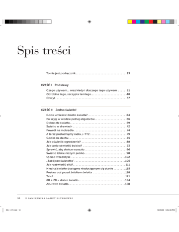 4QJTUSFÆDJ To nie jest podręcznik . . . . . . . . . . . . . . . . . . . . . . . . . . . . . . . . . . . 13 CZĘŚĆ I Podstawy Czego używam... oraz kiedy i dlaczego tego używam . . . . . . 21 Odrobina tego, szczypta tamtego… . . . . . . . . . . . . . . . . . . . . . . .48 Chwyt . . . . . . . . . . . . . . . . . . . . . . . . . . . . . . . . . . . . . . . . . . . . . . . . . 57 CZĘŚĆ II Jedno światło! Gdzie umieścić źródło światła?. . . . . . . . . . . . . . . . . . . . . . . . . . .64 Po szyję w wodzie pełnej aligatorów . . . . . . . . . . . . . . . . . . . . . .66 Dobre złe światło . . . . . . . . . . . . . . . . . . . . . . . . . . . . . . . . . . . . . . .69 Światło w drzwiach . . . . . . . . . . . . . . . . . . . . . . . . . . . . . . . . . . . . . 72 Powrót na mokradła . . . . . . . . . . . . . . . . . . . . . . . . . . . . . . . . . . . . 74 A teraz posłuchajmy radia „i-TTL” . . . . . . . . . . . . . . . . . . . . . . . . . 79 Gdzieś na dachu . . . . . . . . . . . . . . . . . . . . . . . . . . . . . . . . . . . . . . . .85 Jak oświetlić ogrodzenie? . . . . . . . . . . . . . . . . . . . . . . . . . . . . . . .88 Jak tanio oświetlić boisko? . . . . . . . . . . . . . . . . . . . . . . . . . . . . . . 93 Sprawić, aby słońce wzeszło . . . . . . . . . . . . . . . . . . . . . . . . . . . . .96 Światło lekkie niczym piórko . . . . . . . . . . . . . . . . . . . . . . . . . . . . .98 Ojciec Przedbłysk . . . . . . . . . . . . . . . . . . . . . . . . . . . . . . . . . . . . . 102 „Zabójcze światełko” . . . . . . . . . . . . . . . . . . . . . . . . . . . . . . . . . . . 105 Jak rozświetlić elfa? . . . . . . . . . . . . . . . . . . . . . . . . . . . . . . . . . . . . 111 Niechaj światło dostępne niedostępnym się stanie . . . . . . . . 115 Postaw coś przed źródłem światła . . . . . . . . . . . . . . . . . . . . . . 118 Tato! . . . . . . . . . . . . . . . . . . . . . . . . . . . . . . . . . . . . . . . . . . . . . . . . . 121 80 + 20 = dobre światło . . . . . . . . . . . . . . . . . . . . . . . . . . . . . . . . 124 Ażurowe światło . . . . . . . . . . . . . . . . . . . . . . . . . . . . . . . . . . . . . . . 128 10 GS_1-17.indd 10 Z PA M I Ę T N I K A L A M P Y B ŁY S K O W E J 10/20/09 9:54:06 PM Strategia korzystania ze stroboskopu . . . . . . . . . . . . . . . . . . . . 131 Dym i okna. . . . . . . . . . . . . . . . . . . . . . . . . . . . . . . . . . . . . . . . . . . .134 Hakeem the Dream . . . . . . . . . . . . . . . . . . . . . . . . . . . . . . . . . . . . 137 Synchronizacja błysku z krótkimi czasami = niewielka głębia ostrości . . . . . . . . . . . . . . . . . . . . . . . . . . . . . . . . . . . . . . . . . . . . . 143 Błysk w prawdziwym życiu . . . . . . . . . . . . . . . . . . . . . . . . . . . . . 145 Oświetl ich, Dano! . . . . . . . . . . . . . . . . . . . . . . . . . . . . . . . . . . . . . 153 Nie tylko człowieka da się oświetlić . . . . . . . . . . . . . . . . . . . . . . 157 Oświetlona Pani (z) Jeziora . . . . . . . . . . . . . . . . . . . . . . . . . . . . . 162 Jedna lampa na parkingu . . . . . . . . . . . . . . . . . . . . . . . . . . . . . . . 167 Jedna lampa w oknie . . . . . . . . . . . . . . . . . . . . . . . . . . . . . . . . . . 171 Jedna lampa w ogrodzie . . . . . . . . . . . . . . . . . . . . . . . . . . . . . . . 174 CZĘŚĆ III Dwa lub więcej Pokaż tatuaż!... . . . . . . . . . . . . . . . . . . . . . . . . . . . . . . . . . . . . . . . . 178 Żelowanie . . . . . . . . . . . . . . . . . . . . . . . . . . . . . . . . . . . . . . . . . . . .184 Jak szybko sklecić światło do krótkiej sesji portretowej . . . .186 Czy masz prześcieradło? . . . . . . . . . . . . . . . . . . . . . . . . . . . . . . .190 Światło wpadające przez okno to coś pięknego . . . . . . . . . . . 193 Miękkie światło . . . . . . . . . . . . . . . . . . . . . . . . . . . . . . . . . . . . . . . .199 A w Wenecji... . . . . . . . . . . . . . . . . . . . . . . . . . . . . . . . . . . . . . . . . .203 Tancerka w ruinach . . . . . . . . . . . . . . . . . . . . . . . . . . . . . . . . . . . 206 Papier przyjmie wszystko . . . . . . . . . . . . . . . . . . . . . . . . . . . . . . . 211 Człowiek w cieniu . . . . . . . . . . . . . . . . . . . . . . . . . . . . . . . . . . . . . 216 Twarze w lesie . . . . . . . . . . . . . . . . . . . . . . . . . . . . . . . . . . . . . . . . .220 Dynamiczny taniec . . . . . . . . . . . . . . . . . . . . . . . . . . . . . . . . . . . .225 Więcej wyrafinowania . . . . . . . . . . . . . . . . . . . . . . . . . . . . . . . . . .229 Zoom na maksa! . . . . . . . . . . . . . . . . . . . . . . . . . . . . . . . . . . . . . . .233 Rozmowy ze światłem i o świetle . . . . . . . . . . . . . . . . . . . . . . . .237 Zdjęcia grupowe! . . . . . . . . . . . . . . . . . . . . . . . . . . . . . . . . . . . . . .240 Zestaw oświetleniowy do zdjęcia pt. Przerażający koleś w uliczce . . . . . . . . . . . . . . . . . . . . . . . . . . . . . . . . . . . . . . . . . . . 247 Niech stanie się światłość! . . . . . . . . . . . . . . . . . . . . . . . . . . . . . .252 SPIS TREŚCI GS_1-17.indd 11 11 10/20/09 9:54:06 PM CZĘŚĆ IV Dużo lamp Jak urodzić lampę błyskową . . . . . . . . . . . . . . . . . . . . . . . . . . . .258 Wielki Mur… światła . . . . . . . . . . . . . . . . . . . . . . . . . . . . . . . . . . . . 261 Światło północne . . . . . . . . . . . . . . . . . . . . . . . . . . . . . . . . . . . . . .264 Drzewo Żalu . . . . . . . . . . . . . . . . . . . . . . . . . . . . . . . . . . . . . . . . . . 271 Jak zbudować podwórkowe studio . . . . . . . . . . . . . . . . . . . . . . 277 Nie świeć na wprost, świeć dookoła . . . . . . . . . . . . . . . . . . . . .284 Moda, że aż iskry lecą . . . . . . . . . . . . . . . . . . . . . . . . . . . . . . . . . .287 A teraz coś z zupełnie innej beczki . . . . . . . . . . . . . . . . . . . . . .292 Światło na plaży . . . . 