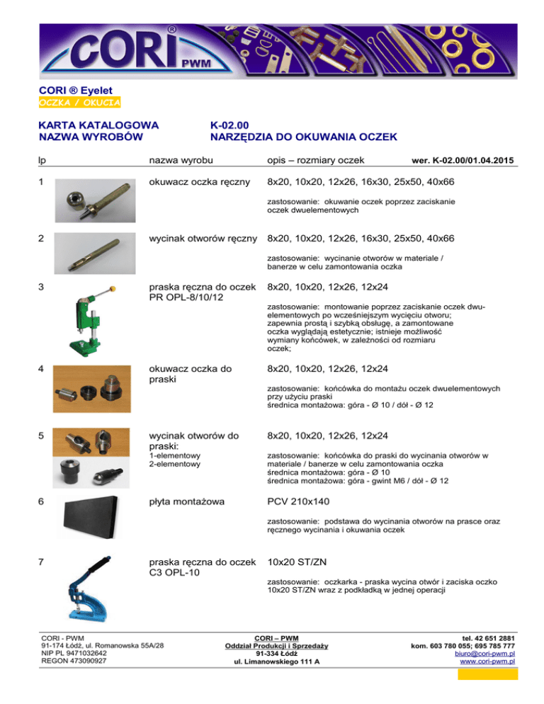 CORI ® Eyelet OCZKA / OKUCIA KARTA KATALOGOWA NAZWA WYROBÓW K-02.00 NARZĘDZIA DO OKUWANIA OCZEK lp nazwa wyrobu opis – rozmiary oczek 1 okuwacz oczka ręczny 8x20, 10x20, 12x26, 16x30, 25x50, 40x66 wer. K-02.00/01.04.2015 zastosowanie: okuwanie oczek poprzez zaciskanie oczek dwuelementowych 2 wycinak otworów ręczny 8x20, 10x20, 12x26, 16x30, 25x50, 40x66 zastosowanie: wycinanie otworów w materiale / banerze w celu zamontowania oczka 3 4 5 6 praska ręczna do oczek PR OPL-8/10/12 8x20, 10x20, 12x26, 12x24 okuwacz oczka do praski 8x20, 10x20, 12x26, 12x24 wycinak otworów do praski: 8x20, 10x20, 12x26, 12x24 1-elementowy 2-elementowy zastosowanie: końcówka do praski do wycinania otworów w materiale / banerze w celu zamontowania oczka średnica montażowa: góra - Ø 10 średnica montażowa: góra - gwint M6 / dół - Ø 12 płyta montażowa PCV 210x140 zastosowanie: montowanie poprzez zaciskanie oczek dwuelementowych po wcześniejszym wycięciu otworu; zapewnia prostą i szybką obsługę, a zamontowane oczka wyglądają estetycznie; istnieje możliwość wymiany końcówek, w zależności od rozmiaru oczek; zastosowanie: końcówka do montażu oczek dwuelementowych przy użyciu praski średnica montażowa: góra - Ø 10 / dół - Ø 12 zastosowanie: podstawa do wycinania otworów na prasce oraz ręcznego wycinania i okuwania oczek 7 praska ręczna do oczek C3 OPL-10 CORI - PWM 91-174 Łódź, ul. Romanowska 55A/28 NIP PL 9471032642 REGON 473090927 10x20 ST/ZN zastosowanie: oczkarka - praska wycina otwór i zaciska oczko 10x20 ST/ZN wraz z podkładką w jednej operacji CORI – PWM Oddział Produkcji i Sprzedaży 91-334 Łódź ul. Limanowskiego 111 A tel. 42 651 2881 kom. 603 780 055; 695 785 777 [email protected] www.cori-pwm.pl