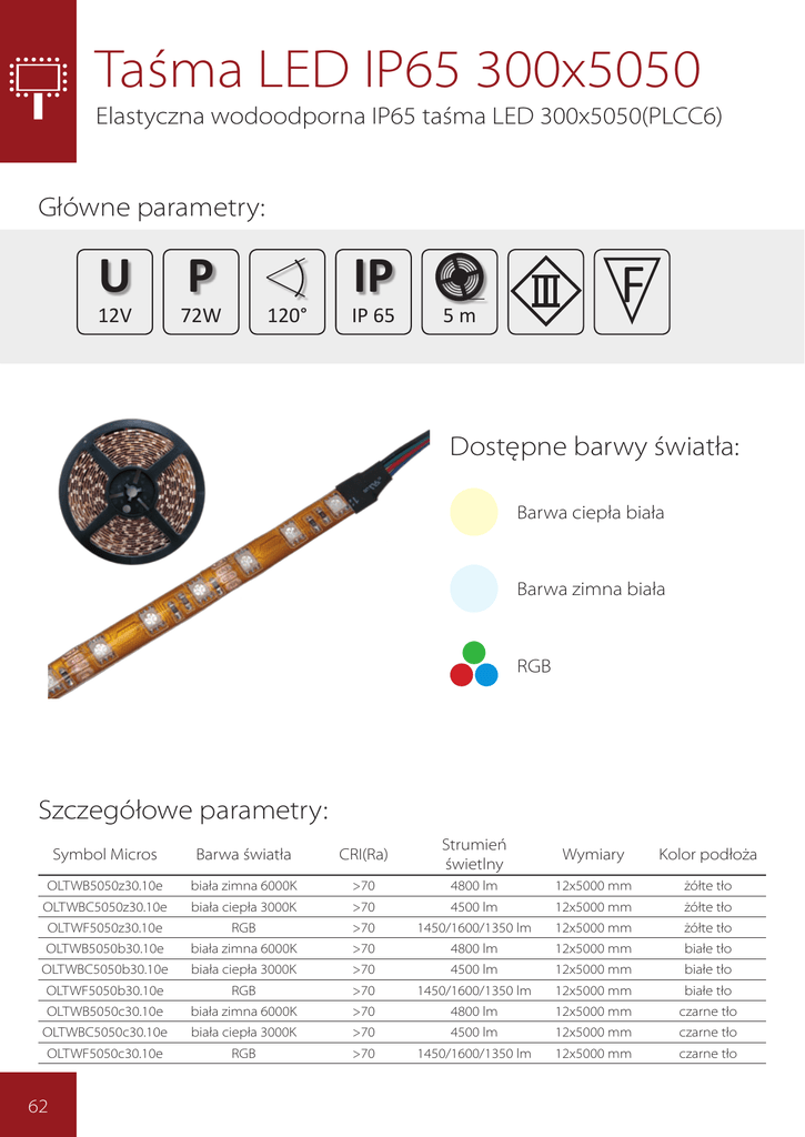 Taśma LED IP65 300x5050 Elastyczna wodoodporna IP65 taśma LED 300x5050(PLCC6) Główne parametry: U 12V P 72W 120° IP IP 65 F 5m Dostępne barwy światła: Barwa ciepła biała Barwa zimna biała RGB Szczegółowe parametry: Symbol Micros Barwa światła CRI(Ra) Strumień świetlny Wymiary Kolor podłoża OLTWB5050z30.10e biała zimna 6000K >70 4800 lm 12x5000 mm żółte tło OLTWBC5050z30.10e biała ciepła 3000K >70 4500 lm 12x5000 mm żółte tło OLTWF5050z30.10e RGB >70 1450/1600/1350 lm 12x5000 mm żółte tło OLTWB5050b30.10e biała zimna 6000K >70 4800 lm 12x5000 mm białe tło OLTWBC5050b30.10e biała ciepła 3000K >70 4500 lm 12x5000 mm białe tło OLTWF5050b30.10e RGB >70 1450/1600/1350 lm 12x5000 mm białe tło OLTWB5050c30.10e biała zimna 6000K >70 4800 lm 12x5000 mm czarne tło OLTWBC5050c30.10e biała ciepła 3000K >70 4500 lm 12x5000 mm czarne tło OLTWF5050c30.10e RGB >70 1450/1600/1350 lm 12x5000 mm czarne tło 62