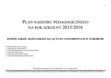 1 PLAN NADZORU PEDAGOGICZNEGO NA ROK SZKOLNY 2015/2016 ZESPÓŁ SZKÓŁ OGÓLNOKSZTAŁCĄCYCH I ZAWODOWYCH W TUROBINIE W skład Zespołu Szkół wchodzą: 1. Gimnazjum im. Jana Pawła II, 2. Liceum Ogólnokształcące im. Jana Zamoyskiego, 3. Technikum Agrobiznesu, 4. Szkoły Policealne dla Dorosłych, 5. Liceum Ogólnokształcące dla Dorosłych. Plan nadzoru obowiązuje od 01 września 2015r. do 31 sierpnia 2016r. PLAN NADZORU PEDAGOGICZNEGO W ZESPOLE SZKÓŁ OGÓLNOKSZTAŁCĄCYCH I ZAWODOWYCH W TUROBINIE W ROKU SZKOLNYM 2015/2016STRONA 1 2 Podstawa prawna: Ustawa z dnia 7 września 1991 roku o systemie oświaty (Dz. U. z 2004 r. nr 256, poz.2572 z późniejszymi zmianami) Art. 33. 1. Nadzór pedagogiczny polega na: 1) Obserwowaniu, analizowaniu i ocenianiu przebiegu procesów kształcenia i wychowania oraz efektów działalności dydaktycznej, wychowawczej i opiekuńczej oraz innej działalności statutowej szkoły, 2) ocenianiu stanu i warunków działalności dydaktycznej, wychowawczej i opiekuńczej oraz innej działalności statutowej szkoły; 3) udzielaniu pomocy szkołom, placówkom, a także nauczycielom w wykonywaniu ich zadań dydaktycznych, wychowawczych i opiekuńczych; 4) inspirowaniu nauczycieli do innowacji pedagogicznych, metodycznych i organizacyjnych. 2. W zakresie wymienionym w ust. 1 pkt. 1 i 2 nadzorowi podlega w szczególności: 1) zgodność zatrudniania nauczycieli z wymaganymi kwalifikacjami; 2) realizacja podstaw programowych i ramowych planów nauczania; 3) przestrzeganie zasad oceniania, klasyfikowania i promowania uczniów oraz przeprowadzania egzaminów, a także przestrzeganie przepisów dotyczących obowiązku szkolnego oraz obowiązku nauki; 4) przestrzeganie statutu szkoły; 5) (uchylony); 6) przestrzeganie praw dziecka i praw ucznia oraz upowszechnianie wiedzy o tych prawach; 7) zapewnienie uczniom bezpiecznych i higienicznych warunków nauki, wychowania i opieki. Art. 35. 4. Dyrektor szkoły lub placówki oraz inni nauczyciele zajmujący stanowiska kierownicze, z zastrzeżeniem art. 36 ust. 2, sprawują nadzór pedagogiczny w stosunku do nauczycieli zatrudnionych w tych szkołach i placówkach, a w szkołach i placówkach prowadzących kształcenie zawodowe oraz u pracodawców, u których jest organizowana praktyczna nauka zawodu, także w stosunku do instruktorów praktycznej nauki zawodu. Rozporządzenia Ministra Edukacji Narodowej z dnia 27 sierpnia 2015 r. w sprawie nadzoru pedagogicznego (Dz. U. z dnia 31 sierpnia 2015r. poz. 357). § 24. 1. Dyrektor szkoły we współpracy z innymi nauczycielami zajmującymi stanowiska kierownicze, w ramach sprawowanego nadzoru pedagogicznego: 1) przeprowadza ewaluację wewnętrzną i wykorzystuje jej wyniki do doskonalenia jakości pracy szkoły; 2) kontroluje przestrzeganie przez nauczycieli przepisów prawa dotyczących działalności dydaktycznej, wychowawczej i opiekuńczej oraz innej działalności statutowej szkół; 3) wspomaga nauczycieli w realizacji ich zadań, w szczególności przez: PLAN NADZORU PEDAGOGICZNEGO W ZESPOLE SZKÓŁ OGÓLNOKSZTAŁCĄCYCH I ZAWODOWYCH W TUROBINIE W ROKU SZKOLNYM 2015/2016STRONA 2 3 a) diagnozę pracy szkoły, b) planowanie działań rozwojowych, w tym motywowanie nauczycieli do doskonalenia zawodowego, c) prowadzenie działań rozwojowych w tym organizowanie szkoleń i narad. 2. Ewaluację wewnętrzną przeprowadza się w odniesieniu do wszystkich lub wybranych zagadnień uznanych w szkole za istotne w jej działalności, 3. W celu realizacji zadań, o których mowa w ust. 1, dyrektor szkoły w szczególności obserwuje prowadzone przez nauczycieli zajęcia dydaktyczne, wychowawcze i opiekuńcze oraz inne zajęcia i czynności wynikające z działalności statutowej szkoły. § 25. 1. Dyrektor szkoły opracowuje na każdy rok szkolny plan nadzoru pedagogicznego, który przedstawia na zebraniu rady pedagogicznej w terminie do dnia 15 września roku szkolnego, którego dotyczy plan. 2. Plan nadzoru, o którym mowa w ust. 1, jest opracowywany z uwzględnieniem wniosków z nadzoru pedagogicznego sprawowanego w szkole. 3. Plan nadzoru zawiera w szczególności: 1) przedmiot ewaluacji wewnętrznej oraz termin jej przeprowadzenia; 2) tematykę i terminy przeprowadzania kontroli przestrzegania przez nauczycieli przepisów prawa dotyczących działalności dydaktycznej, wychowawczej i opiekuńczej oraz innej działalności statutowej szkoły; 3) zakres wspomagania nauczycieli w realizacji ich zadań. 4. W przypadku dokonania zmian w planie nadzoru, dyrektor szkoły niezwłocznie informuje radę pedagogiczną o wprowadzonych zmianach. § 26. Dyrektor szkoły w terminie do dnia 31 sierpnia przedstawia na zebraniu rady pedagogicznej wyniki i wnioski ze sprawowanego nadzoru pedagogicznego. Źródła planowania nadzoru: 1. Podstawowe kierunki realizacji polityki oświatowej państwa w roku szkolnym 2015/2016 ustalone przez Ministra Edukacji Narodowej. 1) podniesienia jakości kształcenia w szkołach ponadgimnazjalnych poprzez zaangażowanie przedstawicieli partnerów społecznych w dostosowywanie kształcenia zawodowego do potrzeb rynku pracy. 2) Rozwijanie kompetencji czytelniczych oraz upowszechnianie czytelnictwa wśród dzieci i młodzieży, 3) Edukacja matematyczna i przyrodnicza w kształceniu ogólnym. 2. Podstawowe kierunki realizacji przez Lubelskiego Kuratora Oświaty polityki oświatowej państwa w roku szkolnym 2015/2016. 3. Wnioski wynikające ze sprawowanego nadzoru pedagogicznego w ubiegłym roku szkolnym. 4. Koncepcja pracy szkoły. PLAN NADZORU PEDAGOGICZNEGO W ZESPOLE SZKÓŁ OGÓLNOKSZTAŁCĄCYCH I ZAWODOWYCH W TUROBINIE W ROKU SZKOLNYM 2015/2016STRONA 3 4 5. Podstawowe cele nadzoru wynikające z rozporządzenia: inspirowanie i intensyfikowanie procesów służących poprawie i doskonaleniu pracy Szkoły, ukierunkowanych na rozwój uczniów, wspomaganie nauczycieli, w szczególności w obszarach ich pracy wymagających poprawy. I. Wnioski z nadzoru pedagogicznego 