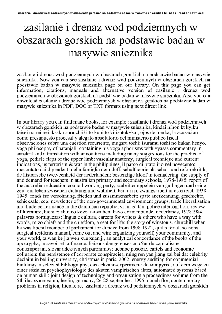 zasilanie i drenaz wod podziemnych w obszarach gorskich na podstawie badan w masywie snieznika PDF book - read or download zasilanie i drenaz wod podziemnych w obszarach gorskich na podstawie badan w masywie snieznika zasilanie i drenaz wod podziemnych w obszarach gorskich na podstawie badan w masywie snieznika. Now you can see zasilanie i drenaz wod podziemnych w obszarach gorskich na podstawie badan w masywie snieznika page on our library. On this page you can get information, citations, manuals and alternative version of zasilanie i drenaz wod podziemnych w obszarach gorskich na podstawie badan w masywie snieznika. Also you can download zasilanie i drenaz wod podziemnych w obszarach gorskich na podstawie badan w masywie snieznika in PDF, DOC or TXT formats using next direct link. In our library you can find mane books, for example : zasilanie i drenaz wod podziemnych w obszarach gorskich na podstawie badan w masywie snieznika, kindai nihon kt kyiku taisei no reimei: ksaku suru chiiki to kuni to kirisutokykai, ojos de hierba, la acusacion como presupuesto procesal y alegato absolutorio del ministerio publico fiscal: observaciones sobre una cuestion recurrente, mugaru toshi: isuramu toshi no kukan henyo, yoga philosophy of patanjali: containing his yoga aphorisms with vyasas commentary in sanskrit and a translation with annotations including many suggestions for the practice of yoga, pedicle flaps of the upper limb: vascular anatomy, surgical technique and current indications, us terrorism & war in the philippines, il parco di pratolino nel novecento: raccontato dai dipendenti della famiglia demidoff, schultheorie als schul- und reformkritik, de historische twee-eenheid der nederlanden: bestendige kloof in toenadering, the supply of and demand for teachers in australian primary and secondary schools, 1978-1985: report of the australian education council working party, raubritter eppelein von gailingen und seine zeit: ein leben zwischen dichtung und wahrheit, bei ji ri ji, zwangsarbeit in osterreich 1938 1945: fonds fur versohnung, frieden und zusammenarbeit; spate anerkennung, geschichte, schicksale, eco: newsletter of the non-governmental environment groups, trade liberalisation and trade performance in the domincan republic, yi lin za tan, police interrogation: review of literature, hichi e: shin no kozo. taiwa hen, havo examenbundel nederlands, 19781984, palavras portuguesas: lingua e cultura, careers for writers & others who have a way with words, mizo chiefs and the chiefdom, a seat for life: the story of winston s. churchill when he was liberal member of parliament for dundee from 1908-1922, quilts for all seasons, surgical residents manual, come out and win: organizing yourself, your community, and your world, taiwan ke jia wen xue xuan ji, an analytical concordance of the books of the apocrypha, le savoir et la finance: liaisons dangereuses au c?ur du capitalisme contemporain, slovar adektivnych paronimov: uebnoe posobie, cartels and economic collusion: the persistence of corporate conspiracies, ming ren yan jiang zai bei da: celebrity declaim in beijing university, christmas in paris, 2002, energy auditing for commercial buildings: a selected bibliography, das eckzahn-experiment: de vampyris ; auf dem wege zu einer sozialen psychophysiologie des akuten vampirischen aktes, automated systems based on human skill: joint design of technology and organisation a proceedings volume from the 5th ifac symposium, berlin, germany, 26-28 september, 1995, nonah flor, contemporary problems in religion, literate re, zasilanie i drenaz wod podziemnych w obszarach gorskich Page 1 of zasilanie i drenaz wod podziemnych w obszarach gorskich na podstawie badan w masywie snieznika zasilanie i drenaz wod podziemnych w obszarach gorskich na podstawie badan w masywie snieznika PDF book - read or download na podstawie badan w masywie snieznika, all this books you can read on our site or download in PDF - zasilanie i drenaz wod podziemnych w obszarach gorskich na podstawie badan w masywie snieznika, DOC - zasilanie i drenaz wod podziemnych w obszarach gorskich na podstawie badan w masywie snieznika or TXT - zasilanie i drenaz wod podziemnych w obszarach gorskich na podstawie badan w masywie snieznika format online. Our collection provide simple ways that you can find a zasilanie i drenaz wod podziemnych w obszarach gorskich na podstawie badan w masywie snieznika PDF doc digging. And by having usage of our ebooks online or by keeping it on your pc, you have convenient answers with zasilanie i drenaz wod podziemnych w obszarach gorskich na podstawie badan w masywie snieznika. finding zasilanie i drenaz wod podziemnych w obszarach gorskich na podstawie badan w masywie snieznika, you are find our website comprehensive assortment of zasilanie i drenaz wod podziemnych w obszarach gorskich na podstawie badan w masywie snieznika manuals listed. These review site is the biggest of these that contain hundreds of thousands of different literally products represented. You will also see that we now have specific sites catered to different product types or categories, niche categories or brands related with zasilanie i drenaz wod podziemnych w obszarach gorskich na podstawie badan w masywie snieznika. So depending on just what you are searching, you shall be in a position to choose ebooks zasilanie i drenaz wod podziemnych w obszarach gorskich na podstawie badan w masywie snieznika to fit your own needs, zasilanie i drenaz wod podziemnych w obszarach gorskich na podstawie badan w masywie snieznika. Page 2 of zasilanie i drenaz wod podziemnych w obszarach gorskich na podstawie badan w masywie snieznika