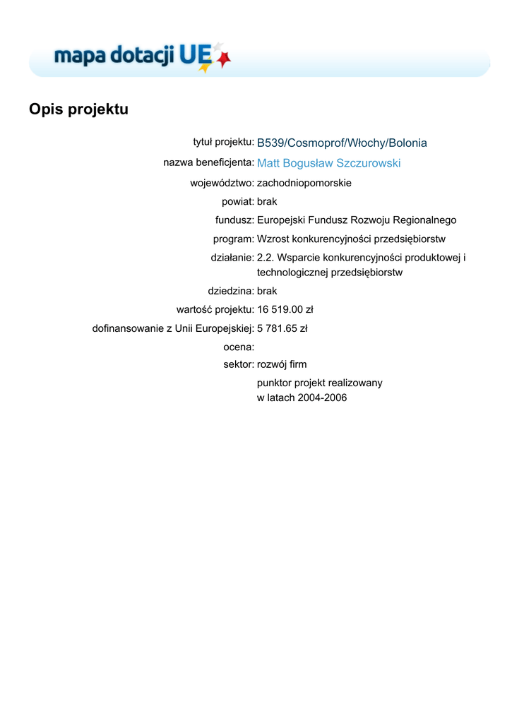 Opis projektu tytuł projektu: B539/Cosmoprof/Włochy/Bolonia nazwa beneficjenta: Matt Bogusław Szczurowski województwo: zachodniopomorskie powiat: brak fundusz: Europejski Fundusz Rozwoju Regionalnego program: Wzrost konkurencyjności przedsiębiorstw działanie: 2.2. Wsparcie konkurencyjności produktowej i technologicznej przedsiębiorstw dziedzina: brak wartość projektu: 16 519.00 zł dofinansowanie z Unii Europejskiej: 5 781.65 zł ocena: sektor: rozwój firm punktor projekt realizowany w latach 2004-2006