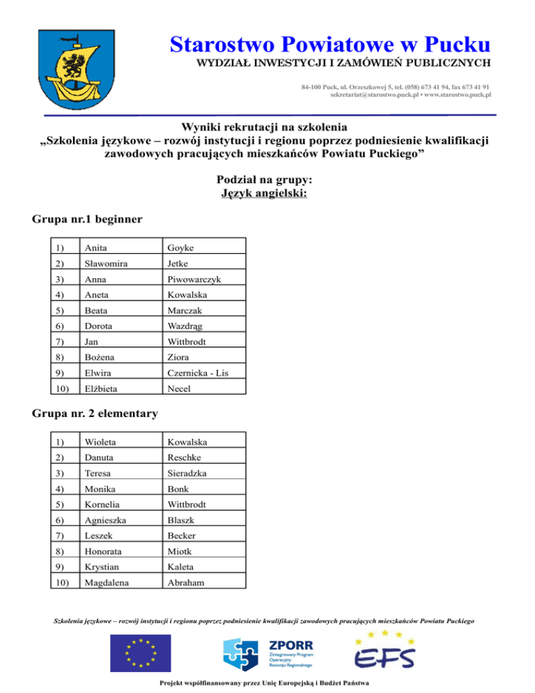 Starostwo Powiatowe w Pucku WYDZIAŁ INWESTYCJI I ZAMÓWIEŃ PUBLICZNYCH 84-100 Puck, ul. Orzeszkowej 5, tel. (058) 673 41 94, fax 673 41 91 [email protected] • www.starostwo.puck.pl Wyniki rekrutacji na szkolenia „Szkolenia językowe – rozwój instytucji i regionu poprzez podniesienie kwalifikacji zawodowych pracujących mieszkańców Powiatu Puckiego” Podział na grupy: Język angielski: Grupa nr.1 beginner 1) Anita Goyke 2) Sławomira Jetke 3) Anna Piwowarczyk 4) Aneta Kowalska 5) Beata Marczak 6) Dorota Wazdrąg 7) Jan Wittbrodt 8) Bożena Ziora 9) Elwira Czernicka - Lis 10) Elżbieta Necel Grupa nr. 2 elementary 1) Wioleta Kowalska 2) Danuta Reschke 3) Teresa Sieradzka 4) Monika Bonk 5) Kornelia Wittbrodt 6) Agnieszka Blaszk 7) Leszek Becker 8) Honorata Miotk 9) Krystian Kaleta 10) Magdalena Abraham Szkolenia językowe – rozwój instytucji i regionu poprzez podniesienie kwalifikacji zawodowych pracujących mieszkańców Powiatu Puckiego Projekt współfinansowany przez Unię Europejską i Budżet Państwa Grupa nr. 3 pre-intermediate / intemediate 1) Monika Madaj 2) Anna Winiarska 3) Lucyna Bizewska 4) Krystyna Riss 5) Krystian Wittbrodt 6) Janina Borkowska 7) Sylwia Plomin 8) Mirosław Kuklik 9) Jolanta Podhajska 10) Lukrecja Ludwig - Bizewska Język niemiecki: Grupa nr. 1 początkujący 1) Bogumiła Bolda 2) Laura Lachs 3) Jarosław Lis 4) Izabela Noetzel 5) Izabela Adamczyk 6) Celina Baranowska 7) Roman Drzeżdżon 8) Krystyna Paszke 9) Beata Kowalska 10) Iwona Tylicka Lista Rezerwowa: Język angielski: Grupa nr.1 beginner 1) Barbara Barlasz 2) Mirosława Janczak 3) Beata Kalenkowiec 4) Alicja Czaja 5) Michał Borkowski 6) Wioletta Koniecka 7) Anna Krypa 8) Monika Olszewska 9) Hanna Mikołajczak 10) Hanna Iwańska Grupa nr. 2 elementary 1) Milena Kolbowicz 2) Joanna Elendt 3) Beata Zajfert-Potrykus Grupa nr. 3 pre-intermediate/intemediate 1) Monika Lenc 2) Mirosława Jackiewicz Język niemiecki: Grupa nr. 1 początkujący * 1) Jadwiga Orzeł 2) Adam Baran 3) Jolanta Cejnowa 4) Zdzisław Ciskowski * Teresa Jagodzińska i Maja Jaromirska –Lewińska znacznie odbiegają poziomem zaawansowania znajomości języka niemieckiego.