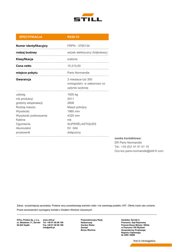SPECYFIKACJA RX20-15 Numer identyfikacyjny FRPN - 3765134 rodzaj budowy wózek elektryczny (trójkołowy) Klasyfikacja srebrne Cena netto 15.210,00 miejsce pobytu Paris Normandie Gwarancja 3 miesiace lub 300 motogodzin, w zaleznosci co uplynie szybciej udźwig rok produkcji godziny eksploatacji Rodzaj masztu Wysokość Wysokość podnoszenia Kabina Ogumienie Akumulator prostownik 1500 kg 2011 2808 Maszt potrójny 1960 mm 4320 mm nie SUPERÉLASTIQUES 0V 0Ah dołączony osoba kontaktowa: DR Paris Normandie Tel.: +33 (0)1 41 51 51 15 [email protected] Zakaz wcześniejszej sprzedaży: Podane ceny przedstawiają wartości netto i nie zawierają podatku VAT. Oferta może ulec zmianie. Przed zamówieniem wymagany kontakt z Działem Wózków Używanych STILL Polska Sp. z o.o. ul. Składowa 11, Żerniki 62-023 Gądki www.still.pl Tel. +48 61 66 86 100 Fax +48 61 66 86 189 [email protected] Przewodniczący Rady Nadzorczej: Gordon Riske Zarząd: Borys Wochna Siedziba: Żerniki k. Poznania; Sąd Rejonowy Poznań-Nowe Miasto i Wilda w Poznaniu VIII Wydział Gospodarczy Krajowego Rejestru Sądowego. Nr KRS 18980