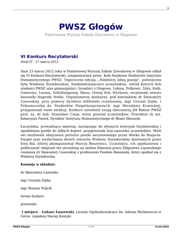 1 PWSZ Głogów Państwowa Wyższa Szkoła Zawodowa w Głogowie VI Konkurs Recytatorski Dział IT · 27 marca 2012 Dnia 23 marca 2012 roku w Państwowej Wyższej Szkole Zawodowej w Głogowie odbył się VI Konkurs Recytatorski, zorganizowany przez Koło Naukowe Studentów Instytutu Humanistycznego PWSZ. Tegoroczna edycja, „Niektórzy lubią poezję”, poświęcona była Wisławie Szymborskiej. Siedemdziesięcioro uczestników, wśród których byli studenci PWSZ oraz gimnazjaliści i licealiści z Głogowa, Lubina, Polkowic, Góry, Kotli, Gaworzyc, Leszna, Szlichtyngowej, Sławy, Nowej Soli, Wschowy, recytowało utwory laureatki Nagrody Nobla. Organizatorzy konkursu, pod kierunkiem dr Sławomiry Lisewskiej, przy pomocy dyrektor biblioteki uczelnianej, mgr Urszuli Zięby, i Pełnomocnika ds. Studentów Niepełnosprawnych, mgr Mirosławy Krasickiej, przygotowali wiele atrakcji. Konkurs uświetnili swoją obecnością JM Rektor PWSZ prof. nz. dr hab. Stanisław Czaja, który powitał uczestników, Prorektor dr inż. Katarzyna Pantoł, Dyrektor Instytutu Humanistycznego dr Beata Skwarek. Łuczyńska, prowadząca imprezę, nawiązując do słynnych loteryjek Szymborskiej i upodobania poetki do żółtych kopert, przygotowała losy-nazwiska uczestników. Mieli oni możliwość obejrzenia portretu poetki narysowanego przez Marka de RozprzaFaygel oraz wysłuchania dwóch utworów Wisławy Szymborskiej śpiewanych przez Ewę Bal, której akompaniował Marcin Reszewicz. Uczestnicy, ich opiekunowie i publiczność obejrzeli też utrwaloną na taśmie filmowej przez Zbigniewa Lipowskiego rozmowę dr Sławomiry Lisewskiej z profesorem Pawłem Banasiem, który spotkał się z Wisławą Szymborską. Komisja w składzie: dr Sławomira Lisewska mgr Urszula Zięba mgr Bożena Wójcik Iwona Szubert przyznała: I miejsce – Łukasz Łaszewski, Liceum Ogólnokształcące im. Adama Mickiewicza w Górze (opiekun Maciej Kostyk) PWSZ Głogów -1/4- 16.04.2016 2 II miejsce – Wiktoria Pawlak, Gimnazjum Nr 2 w Głogowie (opiekun Małgorzata Jankowska) III miejsce – Marcin Koziarz, Zespół Szkół Sportowych, Gimnazjum nr 2 Sportowe, Lubin (opiekun Monika Klemaszewska) Wyróżnienia: Aleksandra Mackiewicz, Gimnazjum w Szlichtyngowej (opiekun Justyna Jasik) Aleksandra Ludkowska, Liceum Ogólnokształcące im. Adama Mickiewicza w Górze (opiekun Maciej Kostyk) Alicja Kałuża, Gimnazjum Nr 2 w Głogowie (opiekun Małgorzata Jankowska) Wszystkim recytatorom wręczono dyplomy uczestnictwa w konkursie, jego laureaci otrzymali dyplomy i różnorodne nagrody. Doceniono trud nauczycieli, którzy przygotowali do konkursu swoich uczniów. Wśród nich wyróżnili się podopieczni pani Małgorzaty Jankowskiej z Gimnazjum nr 2 w Głogowie. Jury uhonorowało panią nauczycielkę nagrodą specjalną. Sponsorami nagród VI Konkursu Recytatorskiego Twórczość Wisławy Szymborskiej „Niektórzy lubią poezję” byli: Prezydent Miasta Głogowa – Jan Kazimierz Zubowski PWSZ Głogów -2/4- 16.04.2016 3 Starosta Powiatu Głogowskiego – Rafael Rokaszewicz, Dyrektor księgarni „Fenix” – Bożena Wójcik, Firma Xero-Max – Magdalena Reszewicz, Piekarnia Kazimierz Janczak – Polkowice, PEN s. c. Przedsiębiorstwo Wielobranżowe Sebastian i Ryszard Kulesza, mgr Mirosława Krasicka. Ponadto swoje prace (grafikę, portrety Wisławy Szymborskiej) jako nagrody przekazali: dr Adam Olejniczak – wykładowca PWSZ, Adriana Matecka, Adam Kopiec – studenci PWSZ. Laureatom i ich opiekunom gratulujemy, wszystkim uczestnikom, sponsorom i jurorom dziękujemy i zapraszamy do udziału w VII Konkursie Recytatorskim – za rok! Więcej zdjęć pod adresem https://picasaweb.google.com/PWSZwGlogowie/ PWSZ Głogów -3/4- 16.04.2016 4 Ten wpis został utworzony 27 marca 2012 o godz. 07:05 w kategorii Aktualności. PWSZ Głogów -4/4- 16.04.2016