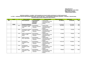 Załącznik Nr 19 do Zarządzenia Nr 23/ 2012 Wójta Gminy Manowo Z dnia 26 marca 2012 r. Realizacja wydatków ze środków Unii Europejskiej oraz innych środków pochodzących ze źródeł zagranicznych za 2011 r.- realizacja Programu Operacyjnego Kapitał ludzki „Pomocna dłoń Plus” i Przeciwdziałanie wykluczeniu cyfrowemu – eInclusion „ Internet szansą wszechstronnego rozwoju mieszkańców Gminy Manowo „ Dz. 852 Rozdz. § Nazwa programu Przeciwdziałanie wykluczeniu cyfrowemu eInclusion Nazwa projektu Internet szansą wszechstronnego rozwoju mieszkańców Gminy Manowo Pozostała działalność Wynagrodzenia osobowe Pracowników – środki unijne Przeciwdziałanie wykluczeniu cyfrowemu - eInclusion 4019 Wynagrodzenia osobowe pracowników- środki własne Przeciwdziałanie wykluczeniu cyfrowemu - eInclusion 4119 Składki na ubezpieczenia społeczne- środki własne Przeciwdziałanie wykluczeniu cyfrowemu - eInclusion 4129 Składki na Fundusz Pracy- środki własne Przeciwdziałanie wykluczeniu cyfrowemu - eInclusion 4177 Wynagrodzenia bezosobowe- środki unijne Przeciwdziałanie wykluczeniu cyfrowemu - eInclusion 4179 Wynagrodzenia bezosobowe- środki własne Przeciwdziałanie wykluczeniu cyfrowemu - eInclusion 4217 Zakup materiałów i wyposażenia – środki unijne Przeciwdziałanie wykluczeniu cyfrowemu - eInclusion Internet szansą wszechstronnego rozwoju mieszkańców Gminy Manowo Internet szansą wszechstronnego rozwoju mieszkańców Gminy Manowo Internet szansą wszechstronnego rozwoju mieszkańców Gminy Manowo Internet szansą wszechstronnego rozwoju mieszkańców Gminy Manowo Internet szansą wszechstronnego rozwoju mieszkańców Gminy Manowo Internet szansą wszechstronnego rozwoju mieszkańców Gminy Manowo Internet szansą wszechstronnego rozwoju mieszkańców Gminy Manowo 85295 4017 Nazwa zadania Pomoc społeczna Plan po zmianach 151.840,00 Wykonanie 127.562,09 % 84,0 151.840,00 20.570,00 127.562,09 20.133,74 84,0 97,9 3.630,00 3.553,08 97,9 4.130,00 3.901,83 94,7 670,00 345,45 51,6 41.011,00 40.678,01 99,2 7.238,00 7.178,49 99,2 4.990,00 4.990,00 100,0 853 4219 Zakup materiałów i wyposażenia – środki własne Przeciwdziałanie wykluczeniu cyfrowemu - eInclusion 4307 Zakup materiałów i wyposażenia – środki unijne Przeciwdziałanie wykluczeniu cyfrowemu - eInclusion 4309 Zakup usług pozostałych – środki własne Przeciwdziałanie wykluczeniu cyfrowemu - eInclusion 4357 Zakup usług dostępu do do sieci Internet- srodki unijne Przeciwdziałanie wykluczeniu cyfrowemu - eInclusion 4359 Zakup usług dostępu do do sieci Internet- srodki własne Przeciwdziałanie wykluczeniu cyfrowemu - eInclusion 4437 Różne opłaty i składki - środki unijne Przeciwdziałanie wykluczeniu cyfrowemu - eInclusion 4439 Różne opłaty i składki - środki własne Przeciwdziałanie wykluczeniu cyfrowemu - eInclusion Zadania w zakresie polityki społecznej Kapitał ludzki 3119 Wynagrodzenia osobowe pracowników- środki własne Kapitał ludzki 4017 Wynagrodzenia osobowe pracowników- środki unijne Kapitał Ludzki 4019 Wynagrodzenia osobowe pracowników- środki własne Kapitał ludzki 85395 Internet szansą wszechstronnego rozwoju mieszkańców Gminy Manowo Internet szansą wszechstronnego rozwoju mieszkańców Gminy Manowo Internet szansą wszechstronnego rozwoju mieszkańców Gminy Manowo Internet szansą wszechstronnego rozwoju mieszkańców Gminy Manowo Internet szansą wszechstronnego rozwoju mieszkańców Gminy Manowo Internet szansą wszechstronnego rozwoju mieszkańców Gminy Manowo Internet szansą wszechstronnego rozwoju mieszkańców Gminy Manowo Pomocna dłoń Plus, Wiem więcej i Indywidualizacja nauczania i wychowania klas I-III Pomocna dłoń Plus, Wiem więcej i Indywidualizacja nauczania i wychowania klas I-III Pomocna dłoń Plus, Wiem więcej i Indywidualizacja nauczania i wychowania klas I-III Pomocna dłoń Plus, Wiem więcej i Indywidualizacja nauczania i wychowania klas I-III 880,00 880,0 100,0 8.552,00 8.510,62 99,5 1.449,00 1.449,00 100,0 29.358,00 29.358,00 100,0 28.012,00 5.233,87 18,7 1.147,00 1.147,00 100,0 203,00 203,00 100,0 188.802,00 187.151,73 99,1 2.343,00 2.343,00 100,0 41.149,31 41.149,31 100,0 8.200,69 8.200,69 100,0 2 4117 4119 4127 4129 4177 4179 4217 4219 4247 4249 4307 4309 Składki na ubezpieczenia społeczne- środki unijne Kapitał ludzki Składki na ubezpieczenia społeczne- środki własne Kapitał ludzki Składki na Fundusz Pracy- środki unijne Kapitał ludzki Składki na Fundusz Pracy- środki własne Kapitał ludzki Wynagrodzenia bezosobowe- środki unijne Kapitał ludzki Wynagrodzenia bezosobowe- środki własne Kapitał ludzki Zakup materiałów i wyposażenia – środki unijne Kapitał ludzki Zakup materiałów i wyposażenia – środki własne Kapitał ludzki Zakup pomocy naukowych – środki unijne Kapitał Ludzki Zakup pomocy naukowych – środki własne Kapitał Ludzki Zakup materiałów i wyposażenia – środki unijne Kapitał ludzki Zakup usług pozostałych – środki własne Kapitał ludzki Pomocna dłoń Plus, Wiem więcej i Indywidualizacja nauczania wychowania klas I-III Pomocna dłoń Plus, Wiem więcej i Indywidualizacja nauczania wychowania klas I-III Pomocna dłoń Plus, Wiem więcej i Indywidualizacja nauczania wychowania klas I-III Pomocna dłoń Plus, Wiem więcej i Indywidualizacja nauczania wychowania klas I-III Pomocna dłoń Plus, Wiem więcej i Indywidualizacja nauczania wychowania klas I-III Pomocna dłoń Plus, Wiem więcej i Indywidualizacja nauczania wychowania klas I-III Pomocna dłoń Plus, Wiem więcej i Indywidualizacja nauczania wychowania klas I-III Pomocna dłoń Plus, Wiem więcej i Indywidualizacja nauczania wychowania klas I-III Pomocna dłoń Plus, Wiem więcej i Indywidualizacja nauczania wychowania klas I-III Pomocna dłoń Plus, Wiem więcej i Indywidualizacja nauczania wychowania klas I-III Pomocna dłoń Plus, Wiem więcej i Indywidualizacja nauczania wychowania k