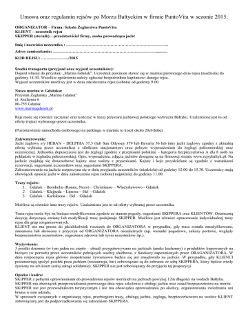 Umowa oraz regulamin rejsów po Morzu Bałtyckim w firmie PuntoVita w sezonie 2015. ORGANIZATOR – Firma: Szkoła Żeglarstwa PuntoVita KLIENT – uczestnik rejsu SKIPPER (sternik) – przedstawiciel firmy, osoba prowadząca jacht Imię i nazwisko uczestnika : ……………………………………………………………….. Adres zamieszkania: ………………………………………………………………….......... KOD REJSU: ………………../2015 Środki transportu (przyjazd oraz wyjazd uczestników): Dojazd własny do przystani „Marina Gdańsk”. Uczestnik powinien stawić się w marinie pierwszego dnia rejsu (niedziela) do godziny 14.30. Wszelkie opóźnienia należy zgłaszać bezpośrednio kapitanowi danego rejsu. Wyjazd uczestników możliwy jest w dniu zakończenia rejsu (sobota) od godziny 9.00. Nasza marina w Gdańsku: Przystań Żeglarska „Marina Gdańsk” ul. Szafarnia 6 80-755 Gdańsk www.marinagdansk.pl Rejs może się również zaczynać oraz kończyć w innej przystani jachtowej polskiego wybrzeża Bałtyku. Uzależnione jest to od oferty (rejsu) wybranego przez uczestnika. (Pozostawienie samochodu osobowego na parkingu w marinie to koszt około 20zł/dobę) Zakwaterowanie: Jacht żaglowy s/y HEBAN – DELPHIA 37,3 (lub Sun Odyssey 379 lub Bavaria 36 lub inny jacht żaglowy zgodny z aktualną ofertą wybraną przez uczestnika) z silnikiem stacjonarnym oraz pełnym wyposażeniem do żeglugi pełnomorskiej oraz oceanicznej. Jednostka dopuszczona jest do żeglugi zgodnie z przepisami polskimi – kategoria bezpieczeństwa A dla 8 osób na pokładzie w żegludze pełnomorskiej. Opis, wyposażenie, zdjęcia jachtów dostępne są na firmowej stronie www.rejsybaltyk.pl. Na jachcie znajdują się dwuosobowe kajuty oraz toalety z prysznicami. Kajuty i koje przydzielane są zgodnie z warunkami rezerwacji, sugestiami uczestników oraz sugestiami SKIPPERA. Zakwaterowanie na jachcie rozpoczyna się w dniu przyjazdu uczestników (niedziela) od godziny 12.00 do 15.30. Uczestnicy mają obowiązek opuścić jacht w dniu zakończenia rejsu (sobota) najpóźniej do godziny 11.00. Trasy rejsów: 1. Gdańsk – Bornholm (Ronne, Nexo) – Christianso – Władysławowo - Gdańsk 2. Gdańsk – Kłajpeda – Lipawa – Hel – Gdańsk 3. Gdańsk – Karlskrona – Hel – Gdańsk Możliwe są również inne trasy rejsów. Uzależnione jest to od oferty wybranej przez uczestnika. Trasa rejsu może być na bieżąco modyfikowana zgodnie ze stanem pogody, sugestiami SKIPPERA oraz KLIENTÓW. Ostateczną decyzję dotyczącą zmiany lub modyfikacji trasy podejmuje SKIPPER. Możliwe jest również opracowanie indywidualnej trasy rejsu dla grup zorganizowanych. KLIENT nie ma prawa do jakichkolwiek roszczeń do ORGANIZATORA w przypadku, gdy trasa została zmodyfikowana, zmieniona lub skrócona z przyczyn od ORGANIZATORA niezależnych (np. warunki pogodowe, zakazy portowe, względy bezpieczeństwa uczestników, zagrożenie zdrowia lub życia uczestników itp.). Wyżywienie: 3 posiłki dziennie (w tym jeden na ciepło – obiad) przygotowywane na jachtach (aneks kuchenny) z produktów kupowanych na bieżąco (w portach) przez uczestników pełniących wachty służbowe, z funduszy zapewnionych przez ORAGANIZATORA. W dniu rozpoczęcia rejsu główne zaopatrzenie żywieniowe będzie się już znajdowało na jachcie. W przypadku, gdy KLIENCI postanawiają spożyć posiłek poza jachtem (restauracja, bar) zobowiązani są do zabrania ze sobą SKIPPERA, który będzie wtedy żywiony na ich koszt (całej załogi solidarnie). SKIPPER nie jest zobowiązany do przyjęcia tej propozycji. Opieka i kadra: SKIPPER z pełnymi uprawnieniami do prowadzenia rejsów morskich na jachtach powyżej 12m długości na wodach Bałtyku. SKIPPER ma obowiązek przeprowadzenia pierwszego dnia rejsu szkolenia z obsługi jachtu oraz zasad bezpieczeństwa na morzu. SKIPPER nie jest przewodnikiem turystycznym i nie ma obowiązku oprowadzania po okolicy, organizowania zwiedzania ani brania w nim udziału. W sprawach związanych z organizacją rejsu, przebiegiem trasy, obsługą jachtu, żeglugą, bezpieczeństwem na wodzie KLIENT zobowiązany jest do podporządkowania się zaleceniom SKIPPERA. Obowiązki KLIENTÓW (uczestników): KLIENCI podzieleni są na dwuosobowe wachty służbowe. Do obowiązków wachty należą: robienie zakupów, przygotowywanie posiłków, sprzątanie po posiłkach, pomoc SKIPPEROWI, czynności organizacyjne związane z żeglugą oraz zapleczem socjalnym. Wachta kambuzowa (żywieniowa) składa się zwykle z dwóch osób i trwa 24 godziny. KLIENT zobowiązuje się do przestrzegania w trakcie rejsu zasad dobrej praktyki Żeglarskiej i zwyczajów postępowania przyjętych w Żeglarstwie, w tym także do podporządkowania się poleceniom kapitana (SKIPPERA) podczas żeglugi oraz postojów w portach. KLIENCI mają obowiązek dbać o sternika w kwestii jego wyżywienia. KLIENT zobowiązany jest również do aktywnego udziału i pomocy (w miarę swoich możliwości i umiejętności) w prowadzeniu i obsłudze jachtu. Przykładowe czynności związane z obsługą jachtu: klarowanie lin, przygotowanie i rzucanie cum, podejmowanie muringu, uzupełnianie zapasów wody itp. KLIENT winien posiadać ważne dokumenty uprawniające do przekraczania granicy. KLIENT zobowiązuje się do przestrzegania przepisów prawa lokalnego w krajach przez które wiedzie trasa rejsu. W przypadku jakichkolwiek konsekwencji finansowych obciążających ORGANIZATORA, a powstałych w skutek złamania przez KLIENTA przepisów prawa, KLIENT zobowiązuje się pokryć powyższe koszty. KLIENT odpowiada również materialnie przed organizatorem za szkody i straty wyrządzone umyślnie na sprzęcie wynikłe z ewidentnego zaniedbania oraz ignorancji KLIENTA. ORGANIZATOR nie pobiera od KLIENTÓW kaucji „z góry” na pokrycie kosztów szkód wyrządzonych przez KLIENTÓW. Poprawne funkcjonowanie w załodze jachtu będzie 