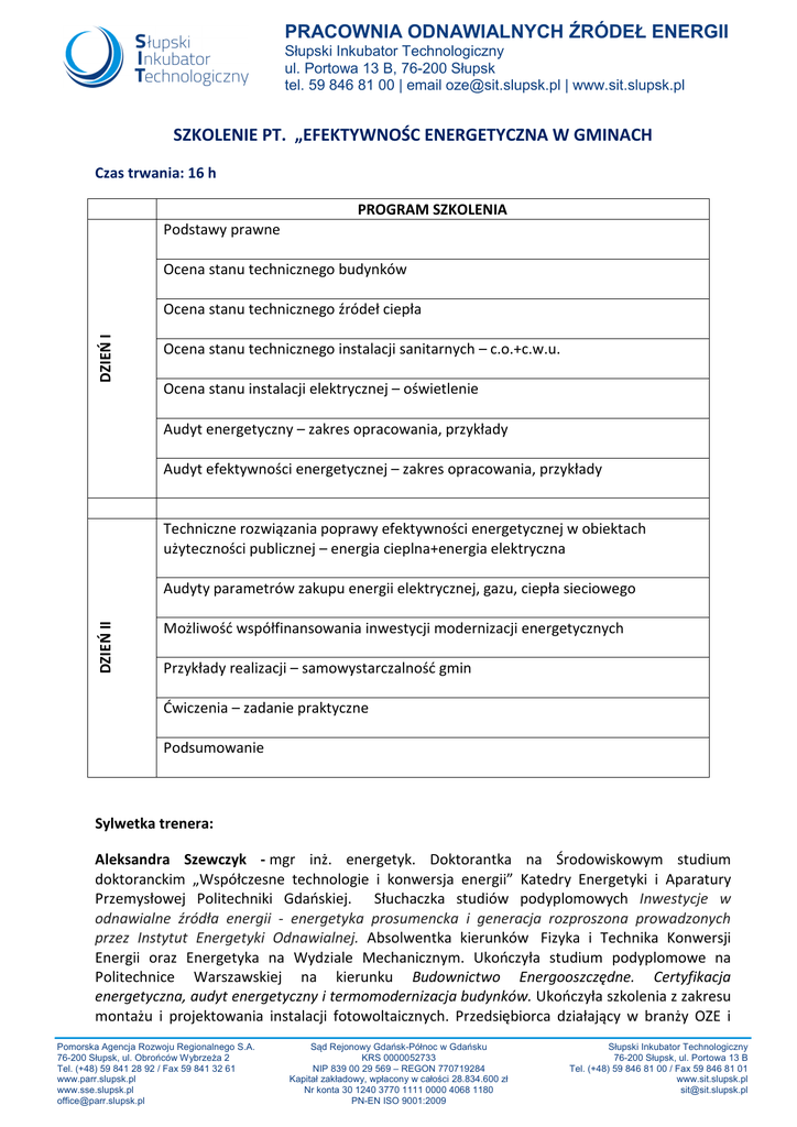 PRACOWNIA ODNAWIALNYCH ŹRÓDEŁ ENERGII Słupski Inkubator Technologiczny ul. Portowa 13 B, 76-200 Słupsk tel. 59 846 81 00 | email [email protected] | www.sit.slupsk.pl SZKOLENIE PT. „EFEKTYWNOŚC ENERGETYCZNA W GMINACH Czas trwania: 16 h PROGRAM SZKOLENIA Podstawy prawne Ocena stanu technicznego budynków DZIEŃ I Ocena stanu technicznego źródeł ciepła Ocena stanu technicznego instalacji sanitarnych – c.o.+c.w.u. Ocena stanu instalacji elektrycznej – oświetlenie Audyt energetyczny – zakres opracowania, przykłady Audyt efektywności energetycznej – zakres opracowania, przykłady Techniczne rozwiązania poprawy efektywności energetycznej w obiektach użyteczności publicznej – energia cieplna+energia elektryczna DZIEŃ II Audyty parametrów zakupu energii elektrycznej, gazu, ciepła sieciowego Możliwość współfinansowania inwestycji modernizacji energetycznych Przykłady realizacji – samowystarczalność gmin Ćwiczenia – zadanie praktyczne Podsumowanie Sylwetka trenera: Aleksandra Szewczyk - mgr inż. energetyk. Doktorantka na Środowiskowym studium doktoranckim „Współczesne technologie i konwersja energii” Katedry Energetyki i Aparatury Przemysłowej Politechniki Gdańskiej. Słuchaczka studiów podyplomowych Inwestycje w odnawialne źródła energii - energetyka prosumencka i generacja rozproszona prowadzonych przez Instytut Energetyki Odnawialnej. Absolwentka kierunków Fizyka i Technika Konwersji Energii oraz Energetyka na Wydziale Mechanicznym. Ukończyła studium podyplomowe na Politechnice Warszawskiej na kierunku Budownictwo Energooszczędne. Certyfikacja energetyczna, audyt energetyczny i termomodernizacja budynków. Ukończyła szkolenia z zakresu montażu i projektowania instalacji fotowoltaicznych. Przedsiębiorca działający w branży OZE i Pomorska Agencja Rozwoju Regionalnego S.A. 76-200 Słupsk, ul. Obrońców Wybrzeża 2 Tel. (+48) 59 841 28 92 / Fax 59 841 32 61 www.parr.slupsk.pl www.sse.slupsk.pl [email protected] Sąd Rejonowy Gdańsk-Północ w Gdańsku KRS 0000052733 NIP 839 00 29 569 – REGON 770719284 Kapitał zakładowy, wpłacony w całości 28.834.600 zł Nr konta 30 1240 3770 1111 0000 4068 1180 PN-EN ISO 9001:2009 Słupski Inkubator Technologiczny 76-200 Słupsk, ul. Portowa 13 B Tel. (+48) 59 846 81 00 / Fax 59 846 81 01 www.sit.slupsk.pl [email protected] PRACOWNIA ODNAWIALNYCH ŹRÓDEŁ ENERGII Słupski Inkubator Technologiczny ul. Portowa 13 B, 76-200 Słupsk tel. 59 846 81 00 | email [email protected] | www.sit.slupsk.pl efektywności energetycznej. Projektantka instalacji fotowoltaicznych. Specjalizuje się w opracowywaniu dokumentacji ukazującej możliwości zastosowania odnawialnych źródeł energii. Autorka audytów energetycznych, elektroenergetycznych, świadectw charakterystyki energetycznej. --------------------------------------------------------------------------------------------------------------------------Miejsce realizacji szkolenia: Słupski Inkubator Technologiczny - Pracownia Odnawialnych Źródeł Energii Ul. Portowa 13b 76-200 Słupsk SIT dysponuje jedną z największych w kraju oraz największą na Pomorzu dachową elektrownią PV o mocy 180,00 kW. oraz mikroinstalacjami oze (instalacje polikrystaliczne, monokrystaliczne, hybrydowe, traker oraz wiatrak) o mocy blisko 40kW zlokalizowanymi na gruncie przed budynkiem. Całość monitorowana na pośrednictwem systemu SCADA. Pomorska Agencja Rozwoju Regionalnego S.A. 76-200 Słupsk, ul. Obrońców Wybrzeża 2 Tel. (+48) 59 841 28 92 / Fax 59 841 32 61 www.parr.slupsk.pl www.sse.slupsk.pl [email protected] Sąd Rejonowy Gdańsk-Północ w Gdańsku KRS 0000052733 NIP 839 00 29 569 – REGON 770719284 Kapitał zakładowy, wpłacony w całości 28.834.600 zł Nr konta 30 1240 3770 1111 0000 4068 1180 PN-EN ISO 9001:2009 Słupski Inkubator Technologiczny 76-200 Słupsk, ul. Portowa 13 B Tel. (+48) 59 846 81 00 / Fax 59 846 81 01 www.sit.slupsk.pl [email protected]