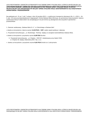 LISTA PRZYSTANKÓW I DWORCÓW AUTOBUSOWYCH NA TERENIE GMINY STALOWA WOLA, KTÓRYCH WŁAŚCICIELEM LUB ZARZĄDZAJĄCYM NIE JEST GMINA STALOWA WOLA UDOSTĘPNIONYCH DLA WSZYSTKICH OPERATORÓW I PRZEWOŹNIKÓW LISTA PRZYSTANKÓW I DWORCÓW AUTOBUSOWYCH NA TERENIE GMINY STALOWA WOLA, KTÓRYCH WŁAŚCICIELEM LUB ZARZĄDZAJĄCYM NIE JEST GMINA STALOWA WOLA UDOSTĘPNIONYCH DLA WSZYSTKICH OPERATORÓW I PRZEWOŹNIKÓW Na podstawie art. 15 ust. 1 pkt 7 ustawy z dnia 16 grudnia 2012 r. o publicznym transporcie zbiorowym (Dz. U. z 2011 r., Nr 5, poz. 13) oraz po przeprowadzonych negocjacjach, Gmina Stalowa Wola informuje, że wymienione niżej przystanki i dworce autobusowe których właścicielem lub zarządzającym nie jest Gmina są udostępnione dla wszystkich operatorów i przewoźników: 1. Dworzec autobusowy „Stalowa Wola D. A.”, ul. Okulickiego w Stalowe Woli’ ● stawka za korzystanie z dworca wynosi 13,50 PLN + VAT z jeden wjazd autobusu i odprawę 1. Przystanek komunikacyjny „ul. Okulickiego - Parking", będący w zarządzie Automobilklubu Stalowa Wola. ● stawka za korzystanie z przystanku wynosi 6,00 PLN /brutto/. 3. Przystanek komunikacyjny „ul. Chopina - VIVO 01" zlokalizowany przy Galerii VIVO, ul. Chopina 42, będący własnością ACE 2 Sp. z o.o. ● stawka za korzystanie z przystanku wynosi 0,62 PLN /brutto/ za 1 zatrzymanie. LISTA PRZYSTANKÓW I DWORCÓW AUTOBUSOWYCH NA TERENIE GMINY STALOWA WOLA, KTÓRYCH WŁAŚCICIELEM LUB ZARZĄDZAJĄCYM NIE JEST GMINA STALOWA WOLA UDOSTĘPNIONYCH DLA WSZYSTKICH OPERATORÓW I PRZEWOŹNIKÓW