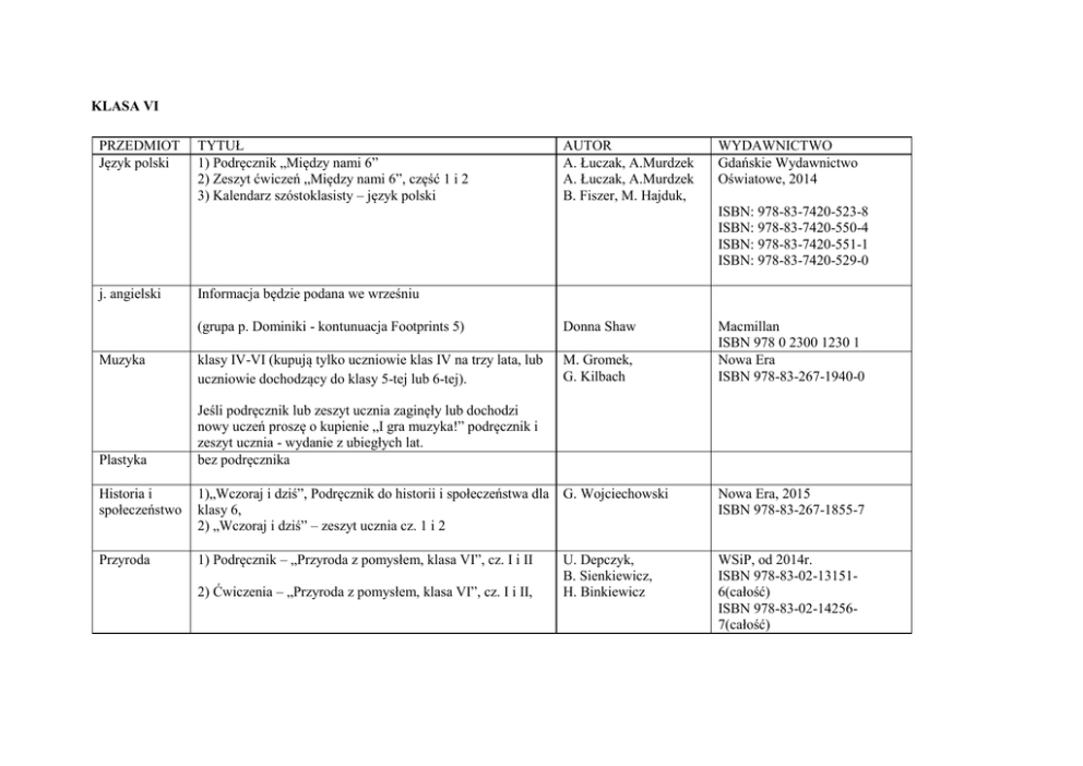 KLASA VI PRZEDMIOT Język polski TYTUŁ 1) Podręcznik „Między nami 6” 2) Zeszyt ćwiczeń „Między nami 6”, część 1 i 2 3) Kalendarz szóstoklasisty – język polski AUTOR A. Łuczak, A.Murdzek A. Łuczak, A.Murdzek B. Fiszer, M. Hajduk, WYDAWNICTWO Gdańskie Wydawnictwo Oświatowe, 2014 ISBN: 978-83-7420-523-8 ISBN: 978-83-7420-550-4 ISBN: 978-83-7420-551-1 ISBN: 978-83-7420-529-0 j. angielski Muzyka Plastyka Informacja będzie podana we wrześniu (grupa p. Dominiki - kontunuacja Footprints 5) Donna Shaw klasy IV-VI (kupują tylko uczniowie klas IV na trzy lata, lub uczniowie dochodzący do klasy 5-tej lub 6-tej). M. Gromek, G. Kilbach Macmillan ISBN 978 0 2300 1230 1 Nowa Era ISBN 978-83-267-1940-0 Jeśli podręcznik lub zeszyt ucznia zaginęły lub dochodzi nowy uczeń proszę o kupienie „I gra muzyka!” podręcznik i zeszyt ucznia - wydanie z ubiegłych lat. bez podręcznika Historia i społeczeństwo 1)„Wczoraj i dziś”, Podręcznik do historii i społeczeństwa dla G. Wojciechowski klasy 6, 2) „Wczoraj i dziś” – zeszyt ucznia cz. 1 i 2 Nowa Era, 2015 ISBN 978-83-267-1855-7 Przyroda 1) Podręcznik – „Przyroda z pomysłem, klasa VI”, cz. I i II WSiP, od 2014r. ISBN 978-83-02-131516(całość) ISBN 978-83-02-142567(całość) 2) Ćwiczenia – „Przyroda z pomysłem, klasa VI”, cz. I i II, U. Depczyk, B. Sienkiewicz, H. Binkiewicz Matematyka Zajęcia komputerowe Język hiszpański 1)Podręcznik „Matematyka 6” 2) Matematyka 6. Zeszyt ćwiczeń. Liczby i wyrażenia algebraiczne. Część I 3) Matematyka 6 Zeszyt ćwiczeń. Liczby i wyrażenia algebraiczne. Część II 4) Matematyka 6. Zeszyt ćwiczeń. Geometria 5) Matematyka 6. Zbiór zadań E-book Informatyka Europejczyka klasa VI (podręczniki zostaną zakupione przez nauczyciela we wrześniu) religia Clave de Sol 2 Podręcznik i zeszyt ćwiczeń; do nabycia w księgarniach internetowych, ale należy zamawiać je jak najszybciej, ponieważ okres oczekiwania jest długi.http://ksiegarniahiszpanska.pl/pl/dzieci/1214-clave-desol-1-cwiczenia-9788496942196.html „Wierzę w święty Kościół powszechny” etyka bez podręcznika Zajęcia techniczne “Jak to działa” dla klasy 6 (MEN 295/3/2010/2016) M. Dobrowolska, M. Karpiński M. Jucewicz, P. Zarzycki Gdańskie Wydawnictwo Oświatowe, od 2014r. nr w wykazie MEN: 340/3/2014 ISBN: 978-83-7420-522-1 Danuta Kiałka, Katarzyna Kiałka Helion (wydanie II) Monica Caso, En Clave M. Czyżewski, M. Polny, D. Kornacka Wydawnictwo Katechetyczne ISBN 9783364244162 Lech Łabecki, Marta Łabecka Nowa Era ISBN 978-83-267-1981-3