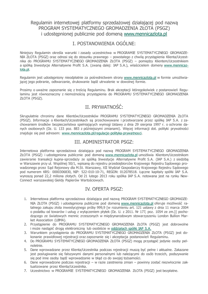 Regulamin internetowej platformy sprzedażowej działającej pod nazwą PROGRAM SYSTEMATYCZNEGO GROMADZENIA ZŁOTA (PSGZ) i udostępnionej publicznie pod domeną www.mennicazlota.pl I. POSTANOWIENIA OGÓLNE: Niniejszy Regulamin określa warunki i zasady uczestnictwa w PROGRAMIE SYSTEMATYCZNEGO GROMADZENIA ZŁOTA (PSGZ) oraz odnosi się do stosunku prawnego – powstałego z chwilą przystąpienia Klienta/Uczestnika do PROGRAMU SYSTEMATYCZNEGO GROMADZENIA ZŁOTA (PSGZ) – pomiędzy Klientem/Uczestnikiem a spółką Inwestycje Alternatywne Profit S.A. (zwaną dalej: IAP S.A.), właścicielem domeny www.mennicazlota.pl. Regulamin jest udostępniony nieodpłatnie za pośrednictwem strony www.mennicazlota.pl w formie umożliwiającej jego pobranie, odtwarzanie, drukowanie bądź utrwalenie w dowolnej formie. Prosimy o uważne zapoznanie się z treścią Regulaminu. Brak akceptacji któregokolwiek z postanowień Regulaminu jest równoznaczny z niemożnością przystąpienia do PROGRAMU SYSTEMATYCZNEGO GROMADZENIA ZŁOTA (PSGZ). II. PRYWATNOŚĆ: Skrupulatnie chronimy dane Klientów/Uczestników PROGRAMU SYSTEMATYCZNEGO GROMADZENIA ZŁOTA (PSGZ). Informacje o Klientach/Uczestnikach są przechowywane i przetwarzane przez spółkę IAP S.A. z zachowaniem środków bezpieczeństwa spełniających wymogi Ustawy z dnia 29 sierpnia 1997 r. o ochronie danych osobowych (Dz. U. 133 poz. 883 z późniejszymi zmianami). Więcej informacji dot. polityki prywatności znajduje się pod adresem: www.mennicazlota.pl/regulacje-polityka-prywatnosci. III. ADMINISTRATOR PSGZ: Internetowa platforma sprzedażowa działająca pod nazwą PROGRAM SYSTEMA TYCZNEGO GROMADZENIA ZŁOTA (PSGZ) i udostępniona publicznie pod domeną www.mennicazlota.pl umożliwia Klientom/Uczestnikom zawieranie transakcji kupna-sprzedaży ze spółką Inwestycje Alternatywne Profit S.A. (IAP S.A.) z siedzibą w Warszawie przy ul. Wspólnej 50/1, wpisaną do rejestru przedsiębiorców Krajowego Rejestru Sądowego prowadzonego przez Sąd Rejonowy dla M.St. Warszawy, XII Wydział Gospodarczy Krajowego Rejestru Sądowego pod numerem KRS: 0000306830, NIP: 522-010-10-71, REGON: 012078518. Łączne kapitały spółki IAP S.A. wynoszą ponad 22,2 miliona złotych. Od 21 lutego 2013 roku spółka IAP S.A. notowana jest na rynku NewConnect warszawskiej Giełdy Papierów Wartościowych. IV. OFERTA PSGZ: 1. 2. 3. 4. 5. 6. 7. Internetowa platforma sprzedażowa działająca pod nazwą PROGRAM SYSTEMATYCZNEGO GROMADZENIA ZŁOTA (PSGZ) i udostępniona publicznie pod domeną www.mennicazlota.pl oferuje możliwość ratalnego zakupu złota inwestycyjnego próby 999,9 [w rozumieniu art. 121 ustawy z dnia 11 marca 2004 o podatku od towarów i usług z wyłączeniem płytek (Dz. U. z 2011. Nr 177, poz. 1054 ze zm.)] pochodzącego ze światowych mennic zrzeszonych w międzynarodowym stowarzyszeniu London Bullion Market Association (LBMA). Przystąpienie do PROGRAMU SYSTEMATYCZNEGO GROMADZENIA ZŁOTA (PSGZ) jest dobrowolne i może nastąpić drogą elektroniczną lub osobiście w oddziałach spółki IAP S.A. Warunkiem przystąpienia do PROGRAMU SYSTEMATYCZNEGO GROMADZENIA ZŁOTA (PSGZ) jest dokonanie prawidłowej rejestracji oraz zapoznanie się i akceptacja postanowień Regulaminu. Do PROGRAMU SYSTEMATYCZNEGO GROMADZENIA ZŁOTA (PSGZ) mogą przystąpić jedynie osoby pełnoletnie. Dane wprowadzane przez Klienta/Uczestnika podczas rejestracji muszą być pełne i aktualne. Zakazane jest posługiwanie się fałszywymi danymi personalnymi lub należącymi do osób trzecich, podszywanie się pod inne osoby bądź wprowadzanie w błąd co do swojej tożsamości. Dane wprowadzone podczas rejestracji – w razie zaistnienia zmian – powinny zostać niezwłocznie zaktualizowane przez Klienta/Uczestnika. Uczestnictwo w PROGRAMIE SYSTEMATYCZNEGO GROMADZENIA ZŁOTA (PSGZ) jest bezpłatne. 8. 9. Jednostką rozliczeniową (JR) w PROGRAMIE SYSTEMATYCZNEGO GROMADZENIA ZŁOTA (PSGZ) jest 5-gramowa sztabka złota próby 999,9 z akredytacją LBMA. Zakupu złota za pośrednictwem PROGRAMU SYSTEMATYCZNEGO GROMADZENIA ZŁOTA (PSGZ) można dokonać jednorazowo lub ratalnie, kupując dowolną liczbę jednostek rozliczeniowych (JR) lub ich części, które liczone są z dokładnością do trzech miejsc po przecinku. 10. Za dzień zawarcia umowy uznaje się dzień, w którym została zaksięgowana wpłata na rachunku ban- kowym spółki IAP S.A. Cena jednostki rozliczeniowej (JR) lub jej części ustalana jest w oparciu o: 1. opublikowany w dniu zawarcia umowy przez LBMA poranny kurs ceny 1 uncji złota wyrażonej w dolarach USD. w przypadku braku publikacji porannego kursu ceny złota w dniu zawarcia umowy, cenę jednostki rozliczeniowej (JR) lub jej części ustala się w oparciu o ostatni dostępny kurs ceny 1 uncji złota wyrażonej w dolarach USD ustalonej przez LBMA. 2. Kurs dolara USD w przeliczeniu na PLN. Przeliczenie odbywa się według średniego kursu dolara opublikowanego przez NBP w tabeli a w dniu zawarcia umowy. 3. Koszt produkcji sztabki, który maksymalnie może stanowić równowartość 13 USD, w przeliczeniu na PLN według średniego kursu dolara opublikowanego przez NBP w tabeli a w dniu zawarcia umowy. 4. Marżę spółki IAP S.A., która dla jednostki rozliczeniowej (JR), w postaci sztabki o wadze 5 gramów, wynosi maksymalnie 4%. 11. z chwilą ustanowienia parametrów deklarowanych wpłat w PROGRAMIE SYSTEMATYCZNEGO GROMADZENIA ZŁOTA (PSGZ), Klient/Uczestnik powinien niezwłocznie dokonać wpłaty na konto bankowe spółki IAP S.A. 12. Minimalna wpłata dokonana przez Klienta/Uczestnika w ramach PROGRAMU SYSTEMATYCZNEGO GROMADZENIA ZŁOTA (PSGZ) wynosi 50 złotych. 13. W ciągu maksymalnie 2 dni roboczych zaksięgowana wpłata na rachunku bankowym spółki IAP S.A., zostanie przeksięgowywana na jednostki rozliczeniowe (JR) lub ich część. Przeksięgowanie wpłaty na jednostki rozliczeniowe (JR) lub ich część, nastąpi według notowań z dnia zaksięgowan