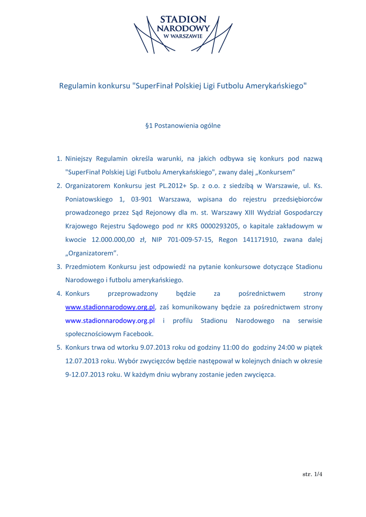 Regulamin konkursu "SuperFinał Polskiej Ligi Futbolu Amerykańskiego" §1 Postanowienia ogólne 1. Niniejszy Regulamin określa warunki, na jakich odbywa się konkurs pod nazwą "SuperFinał Polskiej Ligi Futbolu Amerykańskiego", zwany dalej „Konkursem” 2. Organizatorem Konkursu jest PL.2012+ Sp. z o.o. z siedzibą w Warszawie, ul. Ks. Poniatowskiego 1, 03-‐901 Warszawa, wpisana do rejestru przedsiębiorców prowadzonego przez Sąd Rejonowy dla m. st. Warszawy XIII Wydział Gospodarczy Krajowego Rejestru Sądowego pod nr KRS 0000293205, o kapitale zakładowym w kwocie 12.000.000,00 zł, NIP 701-‐009-‐57-‐15, Regon 141171910, zwana dalej „Organizatorem”. 3. Przedmiotem Konkursu jest odpowiedź na pytanie konkursowe dotyczące Stadionu Narodowego i futbolu amerykańskiego. 4. Konkurs przeprowadzony będzie za pośrednictwem strony www.stadionnarodowy.org.pl, zaś komunikowany będzie za pośrednictwem strony www.stadionnarodowy.org.pl i profilu Stadionu Narodowego na serwisie społecznościowym Facebook. 5. Konkurs trwa od wtorku 9.07.2013 roku od godziny 11:00 do godziny 24:00 w piątek 12.07.2013 roku. Wybór zwycięzców będzie następował w kolejnych dniach w okresie 9-‐12.07.2013 roku. W każdym dniu wybrany zostanie jeden zwycięzca. str. 1/4 § 2 Uczestnicy Konkursu 1. W Konkursie mogą wziąć udział osoby fizyczne, które ukończyły 18 lat, z zastrzeżeniem ust. 2 poniżej, będące obywatelami Rzeczpospolitej Polskiej. 2. Organizator dopuszcza udział w Konkursie osób niepełnoletnich, które nie ukończyły 18 roku życia, pod warunkiem dołączenia pisemnej zgody przedstawicieli ustawowych lub opiekunów. 3. Z udziału w Konkursie są wykluczeni pracownicy Organizatora, osoby pozostające z Organizatorem w stosunku zlecenia lub innym stosunku prawnym oraz członkowie ich rodzin. § 3 Warunki udziału w konkursie 1. Warunkiem wzięcia udziału w konkursie jest odpowiedź na pytanie konkursowe z danego dnia, opublikowane na stronie www.stadionnarodowy.org.pl. Codziennie zadawane będzie jedno pytanie konkursowe. 2. Odpowiedzi należy przesłać na adres [email protected] wraz z danymi umożliwiającymi identyfikację autora odpowiedzi (imię i nazwisko, nr PESEL, adres zamieszkania oraz nr telefonu). W temacie maila należy wpisać hasło: KONKURS. 3. W konkursie codziennie zostanie wytypowany 1 zwycięzca. Konkurs będzie trwał przez cztery kolejne dni. W sumie w konkursie wyłonionych zostanie czterech zwycięzców 4. Uczestnik może przesłać zgłoszenie do godz. 24 każdego dnia trwania konkursu (9-‐ 12 lipca 2013 r.) str. 2/4 5. Zgłoszenia przesłane po terminie określonym w ust. 4 powyżej, tj. po godzinie 24.00 w dniu 12 lipca 2013 r. nie będą brane przez Organizatora pod uwagę. 6. Każdy z Uczestników może przesłać tylko jedno zgłoszenie. 7. Wygrywa osoba, która jako pierwsza udzieli prawidłowej odpowiedzi na pytania konkursowe – decyduje godzina wysłania e-‐maila. §4 Zasady i przebieg Konkursu 1. Nad prawidłowym przebiegiem Konkursu i przyznaniem nagród czuwają osoby powołane przez Organizatora (Jury). 2. W skład Jury wchodzą 3 osoby powołane przez Organizatora. 3. Konkurs składa się z jednego etapu, w którym należy przesłać zgłoszenie do udziału w Konkursie poprzez przesłanie na adres e-‐mail wskazany w § 3 ust. 2 odpowiedzi na pytania konkursowe, o którym mowa w § 3 ust. 1 oraz danych umożliwiających identyfikację autora (imię i nazwisko, nr PESEL, adres zamieszkania oraz nr telefonu). 4. Spośród przesłanych odpowiedzi Jury codziennie wybierze najszybciej przysłaną poprawną odpowiedź i opublikuje zwycięzcę na stronie www.stadionnarodowy.org.pl przez cztery kolejne dni trwania konkursu (9-‐12 lipca 2013 r.). 5. Jury będzie ogłaszać jednego zwycięzcę każdego dnia trwania konkursu, przez cztery kolejne dni (9-‐12 lipca), po otrzymaniu pierwszej prawidłowej odpowiedzi. Ogłoszenie nastąpi również na serwisie społecznościowym Facebook. Organizator skontaktuje się ze zwycięzcą drogą telefoniczną w ciągu godziny od ogłoszenia. W przypadku nieudanej próby połączenia Organizator podejmie drugą próbę nawiązania kontaktu. Dwie nieudane próby połączenia z wyłonionym danym Zwycięzcą skutkują utratą prawa do nagrody dla tego Uczestnika. W takim przypadku Organizator skontaktuje się z Uczestnikiem, który przysłał prawidłową odpowiedż jako następny w kolejności. str. 3/4 §5 Nagroda 1. Dla 4 Uczestników, którzy jako pierwsi nadeślą prawidłowe odpowiedzi na pytania konkursowe przez kolejne dni trwania konkursu, przewidziana jest nagroda: po zestawie czterech biletów na Trawnik Producent VIII SuperFinał Polskiej Ligi Futbolu Amerykańskiego (o wartości 150 zł brutto każda nagroda). 2. Nagroda będzie do odbioru w siedzibie Organizatora przy ul. Ks. Poniatowskiego 1 w postaci zestawu czterech biletów. 3. W celu dokonania identyfikacji zwycięzcy, przy odbiorze nagrody winien on okazać dokument tożsamości ze zdjęciem. 4. Nagroda konkursowa będzie wydawana wyłącznie w postaci określonej niniejszym regulaminem, bez możliwości wypłaty jej równowartości w gotówce lub zamiany na inną nagrodę rzeczową. 5. W razie konieczności opodatkowania nagród w konkursie podatkiem dochodowym od osób fizycznych, obok nagrody konkursowej zwycięzcom zostanie przyznana premia pieniężna w wysokości 11,11% wartości brutto nagrody konkursowej. Wówczas premia pieniężna zostanie przeznaczona na pokrycie zryczałtowanego podatku dochodowego od osób fizycznych. W takim przypadku, uczestnicy konkursu wyrażają zgodę i upoważniają Organizatora do zatrzymania przez niego premii pieniężnej w celu przekazania jej na poczet podatku. W przypadku gdy, zgodnie z obowiązującymi przepisami prawa, nagrody w konkursie nie będą podlegały opodatkowaniu podatkiem dochodowym od osób fizycznych lub będą zwolnione z tego podatku premia nie zostanie przyznana