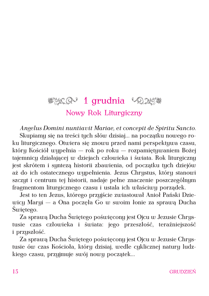 1 grudnia Nowy Rok Liturgiczny Angelus Domini nuntiavit Mariae, et concepit de Spiritu Sancto. Skupiamy się na treści tych słów dzisiaj... na początku nowego roku liturgicznego. Otwiera się znowu przed nami perspektywa czasu, który Kościół wypełnia — rok po roku — rozpamiętywaniem Bożej tajemnicy działającej w dziejach człowieka i świata. Rok liturgiczny jest skrótem i syntezą historii zbawienia, od początku tych dziejów aż do ich ostatecznego wypełnienia. Jezus Chrystus, który stanowi szczyt i centrum tej historii, nadaje pełne znaczenie poszczególnym fragmentom liturgicznego czasu i ustala ich właściwy porządek. Jest to ten Jezus, którego przyjście zwiastował Anioł Pański Dziewicy Maryi — a Ona poczęła Go w swoim łonie za sprawą Ducha Świętego. Za sprawą Ducha Świętego poświęcony jest Ojcu w Jezusie Chrystusie czas człowieka i świata: jego przeszłość, teraźniejszość i przyszłość. Za sprawą Ducha Świętego poświęcony jest Ojcu w Jezusie Chrystusie ów czas Kościoła, który dzisiaj, wedle cyklicznej natury ludzkiego czasu, przyjmuje swój nowy początek... 15 GRUDZIEŃ Wejdźmy w ten nowy rok liturgiczny z wiarą i nadzieją! Wejdźmy z miłością, jaka „rozlana jest w sercach naszych przez Ducha Świętego, który został nam dany” (Rz 5, 5)! Najpełniej doznała tego daru Dziewica z Nazaretu, która za sprawą Ducha Świętego stała się Matką Boga. 2 grudnia Adwent, to przyjście Pana Adventus, czyli „przyjście”. Bóg przychodzi do człowieka. To jest podstawowy wymiar naszej wiary. Żyjemy wiarą, gdy otwieramy się na „przyjście Boga”, gdy trwamy „w adwencie”. Modlitwa „Anioł Pański”, którą odmawiamy, przypomina nam, jak była otwarta na przyjście Boga Najświętsza Maryja Panna: Ona wprowadza nas w Adwent. Myślę przede wszystkim o tym adwencie, który urzeczywistnia się w sakramencie chrztu świętego. Człowiek przychodzi na świat. Rodzi się jako dziecko swoich rodziców. Rodzice świadomi tego dziedzictwa, kierując się wiarą w Słowo Chrystusa, przynoszą to swoje dziecko do chrztu. Pragną otworzyć jego duszę na przyjście Zbawiciela, na Jego „adwent”. W ten sposób adwent oznacza też początek nowego życia. Zostaje niejako zdjęta z tego dziecięcia pieczęć grzechu pierworodnego i zostaje wszczepiony początek nowego życia, Bożego życia. Chrystus bowiem nie przychodzi z próżnymi rękami. Przynosi nam Boże życie. Chce, abyśmy życie mieli i mieli je w obfitości (por. J 10, 10). Wiadomo, że każda parafia jest miejscem chrztu. W ten sposób staje się ona też miejscem „przyjścia”. Nieustannie trwa „w adwencie”. Oczekuje w każdym nowym parafianinie na przyjście Pana. GRUDZIEŃ 16 3 grudnia Łaska przyjścia Oczekiwanie chrześcijańskie to wytrwałość w wierze i w walce... Adwent uświadamia wszystkim to, że dane nam zostało zbawienie przez łaskę w Przyjściu Pana naszego Jezusa Chrystusa. Otwórzmy na nowo serca nasze, aby mogła w nich działać łaska tegorocznego Adwentu w całym swoim bogactwie i głębi. Adwent jest czasem oczekiwania; oczekiwanie chrześcijańskie to wytrwałość w wierze i w walce, mocą łaski Chrystusa, która jest w nas. Adwent otwiera rokrocznie jakby nowy rozdział w księdze zbawienia, którą Bóg pisze w Kościele. Pisze poprzez dzieje człowieka. Trzeba być pokornym, ażeby przyjmować Boże pouczenia i przykazania; trzeba być pokornym, ażeby łaska Boża mogła w nas działać, przeobrażać nasze życie i przynosić owoc dobra. Wzniesienie duszy dokonuje się przez poznanie Boga i Jego dróg: „Daj mi poznać Twoje drogi, Panie, naucz mnie chodzić Twoimi ścieżkami. Prowadź mnie w prawdzie według Twych pouczeń, Boże i Zbawco, w Tobie mam nadzieję” (Ps. 25, 4–5). Chodzi, jak widać, nie o poznanie abstrakcyjne, ale o takie, które ma wpływ na życie. „Naucz mnie chodzić Twoimi drogami” — to znaczy naucz mnie żyć po Bożemu. W tym wewnętrznym wysiłku chodzi o to, by na nowo odkryć i przekonać się, że „Pan jest dobry”. Są to życzenia „adwentowe” — i prośby „adwentowe”. Przedkładam je wam w perspektywie świąt Bożego Narodzenia. 17 GRUDZIEŃ 4 grudnia Przygotujcie drogi Panu „Przygotujcie drogę Panu, prostujcie ścieżki dla Niego; wszyscy ludzie ujrzą zbawienie Boże” (Łk 3, 4.6). Alleluja, alleluja, alleluja. Czy można ujrzeć „zbawienie”? Co to znaczy „zbawienie”? Co to znaczy „być zbawionym”? To znaczy: być uwolnionym od zła, wyzwolonym od zła. To znaczy równocześnie i przede wszystkim: być ogarnionym dobrem, być wypełnionym dobrem. Zbawienie — to znaczy: udział w dobru — udział nieodwracalny w dobru niezniszczalnym i ostatecznym. „Ludzie ujrzą zbawienie Boże”. Adwent mówi o zbawieniu, które przychodzi do człowieka od Boga. Od samego Boga. Jaka jest wiarygodność tych słów dzisiaj? Człowiek, tak samo dzisiaj jak wówczas, wie z doświadczenia — ogólnoludzkiego doświadczenia — że jego egzystencja w świecie widzialnym nie daje mu udziału w dobru niezniszczalnym i ostatecznym. A jeśli ta ziemska egzystencja obdarza człowieka różnymi dobrami, jeśli suma tych dóbr istniejących w świecie oraz wytworzonych przez rodzaj ludzki, zwiększa się i potęguje — to równocześnie wszystkie one razem nie są zdolne „zbawić” człowieka, czyli wyzwolić go od wszelkiego zła i ugruntować go w pełni dobra. Owszem, człowiek dzisiejszy w kosmicznym wymiarze swej egzystencji może bardziej jeszcze i boleśniej jeszcze odczuwać zagrożenie wielorakim złem. Jest to jednakże argument wyłącznie negatywny. Prorok nawet tym argumentem w ogóle się nie posługuje. Mówi wprost „zbawi was Bóg” — „wszyscy ludzie ujrzą zbawienie Boże”. Bóg powiedział, że chce zbawić człowieka. GRUDZIEŃ 18 Mówił to przez Izajasza i wszystkich Proroków. Mówił przez Jana Chrzciciela. Przede wszystkim