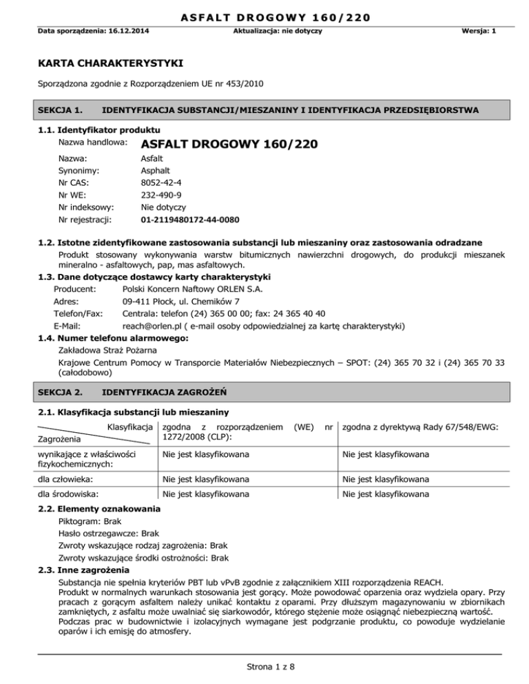 ASFALT DROGOWY 160/220 Data sporządzenia: 16.12.2014 Aktualizacja: nie dotyczy Wersja: 1 KARTA CHARAKTERYSTYKI Sporządzona zgodnie z Rozporządzeniem UE nr 453/2010 SEKCJA 1. IDENTYFIKACJA SUBSTANCJI/MIESZANINY I IDENTYFIKACJA PRZEDSIĘBIORSTWA 1.1. Identyfikator produktu Nazwa handlowa: ASFALT DROGOWY 160/220 Nazwa: Asfalt Synonimy: Asphalt Nr CAS: 8052-42-4 Nr WE: 232-490-9 Nr indeksowy: Nie dotyczy Nr rejestracji: 01-2119480172-44-0080 1.2. Istotne zidentyfikowane zastosowania substancji lub mieszaniny oraz zastosowania odradzane Produkt stosowany wykonywania warstw bitumicznych nawierzchni drogowych, do produkcji mieszanek mineralno - asfaltowych, pap, mas asfaltowych. 1.3. Dane dotyczące dostawcy karty charakterystyki Producent: Polski Koncern Naftowy ORLEN S.A. Adres: 09-411 Płock, ul. Chemików 7 Telefon/Fax: Centrala: telefon (24) 365 00 00; fax: 24 365 40 40 E-Mail: [email protected] ( e-mail osoby odpowiedzialnej za kartę charakterystyki) 1.4. Numer telefonu alarmowego: Zakładowa Straż Pożarna Krajowe Centrum Pomocy w Transporcie Materiałów Niebezpiecznych – SPOT: (24) 365 70 32 i (24) 365 70 33 (całodobowo) SEKCJA 2. IDENTYFIKACJA ZAGROŻEŃ 2.1. Klasyfikacja substancji lub mieszaniny Klasyfikacja Zagrożenia zgodna z rozporządzeniem 1272/2008 (CLP): (WE) nr zgodna z dyrektywą Rady 67/548/EWG: wynikające z właściwości fizykochemicznych: Nie jest klasyfikowana Nie jest klasyfikowana dla człowieka: Nie jest klasyfikowana Nie jest klasyfikowana dla środowiska: Nie jest klasyfikowana Nie jest klasyfikowana 2.2. Elementy oznakowania Piktogram: Brak Hasło ostrzegawcze: Brak Zwroty wskazujące rodzaj zagrożenia: Brak Zwroty wskazujące środki ostrożności: Brak 2.3. Inne zagrożenia Substancja nie spełnia kryteriów PBT lub vPvB zgodnie z załącznikiem XIII rozporządzenia REACH. Produkt w normalnych warunkach stosowania jest gorący. Może powodować oparzenia oraz wydziela opary. Przy pracach z gorącym asfaltem należy unikać kontaktu z oparami. Przy dłuższym magazynowaniu w zbiornikach zamkniętych, z asfaltu może uwalniać się siarkowodór, którego stężenie może osiągnąć niebezpieczną wartość. Podczas prac w budownictwie i izolacyjnych wymagane jest podgrzanie produktu, co powoduje wydzielanie oparów i ich emisję do atmosfery. Strona 1 z 8 ASFALT DROGOWY 160/220 Data sporządzenia: 16.12.2014 SEKCJA 3. Aktualizacja: nie dotyczy Wersja: 1 SKŁAD/INFORMACJA O SKŁADNIKACH 3.1. Substancje Nazwa substancji Wzór % wagowy Nr CAS Nr WE Nr indeksowy Asfalt Nie dotyczy 100 8052-42-4 232-490-9 Nie dotyczy Bardzo złożona mieszanina związków organicznych o dużym ciężarze cząsteczkowym zawierająca stosunkowo dużą ilość węglowodorów o liczbie atomów węgla przeważnie większej od C25 o ilości różnych metali takich jak nikiel, żelazo lub wanad; otrzymuje się ją jako nielotną pozostałość po destylacji ropy naftowej lub w wyniku separacji jako rafinat z pozostałości olejowych w procesie odasfaltowania lub dekarbonizacji. SEKCJA 4. ŚRODKI PIERWSZEJ POMOCY 4.1. Opis środków pierwszej pomocy Wdychanie: Wynieść poszkodowanego na świeże powietrze, ułożyć w pozycji leżącej, rozluźnić odzież, jeżeli poszkodowany nie oddycha, zastosować sztuczne oddychanie; jeżeli nie stwierdza się czynności serca, zastosować masaż serca w połączeniu ze sztucznym oddychaniem używając maseczki ratowniczej do sztucznego oddychania, okryć poszkodowanego, zapewnić spokój, nie podawać płynów osobie nieprzytomnej i przy zaburzeniach świadomości. Transport przeprowadzić w pozycji leżącej, bocznej. Kontakt ze skórą: Miejsce oparzenia schłodzić tak szybko jak to możliwe w celu ograniczenia wpływu ciepła na powstanie jeszcze poważniejszych zmian oparzeniowych. Miejsce oparzenia należy chłodzić bieżącą zimną wodą przez przynajmniej 10 minut. Należy przy tym unikać nadmiernego wychłodzenia ciała. Nie próbować usuwać asfaltu z obszaru oparzenia. Asfalt po schłodzeniu tworzy wodoodporną, jałową powłokę na oparzeniu, która zapobiega jego wysuszaniu. Zanieczyszczone ubranie można zdjąć pod warunkiem, że nie przywarło ono do skóry. Skonsultować się z lekarzem. Kontakt z oczami: Przemyć bieżącym i łagodnym strumieniem wody pitnej przez okres ok. 15 minut, przy odwiniętych powiekach, usunąć szkła kontaktowe, nie wycierać oczu, założyć jałowy, luźny opatrunek. Natychmiast skonsultować się z lekarzem. Połknięcie: Nie prowokować wymiotów, gdyż istnieje możliwość przedostania się produktu do dróg oddechowych. Nie podawać nic doustnie. Jeżeli nie nastąpi poprawa zapewnić pomoc medyczną. 4.2. Najważniejsze ostre i opóźnione objawy oraz skutki narażenia Nie określono. 4.3. Wskazania dotyczące wszelkiej natychmiastowej pomocy lekarskiej i szczególnego postępowania z poszkodowanym W razie przypadkowego kontaktu gorącego asfaltu ze skórą nie należy podejmować żadnej próby usuwania go. W każdym z wyżej podanych przypadków postępowania, gdy zaburzenia nie ustępują, należy natychmiast wezwać lekarza lub odwieźć poszkodowanego do szpitala, pokazać opakowanie produktu lub etykietę. SEKCJA 5. POSTĘPOWANIE W PRZYPADKU POŻARU 5.1. Środki gaśnicze Odpowiednie środki gaśnicze: Dwutlenek węgla, proszek gaśniczy, piana gaśnicza, piasek, rozproszone prądy wodne, para gaśnicza. Niewłaściwe środki gaśnicze: Nie stosować zwartych strumieni wody na powierzchnię stopionego asfaltu – groźba gwałtownych rozprysków gorącego asfaltu. Woda może zostać użyta jedynie do chłodzenia gorących powierzchni. 5.2. Szczególne zagrożenia związane z substancją lub mieszaniną Przylepianie się gorącego asfaltu do ciała i ubrania. W czasie kontaktu gorącego produktu z wodą następuje pienienie lub rozpryski. W trakcie pożaru wydzielające się gazy i opary są cięższe od powietrza i mogą gromadzić się w zagłębieniach terenu, rozprzestrze