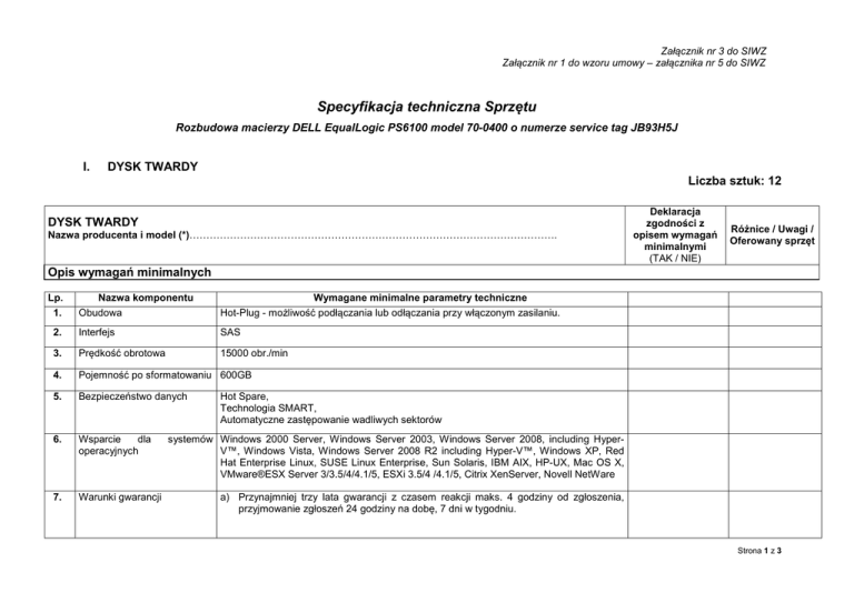 Załącznik nr 3 do SIWZ Załącznik nr 1 do wzoru umowy – załącznika nr 5 do SIWZ Specyfikacja techniczna Sprzętu Rozbudowa macierzy DELL EqualLogic PS6100 model 70-0400 o numerze service tag JB93H5J I. DYSK TWARDY Liczba sztuk: 12 DYSK TWARDY Nazwa producenta i model (*)………………………………………………………………………………………………. Deklaracja zgodności z opisem wymagań minimalnymi (TAK / NIE) Różnice / Uwagi / Oferowany sprzęt Opis wymagań minimalnych Lp. 1. Nazwa komponentu Obudowa Wymagane minimalne parametry techniczne Hot-Plug - możliwość podłączania lub odłączania przy włączonym zasilaniu. 2. Interfejs SAS 3. Prędkość obrotowa 15000 obr./min 4. Pojemność po sformatowaniu 600GB 5. Bezpieczeństwo danych 6. Wsparcie dla operacyjnych 7. Warunki gwarancji Hot Spare, Technologia SMART, Automatyczne zastępowanie wadliwych sektorów systemów Windows 2000 Server, Windows Server 2003, Windows Server 2008, including HyperV™, Windows Vista, Windows Server 2008 R2 including Hyper-V™, Windows XP, Red Hat Enterprise Linux, SUSE Linux Enterprise, Sun Solaris, IBM AIX, HP-UX, Mac OS X, VMware®ESX Server 3/3.5/4/4.1/5, ESXi 3.5/4 /4.1/5, Citrix XenServer, Novell NetWare a) Przynajmniej trzy lata gwarancji z czasem reakcji maks. 4 godziny od zgłoszenia, przyjmowanie zgłoszeń 24 godziny na dobę, 7 dni w tygodniu. Strona 1 z 3 b) Firma serwisująca musi posiadać ISO 9001:2000 na świadczenie usług serwisowych oraz posiadać autoryzacje producenta – dokumenty potwierdzające załączyć do oferty. c) Oświadczenie producenta dysków, że w przypadku nie wywiązywania się z obowiązków gwarancyjnych oferenta lub firmy serwisującej, przejmie na siebie wszelkie zobowiązania związane z serwisem. d) Zamawiający wymaga możliwości rozszerzenia serwisu macierzy po rozbudowie dysków twardych o dwa kolejne lata po wygaśnięciu gwarancji. e) W cenie wymagana instalacja i konfiguracja. f) W czasie obowiązywania gwarancji dostawca zobowiązany jest do udostępnienia Zamawiającemu nowych wersji BIOS, firmware i sterowników (na płytach CD lub stronach internetowych) g) W przypadku awarii dysku twardego uszkodzony nośnik pozostaje u Zamawiającego. II. PRZEŁĄCZNIK SIECIOWY Liczba sztuk: 2 PRZEŁĄCZNIK SIECIOWY Nazwa producenta i model (*)………………………………………………………………………………………………. Deklaracja zgodności z opisem wymagań minimalnymi (TAK / NIE) Różnice / Uwagi / Oferowany sprzęt Opis wymagań minimalnych Lp. Nazwa komponentu Ilość portów 1. 2. Wymiar Funkcjonalność 3. Wymagane minimalne parametry techniczne 24 przełączanych portów Gigabit Ethernet 10/100/1000BASE-T z automatycznym wykrywaniem prędkości. 4 porty SFP 1 Gb Przełącznik ma być wyposażony w moduł do połączenia w stos wraz z kablem 19 cali – do montażu w szafie rakowej, wysokość max 1 U Pojemność 136.0 Gb/s Przepustowość 95 Mpps Min. Obsługa do 8,000 MAC adresów Auto-negocjacja prędkości, duplex mode i flow control; Auto MDI/MDIX; Broadcast storm control Energy Efficient Ethernet (IEEE802.3az) Strona 2 z 3 Warunki gwarancji 4. Serwis pogwarancyjny 5. Wsparcie dla: Spanning Tree (IEEE 802.1D), Rapid Spanning Tree (IEEE 802.1w) Fast Link Support; Multiple spanning trees (IEEE 802.1s); (VRRP); VLAN IEEE 802.1Q, QinQ; do min. 1024 wspieranych VLAN; Dynamic VLAN ze wsparciem dla GVRP Wsparcie warstwy drugiej (IEEE 802.1p tagging, wsparcie warstwy trzeciej (DSCP); wsparcie warstwy czwartej (TCP/UDP); wsparcie WRR i SQS; Wsparcie dla IGMP v1/v2/v3; Static IP Multicast; Dynamic Multicast – do min. 256 Multicast grup wspieranych w IGMP Snooping; wsparcie dla PIM-DM, PIM-SM Wsparcie dla: RIP v1/v2; OSPF v1/v2/v3; CIDR; ICMP; IRDP; VRRP; ARP; IGMP v2; DVMRP Wsparcie dla IEEE 802.1xDostęp do zarządzania przełącznikiem chroniony hasłem LLDP-MED; Zarządzanie poprzez Telnet, HTTP, HTTPS/SSL, SSH and SNMP; RADIUS and TACACS+ remote authentication for switch management access; Min. wsparcie dla 100 ACL oraz min 127 ACE na jeden ACL Enkrypcja SSLv3 i SSHv2 Agregacja połączeń ze wsparciem dla min. 128 statycznych zagregowanych połączeń, 8 dynamicznych zagregowanych połączeń na przełącznik Wsparcie dla IEEE 802.3ad IEEE 802.1AB Przynajmniej trzy lata gwarancji z czasem reakcji maks. 4 godziny od zgłoszenia, przyjmowanie zgłoszeń 24 godziny na dobę, 7 dni w tygodniu. Wszystkie naprawy gwarancyjne powinny być możliwe na miejscu. Dostawca ponosi koszty napraw gwarancyjnych, włączając w to koszt części i transportu. W czasie obowiązywania gwarancji dostawca zobowiązany jest do udostępnienia Zamawiającemu nowych wersji BIOS, firmware i sterowników (na płytach CD lub stronach internetowych). Zamawiający wymaga możliwości rozszerzenia serwisu o dwa kolejne lata po wygaśnięciu gwarancji. ……………………….., dnia ……….….. 2013 r. Miejscowość ………………………………………………………………….. Podpis osoby (osób) upoważnionej do występowania w imieniu Wykonawcy ( Pożądany czytelny podpis albo podpis i pieczątka z imieniem i nazwiskiem). Strona 3 z 3