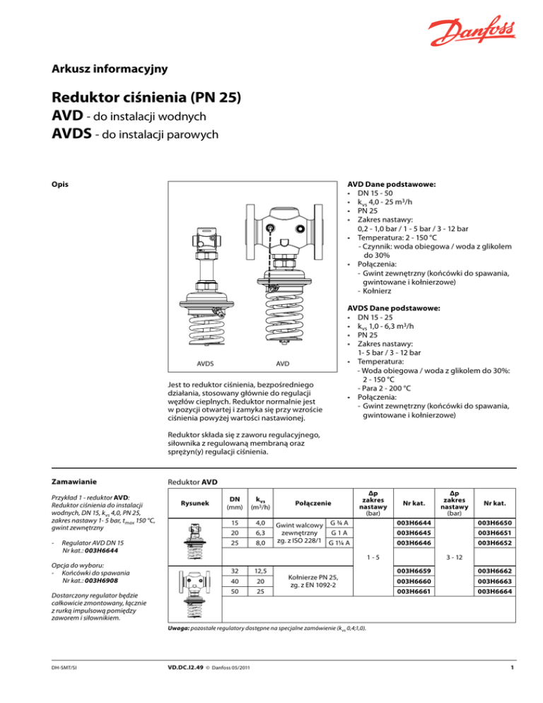 Arkusz informacyjny Reduktor ciśnienia (PN 25) AVD - do instalacji wodnych AVDS - do instalacji parowych Opis AVD Dane podstawowe: • DN 15 - 50 • k vs 4,0 - 25 m3/h • PN 25 • Zakres nastawy: 0,2 - 1,0 bar / 1 - 5 bar / 3 - 12 bar • Temperatura: 2 - 150 °C - Czynnik: woda obiegowa / woda z glikolem do 30% • Połączenia: - Gwint zewnętrzny (końcówki do spawania, gwintowane i kołnierzowe) - Kołnierz AVDS AVD Jest to reduktor ciśnienia, bezpośredniego działania, stosowany głównie do regulacji węzłów cieplnych. Reduktor normalnie jest w pozycji otwartej i zamyka się przy wzroście ciśnienia powyżej wartości nastawionej. Reduktor składa się z zaworu regulacyjnego, siłownika z regulowaną membraną oraz sprężyn(y) regulacji ciśnienia. Zamawianie Przykład 1 - reduktor AVD: Reduktor ciśnienia do instalacji wodnych, DN 15, k vs 4,0, PN 25, zakres nastawy 1- 5 bar, tmax 150 °C, gwint zewnętrzny - Regulator AVD DN 15 Nr kat.: 003H6644 Opcja do wyboru: - Końcówki do spawania Nr kat.: 003H6908 Dostarczony regulator będzie całkowicie zmontowany, łącznie z rurką impulsową pomiędzy zaworem i siłownikiem. AVDS Dane podstawowe: • DN 15 - 25 • k vs 1,0 - 6,3 m3/h • PN 25 • Zakres nastawy: 1- 5 bar / 3 - 12 bar • Temperatura: - Woda obiegowa / woda z glikolem do 30%: 2 - 150 °C - Para 2 - 200 °C • Połączenia: - Gwint zewnętrzny (końcówki do spawania, gwintowane i kołnierzowe) Reduktor AVD Rysunek DN (mm) k vs (m3/h) Połączenie 15 20 25 4,0 6,3 8,0 Gwint walcowy G ¾ A G1A zewnętrzny zg. z ISO 228/1 G 1¼ A Δp zakres nastawy (bar) Nr kat. 003H6644 003H6645 003H6646 1-5 32 12,5 40 20 50 25 Kołnierze PN 25, zg. z EN 1092-2 Δp zakres nastawy (bar) Nr kat. 003H6650 003H6651 003H6652 3 - 12 003H6659 003H6662 003H6660 003H6663 003H6661 003H6664 Uwaga: pozostałe regulatory dostępne na specjalne zamówienie (k vs 0,4;1,0). DH-SMT/SI VD.DC.I2.49 © Danfoss 05/2011 1 Arkusz informacyjny Reduktor ciśnienia AVD, AVDS (PN 25) Zamawianie (ciąg dalszy) Reduktor AVDS Przykład 2 - reduktor AVDS: Reduktor ciśnienia do instalacji parowych, DN 15, k vs 3,2, PN 25, zakres nastawy 1- 5 bar, tmax 200 °C, gwint zewnętrzny Rysunek DN (mm) 1,0 1,6 3,2 4,5 6,3 15 - Regulator AVDS DN 15 Nr kat.: 003H6667 20 25 Opcja do wyboru: - Rurka impulsowa zestaw AV 1⁄8” Nr kat.: 003H6852 - Końcówki do spawania Nr kat.: 003H6908 k vs (m3/h) Δp zakres nastawy (bar) Połączenie Gwint zewn. walcowy zg. z ISO 228/1 003H6665 003H6666 003H6667 003H6668 003H6669 G¾ A G1A G 1¼ A Δp zakres nastawy (bar) Nr kat. 1-5 3 - 12 Nr kat. 003H6670 003H6671 003H6672 003H6673 003H6674 Akcesoria Rysunek - Naczynie kondensacyjne Nr kat.: 003H0277 Oznaczenie elementu Końcówki do spawania Dostarczony regulator będzie całkowicie zmontowany. Zewnętrzna rurka impulsowa (AV) i naczynie kondensacyjne muszą być zamówione oddzielnie. Końcówki z gwintem zewnętrznym Kołnierz Rurka impulsowa zestaw AV DN 15 20 25 15 20 25 15 20 25 Połączenie R ½” R ¾” R 1” Gwint zewn. stożkowy zg. z EN 10226 -1 Kołnierze PN 25, zg. z EN 1092-2 Opis: - 1x rurka miedziana Ø6 × 1 × 1500 mm - 1x złączka zaciskowa* do rurki Nr kat. 003H6908 003H6909 003H6910 003H6902 003H6903 003H6904 003H6915 003H6916 003H6917 R 1⁄8” R 3⁄8” 003H6852 003H6853 R ½” 003H6854 * 10 sztuk złączek zaciskowych do rurek impulsowych, Ø6 × 1 mm R 1⁄8” * 10sztuk złączek zaciskowych do rurek impulsowych, Ø6 × 1 mm R 3⁄8” * 10 sztuk złączek zaciskowych do rurek impulsowych, Ø6 × 1 mm R ½” * 10 sztuk złączek zaciskowych do rurek impulsowych, Ø6 × 1 mm G 1⁄8” Zawór odcinający Ø6 mm Naczynie kondensacyjne 0,3 l, z dwoma zestawami złączek zaciskowych , Ø6 x 1 mm 003H6857 003H6858 003H6859 003H6931 003H0276 003H0277 * Złączka zaciskowa składa się z nypla, pierścienia uszczelniającego oraz nakrętki. Części zapasowe Rysunek Oznaczenie elementu Wkład zaworu* Dławica** Siłownik ze sprężyną nastawną DN 15 20 25 32 / 40 / 50 15 / 20 / 25 k vs (m3/h) 4,0 6,3 8,0 12,5 / 20 / 25 3,2 / 4,5 / 6,3 Nr kat. 003H6873 003H6874 003H6875 003H6876 003H6877 Δp zakres nastawy (bar) 1-5 Nr kat. 003H6844 3 - 12 003H6845 * tylko do reduktorów AVD ** tylko do reduktorów AVDS 2 VD.DC.I2.49 © Danfoss 05/2011 DH-SMT/SI Arkusz informacyjny Reduktor ciśnienia AVD, AVDS (PN 25) Dane techniczne Zawór (AVD) Średnica nominalna Wartość k vs Współczynnik kawitacji z * Ciśnienie nominalne Max. różnica ciśnień Czynnik pH czynnika Temperatura czynnika DN m3/h PN bar zawór Połączenia końcówki 15 4,0 20 6,3 25 8,0 32 12,5 40 20 50 25 ≥ 0,6 25 20 16 Woda obiegowa / woda z glikolem do 30% Min. 7, max. 10 2 …150 °C Gwint Kołnierz Do spawania, gwint zewnętrzny i kołnierz Materiał Brąz CuSn5ZnPb (Rg5) gwint Korpus zaworu kołnierz - Gniazdo zaworu Grzybek zaworu Uszczelnienie - Żeliwo sferoidalne EN-GJS-400-18-LT (GGG 40,3) Stal nierdzewna, nr 1.4571 Mosiądz CuZn36Pb2As EPDM * k v/k vs ≤ 0,5 dla DN 25 i większych Zawór (AVDS) Średnica nominalna Wartość k vs Współczynnik kawitacji z * Ciśnienie nominalne Max. różnica ciśnień Czynnik pH czynnika Temperatura czynnika DN m3/h PN bar zawór końcówki Połączenia Materiał Korpus zaworu Gniazdo zaworu Grzybek zaworu 1,0 15 1,6 20 25 3,2 4,5 6,3 ≥ 0,6 25 10 Para / Woda obiegowa / woda z glikolem do 30% Min. 7, max. 10 2 … 200 °C Gwint Do spawania, gwint zewnętrzny i kołnierz Brąz CuSn5ZnPb (Rg5) Stal nierdzewna, nr 1.4571 Stal nierdzewna, nr 1.4122 * k v/k vs ≤ 0,5 at DN 25 and higher Siłownik Powierzchnia robocza Ciśnienie nominalne cm2 PN Zakres nastawy różnicy ciśnień i kolory sprężyn bar 54 25 1-5 niebieski 3 - 12 czarny, zielony Materiał Obudowa siłownika Górna obudowa membrany Dolna obudowa membrany Membrana Rurka impulsowa DH-SMT/SI VD.DC.I2.49 © Danfoss 05/2011 Stal nierdzewna, nr 1.4301 Mosiądz CuZn36Pb2As EPDM Rurka miedziana Ø6 × 1 mm 3 Arkusz informacyjny Reduktor ciś