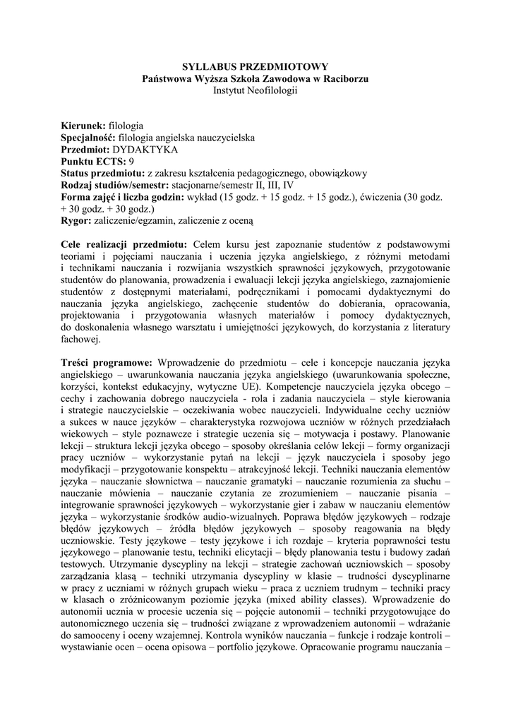 SYLLABUS PRZEDMIOTOWY Państwowa WyŜsza Szkoła Zawodowa w Raciborzu Instytut Neofilologii Kierunek: filologia Specjalność: filologia angielska nauczycielska Przedmiot: DYDAKTYKA Punktu ECTS: 9 Status przedmiotu: z zakresu kształcenia pedagogicznego, obowiązkowy Rodzaj studiów/semestr: stacjonarne/semestr II, III, IV Forma zajęć i liczba godzin: wykład (15 godz. + 15 godz. + 15 godz.), ćwiczenia (30 godz. + 30 godz. + 30 godz.) Rygor: zaliczenie/egzamin, zaliczenie z oceną Cele realizacji przedmiotu: Celem kursu jest zapoznanie studentów z podstawowymi teoriami i pojęciami nauczania i uczenia języka angielskiego, z róŜnymi metodami i technikami nauczania i rozwijania wszystkich sprawności językowych, przygotowanie studentów do planowania, prowadzenia i ewaluacji lekcji języka angielskiego, zaznajomienie studentów z dostępnymi materiałami, podręcznikami i pomocami dydaktycznymi do nauczania języka angielskiego, zachęcenie studentów do dobierania, opracowania, projektowania i przygotowania własnych materiałów i pomocy dydaktycznych, do doskonalenia własnego warsztatu i umiejętności językowych, do korzystania z literatury fachowej. Treści programowe: Wprowadzenie do przedmiotu – cele i koncepcje nauczania języka angielskiego – uwarunkowania nauczania języka angielskiego (uwarunkowania społeczne, korzyści, kontekst edukacyjny, wytyczne UE). Kompetencje nauczyciela języka obcego – cechy i zachowania dobrego nauczyciela - rola i zadania nauczyciela – style kierowania i strategie nauczycielskie – oczekiwania wobec nauczycieli. Indywidualne cechy uczniów a sukces w nauce języków – charakterystyka rozwojowa uczniów w róŜnych przedziałach wiekowych – style poznawcze i strategie uczenia się – motywacja i postawy. Planowanie lekcji – struktura lekcji języka obcego – sposoby określania celów lekcji – formy organizacji pracy uczniów – wykorzystanie pytań na lekcji – język nauczyciela i sposoby jego modyfikacji – przygotowanie konspektu – atrakcyjność lekcji. Techniki nauczania elementów języka – nauczanie słownictwa – nauczanie gramatyki – nauczanie rozumienia za słuchu – nauczanie mówienia – nauczanie czytania ze zrozumieniem – nauczanie pisania – integrowanie sprawności językowych – wykorzystanie gier i zabaw w nauczaniu elementów języka – wykorzystanie środków audio-wizualnych. Poprawa błędów językowych – rodzaje błędów językowych – źródła błędów językowych – sposoby reagowania na błędy uczniowskie. Testy językowe – testy językowe i ich rozdaje – kryteria poprawności testu językowego – planowanie testu, techniki elicytacji – błędy planowania testu i budowy zadań testowych. Utrzymanie dyscypliny na lekcji – strategie zachowań uczniowskich – sposoby zarządzania klasą – techniki utrzymania dyscypliny w klasie – trudności dyscyplinarne w pracy z uczniami w róŜnych grupach wieku – praca z uczniem trudnym – techniki pracy w klasach o zróŜnicowanym poziomie języka (mixed ability classes). Wprowadzenie do autonomii ucznia w procesie uczenia się – pojęcie autonomii – techniki przygotowujące do autonomicznego uczenia się – trudności związane z wprowadzeniem autonomii – wdraŜanie do samooceny i oceny wzajemnej. Kontrola wyników nauczania – funkcje i rodzaje kontroli – wystawianie ocen – ocena opisowa – portfolio językowe. Opracowanie programu nauczania – program i jego rodzaje – treści programu nauczania – wybór programu nauczania – program autorski. Wybór materiałów nauczania i pomocy naukowych – kryteria wyboru podręcznika – ocena materiałów nauczania (podręczniki kursowe, zeszyty ćwiczeń, materiały uzupełniające) – rodzaje pomocy naukowych – kryteria doboru pomocy – wykorzystanie materiałów autentycznych, ich adaptacja i przygotowanie ćwiczeń. Metody nauczania – metody konwencjonalne ( bezpośrednia, gramatyczno-tłumaczeniowa, audiolingwalna, kognitywna) – metody niekonwencjonalne ( TPR, The Silent Way, CLL, naturalna, Sugestopedia) – kryteria wyboru najlepszej metody. Wczesnoszkolne nauczanie języka angielskiego – koncepcje i cele wczesnoszkolnego nauczania języków obcych – fizyczny i psychiczny rozwój dziecka i jego implikacje w nauczaniu języka – metodyczne załoŜenia wczesnoszkolnego nauczania języka angielskiego – metody i techniki uczenia języka angielskiego w kształceniu zintegrowanym – wykorzystanie tekstów narracyjnych we wczesnoszkolnym nauczaniu języka angielskiego – wykorzystanie projektów w nauczaniu zintegrowanym – kształcenie umiejętności plastycznotechnicznych w kształceniu zintegrowanym – organizacja klasy. Ocena i samoocena nauczyciela – dbanie o własny rozwój zawodowy – autoobserwacja i refleksja. Literatura podstawowa: Brewster, J., G. Ellis and D. Gerard, The Primary English Teacher’s Guide. Penguin English, London 2005, Edge J., Mistakes and Correction, Longman, London 1989, Halliwell S., Teaching English In the Primary Classroom, Longman, London 1992, Harmer J., (3rd ed.) The Practice of English Language Teaching, Longman, Harlow 2001, Hughes A., Testing for Language Teachers, CUP, Cambridge 1988, Iluk J., Jak uczyć małe dzieci języków obcych?, Wydawnictwo Gnome, Katowice 2002, Komorowska H., Sprawdzanie umiejętności w nauce języka obcego,. Wydawnictwo Fraszka Edukacyjna, Warszawa 2005, Lewis M., Practical Techniques, LTP, London 1992, Richards J., Reflective teaching, CUP, New York 1995, Richards J., Rodgers T., Approaches and Methods in Language Teaching, CUP, New York 2001, Scrivener J., Learning Teaching: A Guidebook for English Language Teachers, Heinemann, Oxford 1994, Tanner R., Tasks for Language Teachers, Longman, London 1998, Ur P., A Course in Language Teaching: practice and theory, CUP, Cambridge 1996. Literatura uzupełniająca: Pamuła M., Metodyka nauczania języków obcych w systemie 