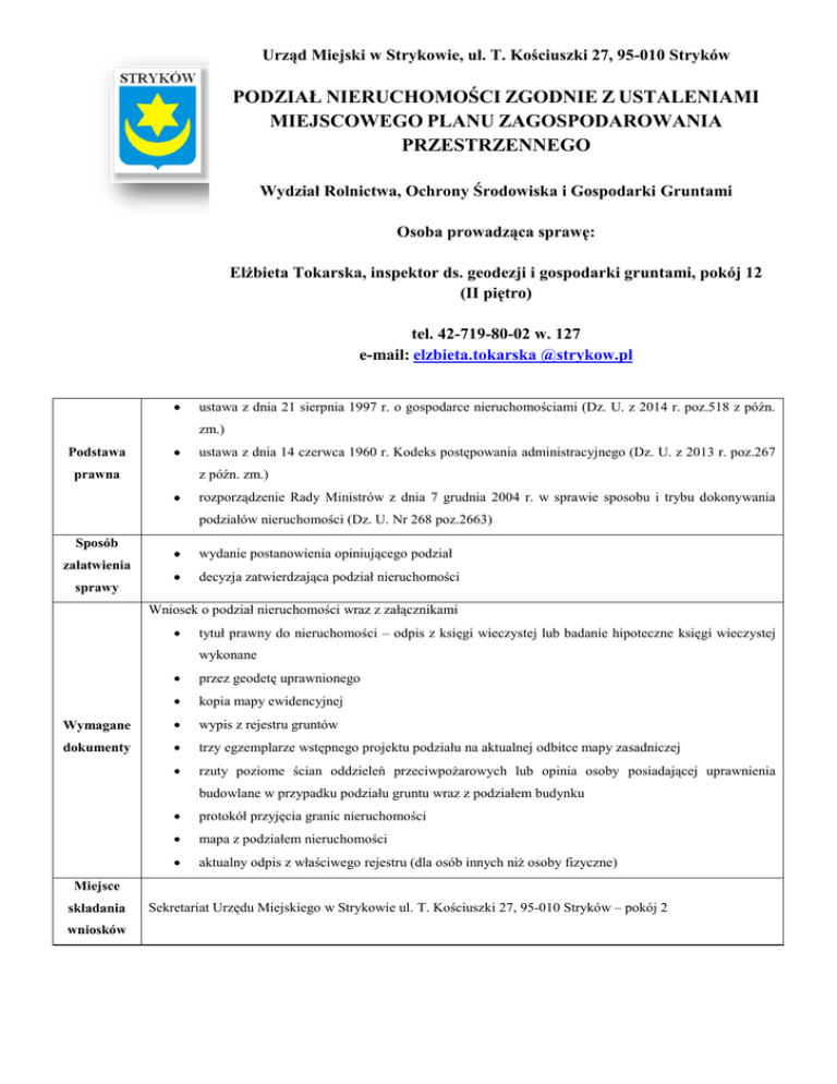 Urząd Miejski w Strykowie, ul. T. Kościuszki 27, 95-010 Stryków PODZIAŁ NIERUCHOMOŚCI ZGODNIE Z USTALENIAMI MIEJSCOWEGO PLANU ZAGOSPODAROWANIA PRZESTRZENNEGO Wydział Rolnictwa, Ochrony Środowiska i Gospodarki Gruntami Osoba prowadząca sprawę: Elżbieta Tokarska, inspektor ds. geodezji i gospodarki gruntami, pokój 12 (II piętro) tel. 42-719-80-02 w. 127 e-mail: elzbieta.tokarska @strykow.pl ustawa z dnia 21 sierpnia 1997 r. o gospodarce nieruchomościami (Dz. U. z 2014 r. poz.518 z późn. zm.) Podstawa ustawa z dnia 14 czerwca 1960 r. Kodeks postępowania administracyjnego (Dz. U. z 2013 r. poz.267 z późn. zm.) prawna rozporządzenie Rady Ministrów z dnia 7 grudnia 2004 r. w sprawie sposobu i trybu dokonywania podziałów nieruchomości (Dz. U. Nr 268 poz.2663) Sposób załatwienia sprawy wydanie postanowienia opiniującego podział decyzja zatwierdzająca podział nieruchomości Wniosek o podział nieruchomości wraz z załącznikami tytuł prawny do nieruchomości – odpis z księgi wieczystej lub badanie hipoteczne księgi wieczystej wykonane przez geodetę uprawnionego kopia mapy ewidencyjnej Wymagane wypis z rejestru gruntów dokumenty trzy egzemplarze wstępnego projektu podziału na aktualnej odbitce mapy zasadniczej rzuty poziome ścian oddzieleń przeciwpożarowych lub opinia osoby posiadającej uprawnienia budowlane w przypadku podziału gruntu wraz z podziałem budynku protokół przyjęcia granic nieruchomości mapa z podziałem nieruchomości aktualny odpis z właściwego rejestru (dla osób innych niż osoby fizyczne) Miejsce składania wniosków Sekretariat Urzędu Miejskiego w Strykowie ul. T. Kościuszki 27, 95-010 Stryków – pokój 2 Termin udzielania wydanie postanowienia opiniującego podział nieruchomości – 1 miesiąc od dnia złożenia wniosku wydanie decyzji zatwierdzającej podział nieruchomości -1 miesiąc od daty złożenia mapy podziału nieruchomości przyjętej do państwowego zasobu geodezyjnego i kartograficznego w Starostwie odpowiedzi Powiatowym w Zgierzu Tryb Dwuetapowo: udzielania I etap - wydanie postanowienia opiniującego podział odpowiedzi II etap – wydanie decyzji zatwierdzającej podział Tryb odwoławczy Za pośrednictwem Burmistrza Strykowa do Samorządowego Kolegium Odwoławczego w Łodzi (ul. Piotrkowska 86): na postanowienie służy stronie złożenie zażalenia w terminie 7 dni od daty otrzymania postanowienia od decyzji służy stronie złożenie odwołania w terminie 14 dni od daty otrzymania decyzji Uwagi Brak Opłaty Nie podlega opłacie skarbowej Załączniki Wzór wniosku o podział nieruchomości zgodnie z ustaleniami planu zagospodarowania przestrzennego